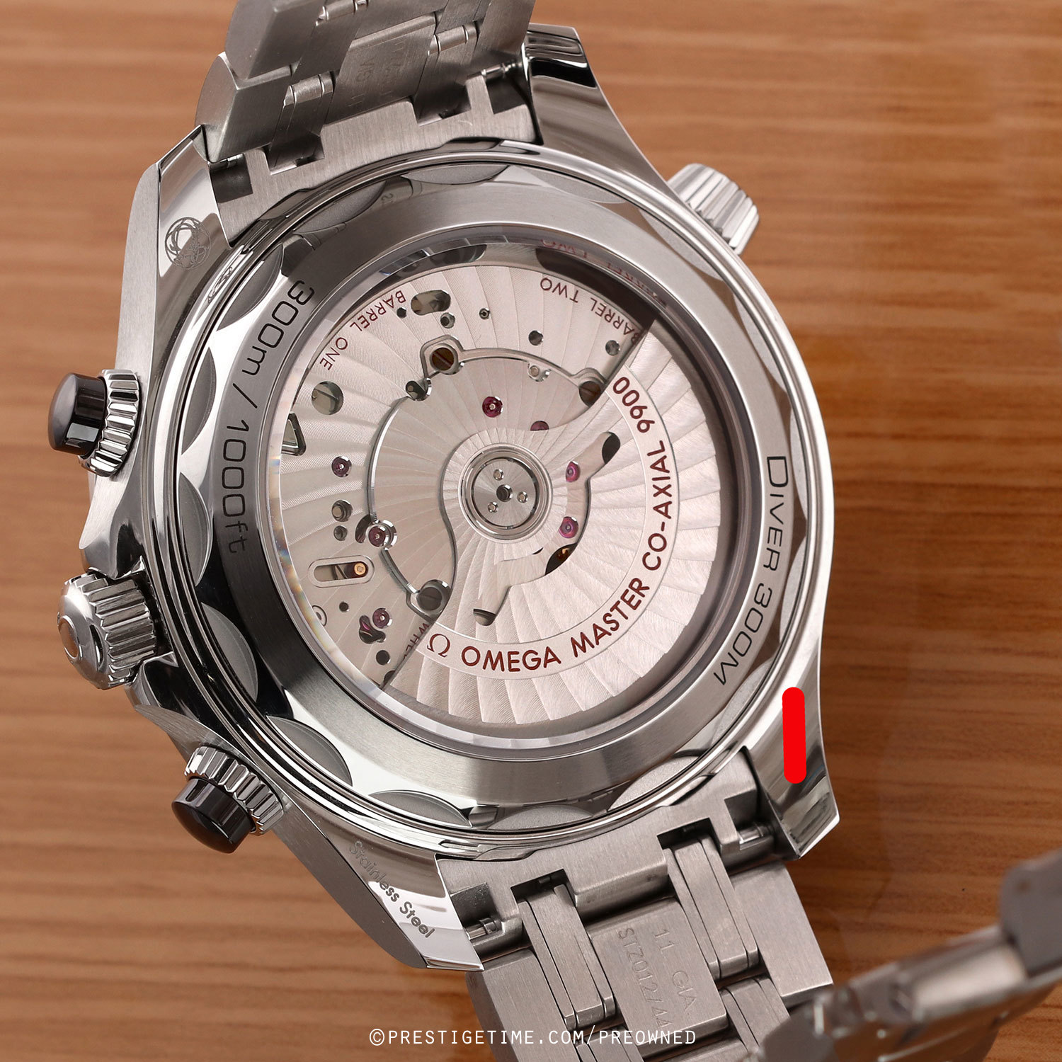 Movement: Powered by a self-winding METAS certified Omega caliber 9900, beats at 25,200 vph (3.5Hz), contains 54 jewels & has an approximate power reserve of 60 hours. The METAS certification tests water resistance, precision and magnetic resistance up to 15,000 gauss. The movement also features Omega's Si14 silicon balance spring and Omegas Co-Axial escapement. The rotor & visible bridges are decorated with Geneva waves in arabesque.