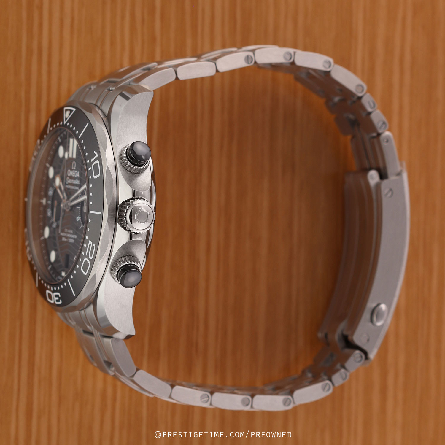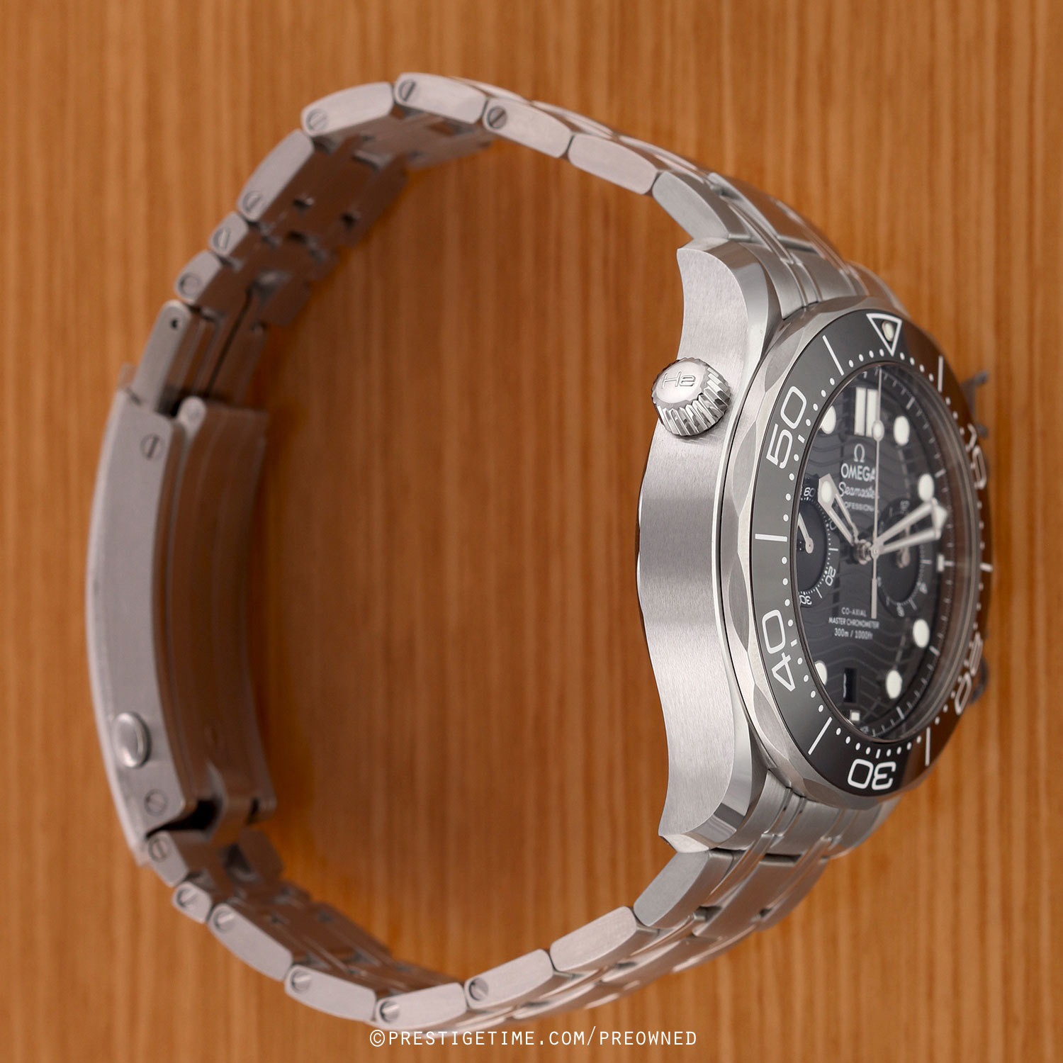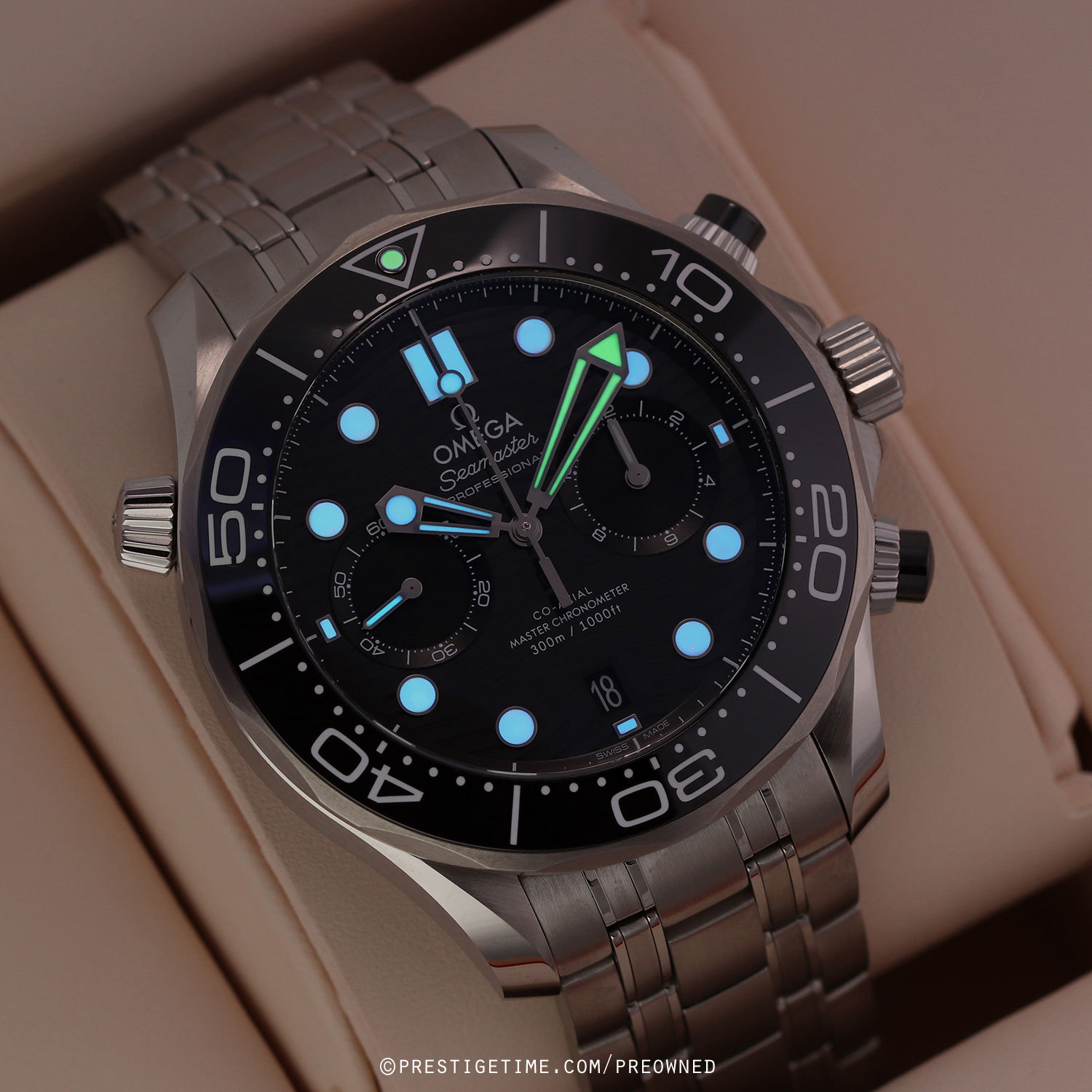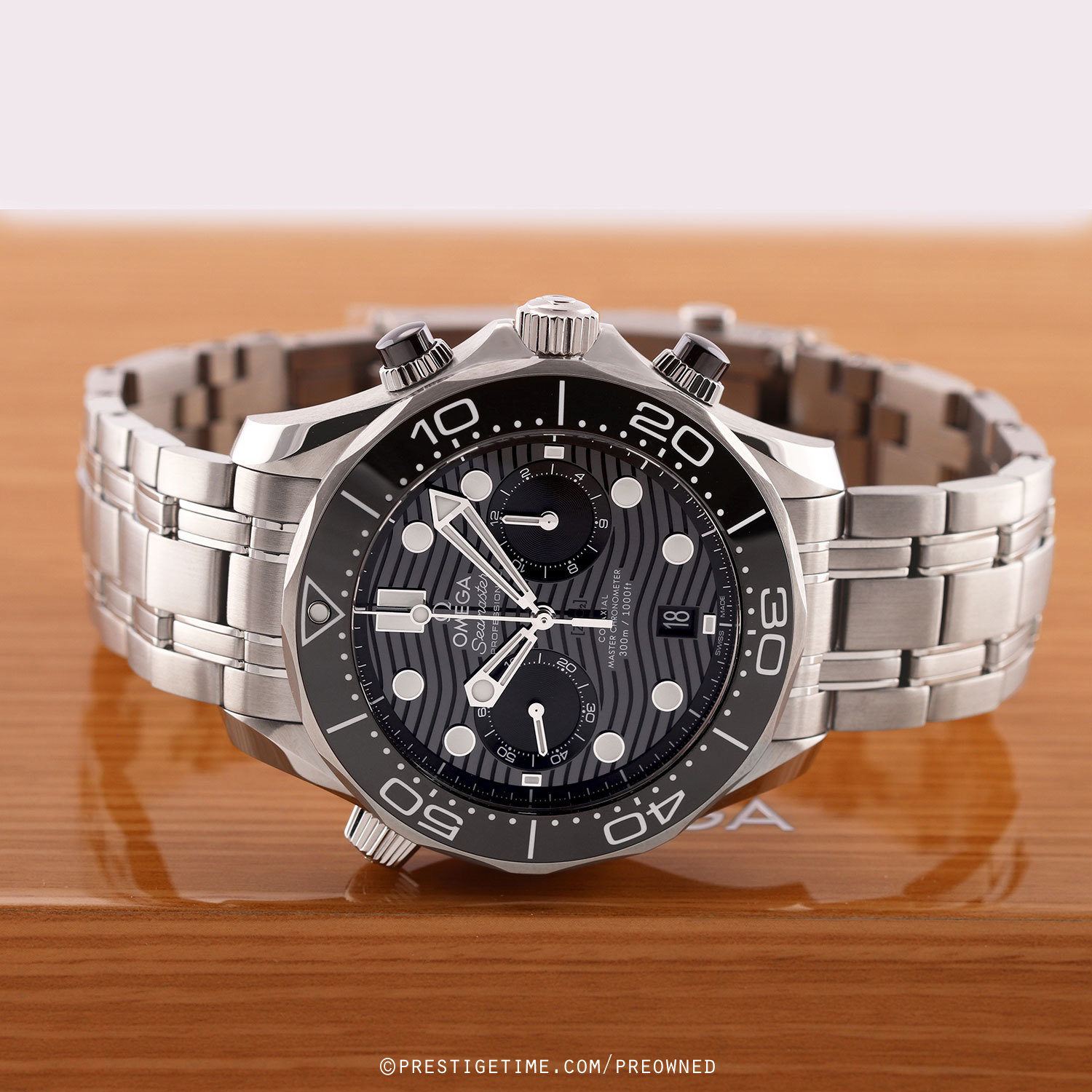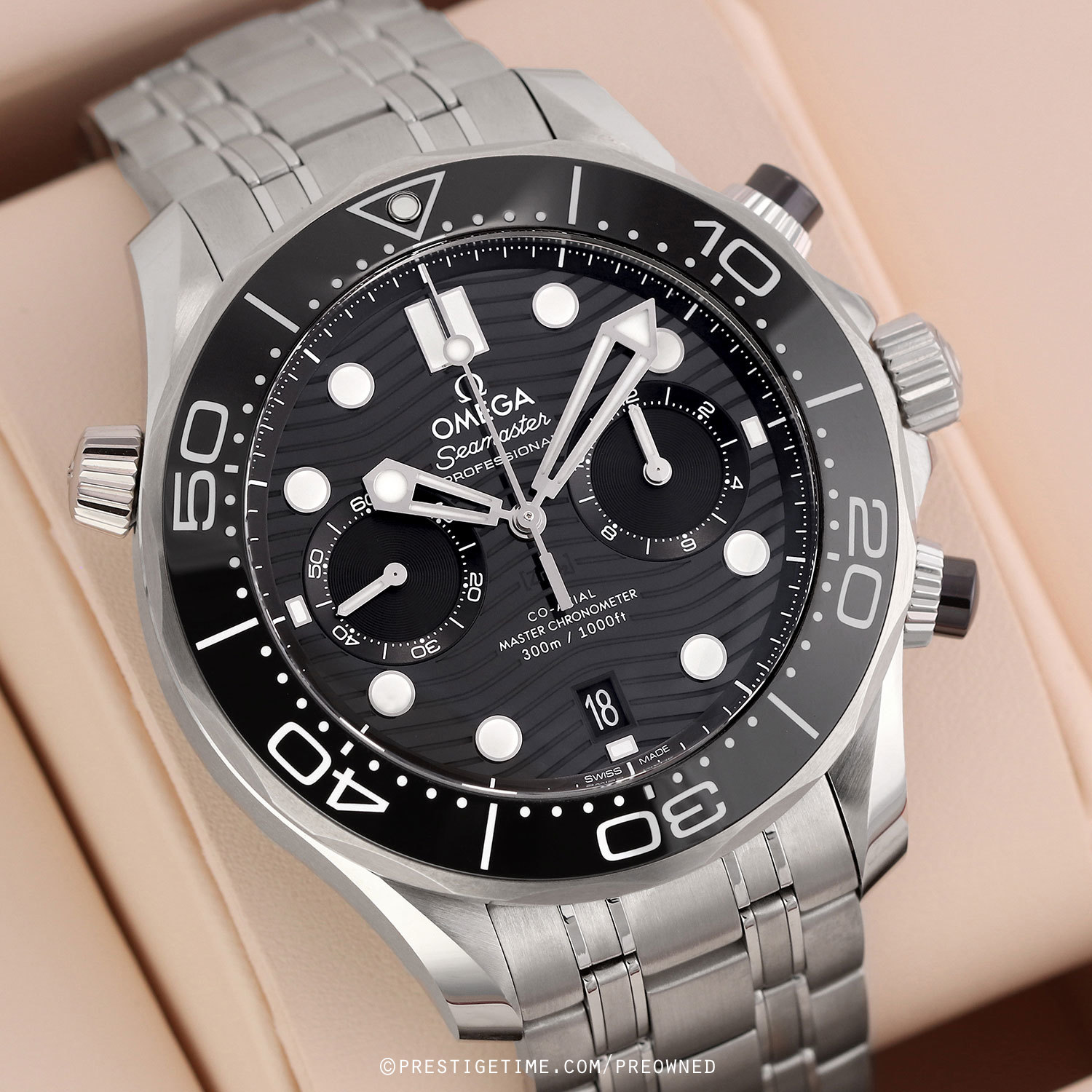 Case: Brushed stainless steel case with polished beveled corners. Helium escape valve at 10 o'clock. Stainless steel bezel with a polished black ceramic insert featuring a white enamel filled diving scale with a luminous dot at the starting point. Glossy black zirconium oxide [ZrO2] ceramic dial with a laser engraved wave design. Polished hands with luminous fill. Applied polished hour markers with luminous fill. Fine printed minute/seconds & fractions of a second track. Date window at 6 o'clock. Small seconds sub-dial located at 9 o'clock.