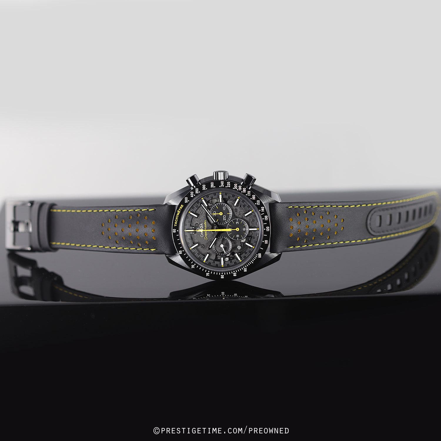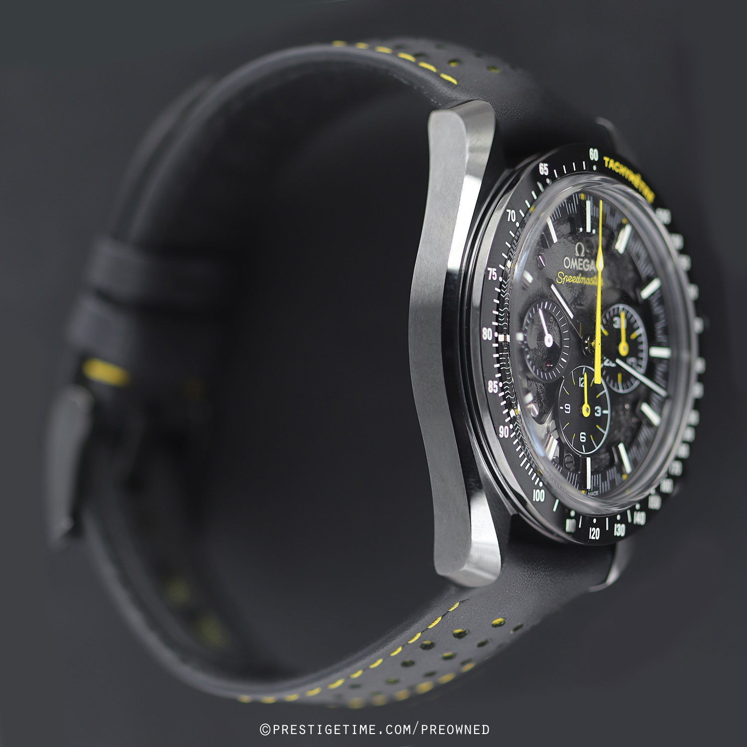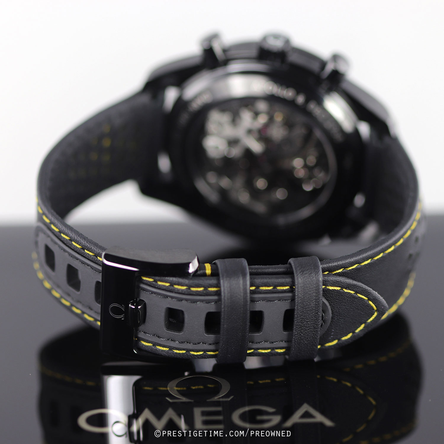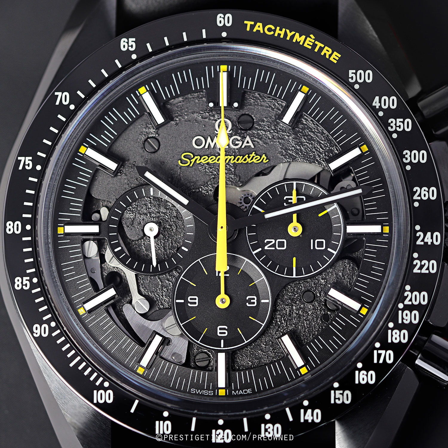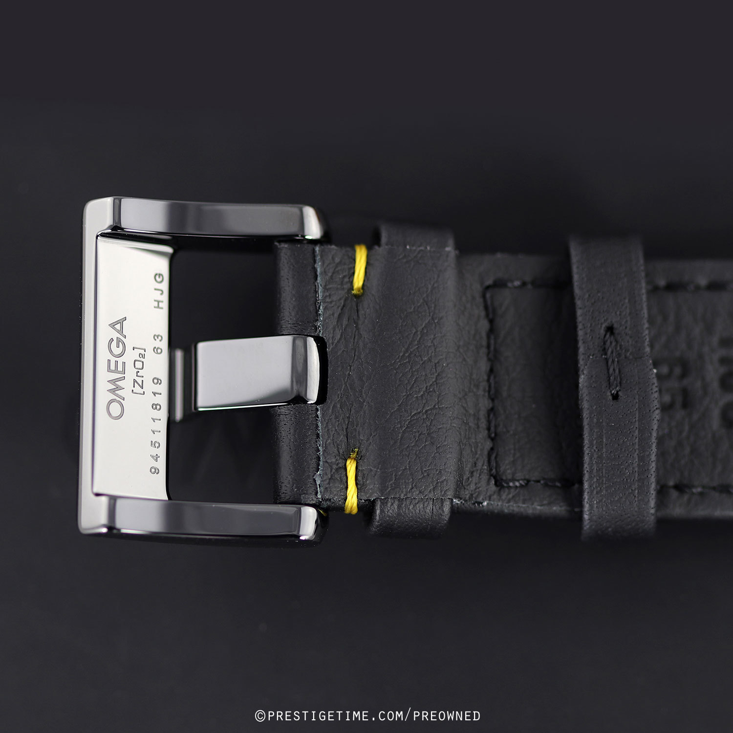 Case: Brushed & polished black ceramic case. Polished black ceramic bezel engraved & luminous filled tachymeter scale. Polished black ceramic crown with an engraved & luminous filled Omega logo. Polished black ceramic chronograph buttons. Skeletonized main dial. Black dial flange & sub-dials. Applied blackened index hour markers with luminous fill and printed minute/seconds & fractions of a second track. Blackened hour & minute hands with luminous fill. Small seconds sub-dial with white hand located at the 9 o'clock position.