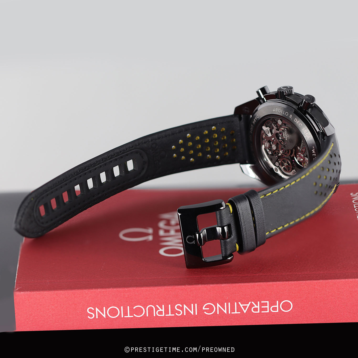 - The case back is engraved with APOLLO 8, DEC 1968, DARK SIDE OF THE MOON & “WE’LL SEE YOU ON THE OTHER SIDE” which were astronoauts' Jim Lovell’s final words spoken to ground control just before the Apollo 8 traveled to the far side of the moon.