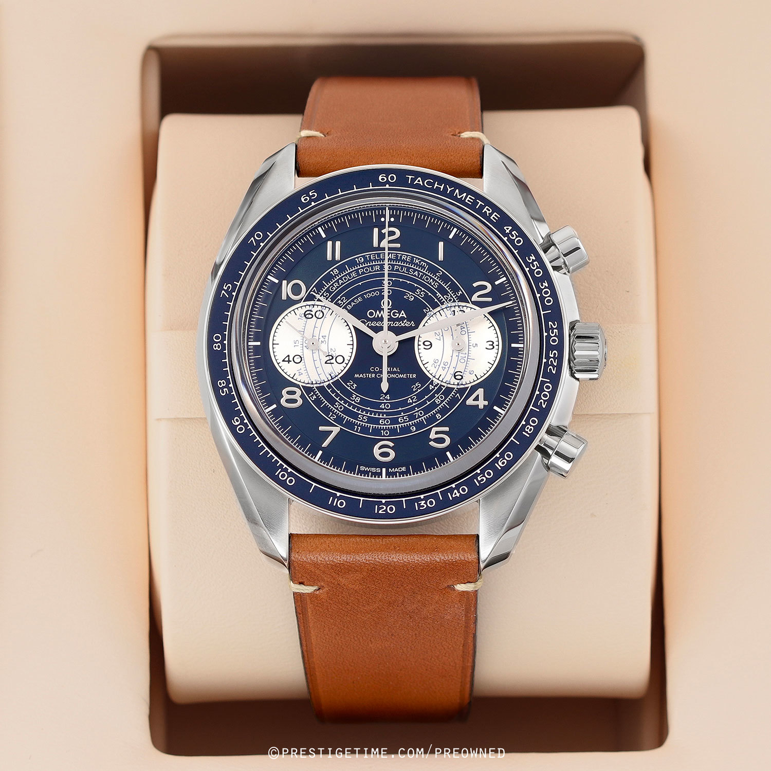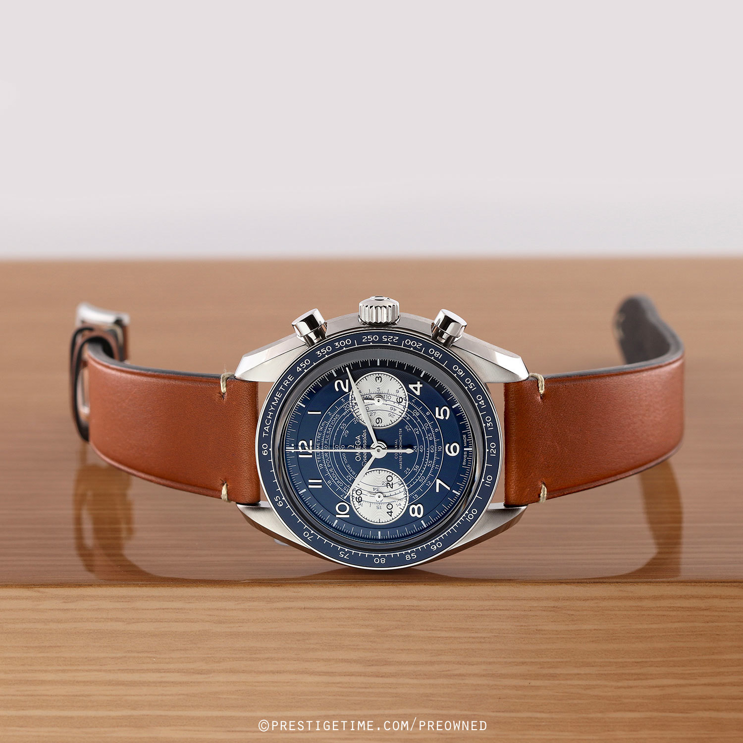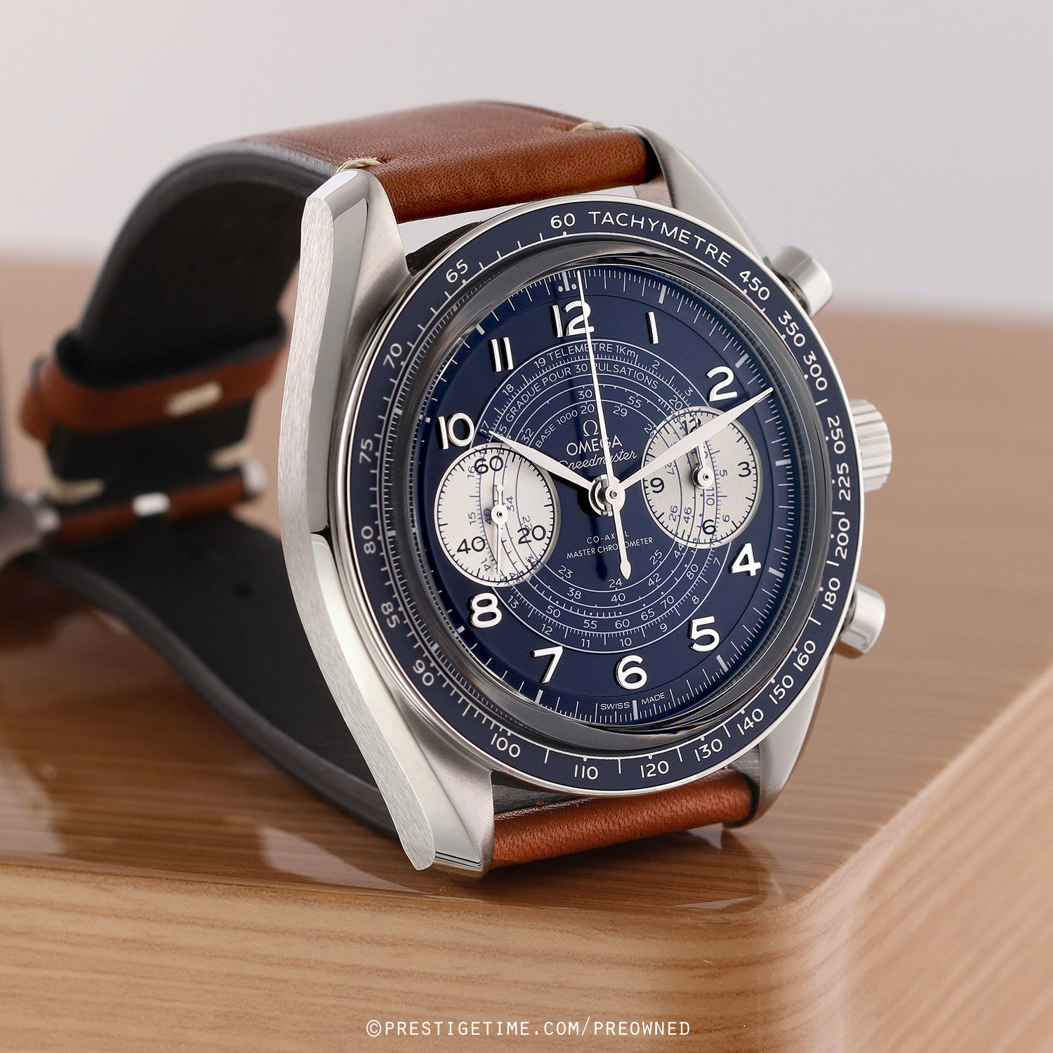 Case: Brushed & polished finished stainless steel case. Blue anodized aluminium fixed-position bezel with a tachymeter scale. Blue dial, silver sub-dials. Polished hands. Applied polished numeral hour markers. Fine printed central secondary tachymeter, pulsometer & telemeter scales. Fine printed minutes/seconds & fractions of a second track on the dial perimeter. Small seconds sub-dial at 9 o'clock.
