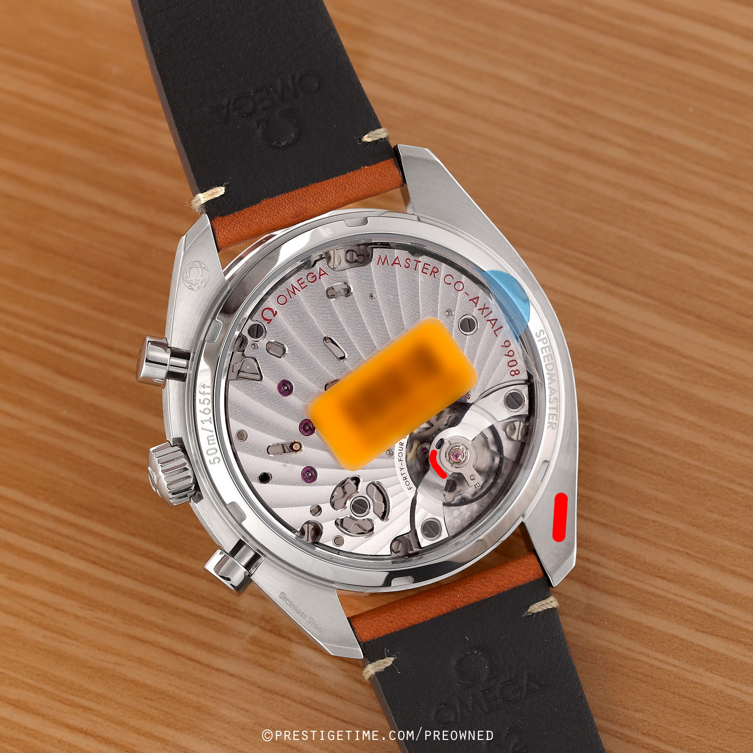 Movement: Powered by an Omega manual winding calibre Master Co-Axial 9908, beats at 28,800 vph (4Hz), contains 44 jewels & power reserve of +/- 60 hours. The movement is a Swiss Federal Institute of Metrology (METAS) certified Master-Chronometer. The METAS certification tests water resistance, precision and magnetic resistance to 15,000 gauss. Features Omega's Si14 silicon balance spring & Omega's Co-Axial Escapement. The back-plate is rhodium plated & decorated with Geneva waves in arabesque design.