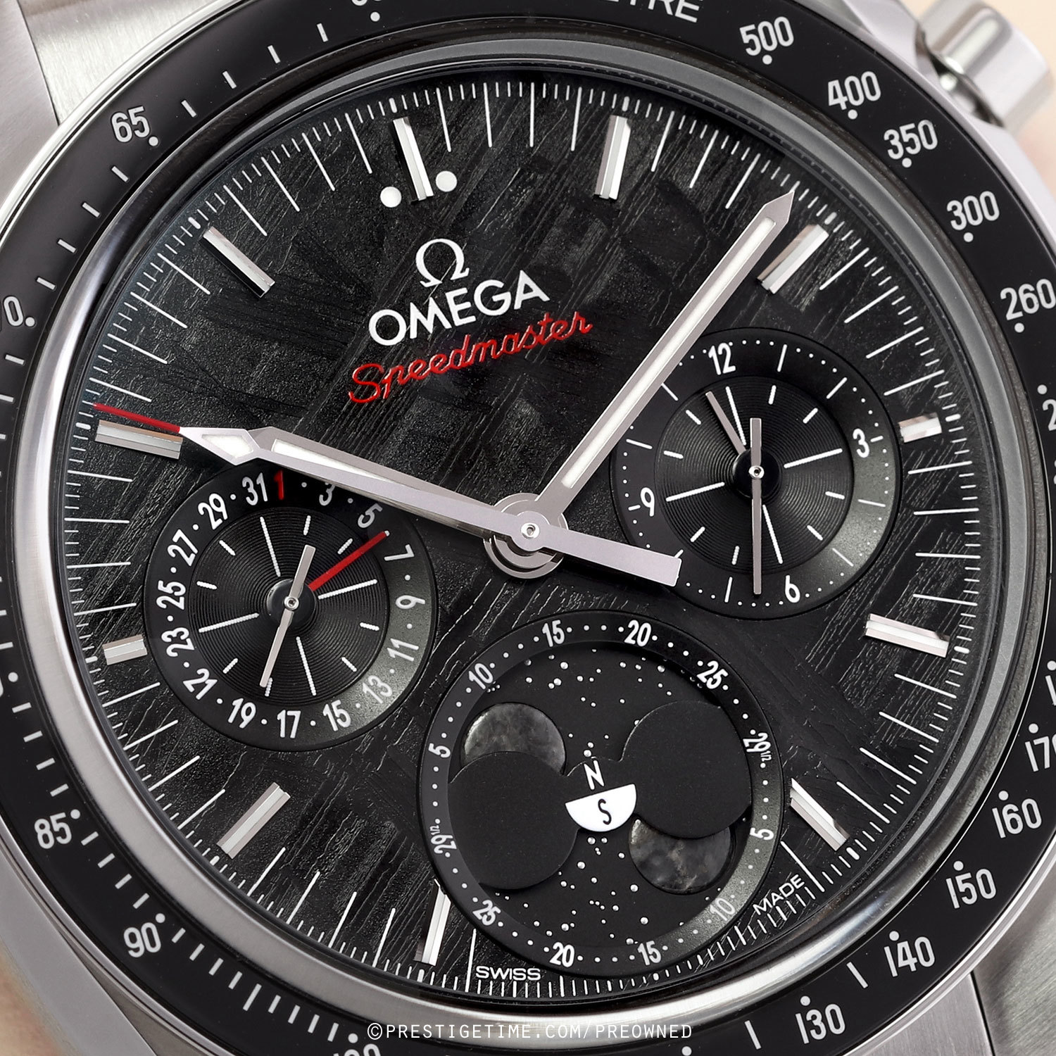 Case: Brushed & polished stainless steel case. Polished black ceramic bezel-insert with a Tachymetre scale. PVD black coated meteorite main dial, solid black sub-dials. Polished time related hands, the central hands with luminous fill. Applied polished faceted index hour markers with luminous fill. Fine printed minute/seconds & fractions of a second track. The 9 o'clock sub-dial displays a small seconds hand at the center & a date (red hand) on the perimeter.