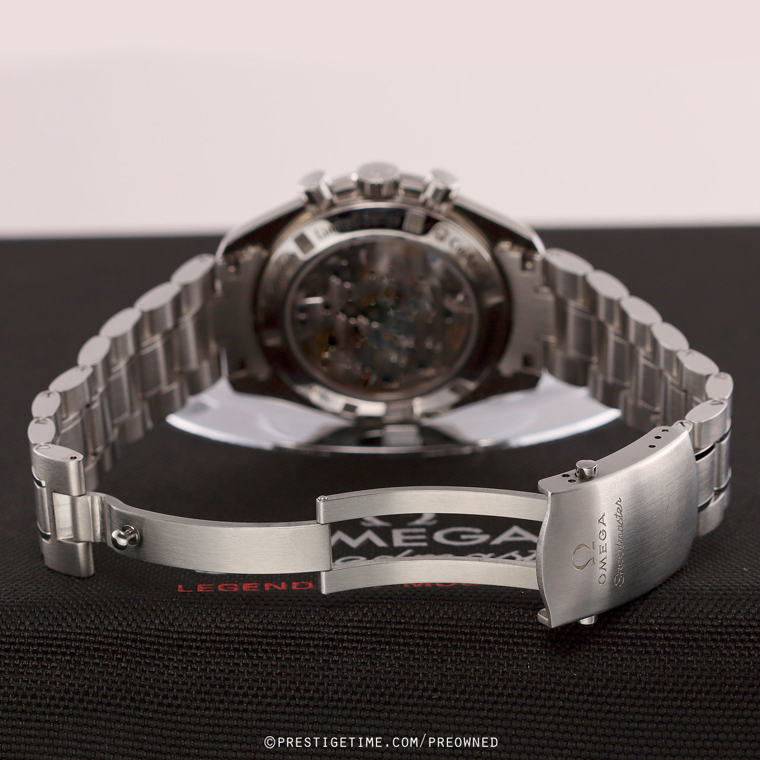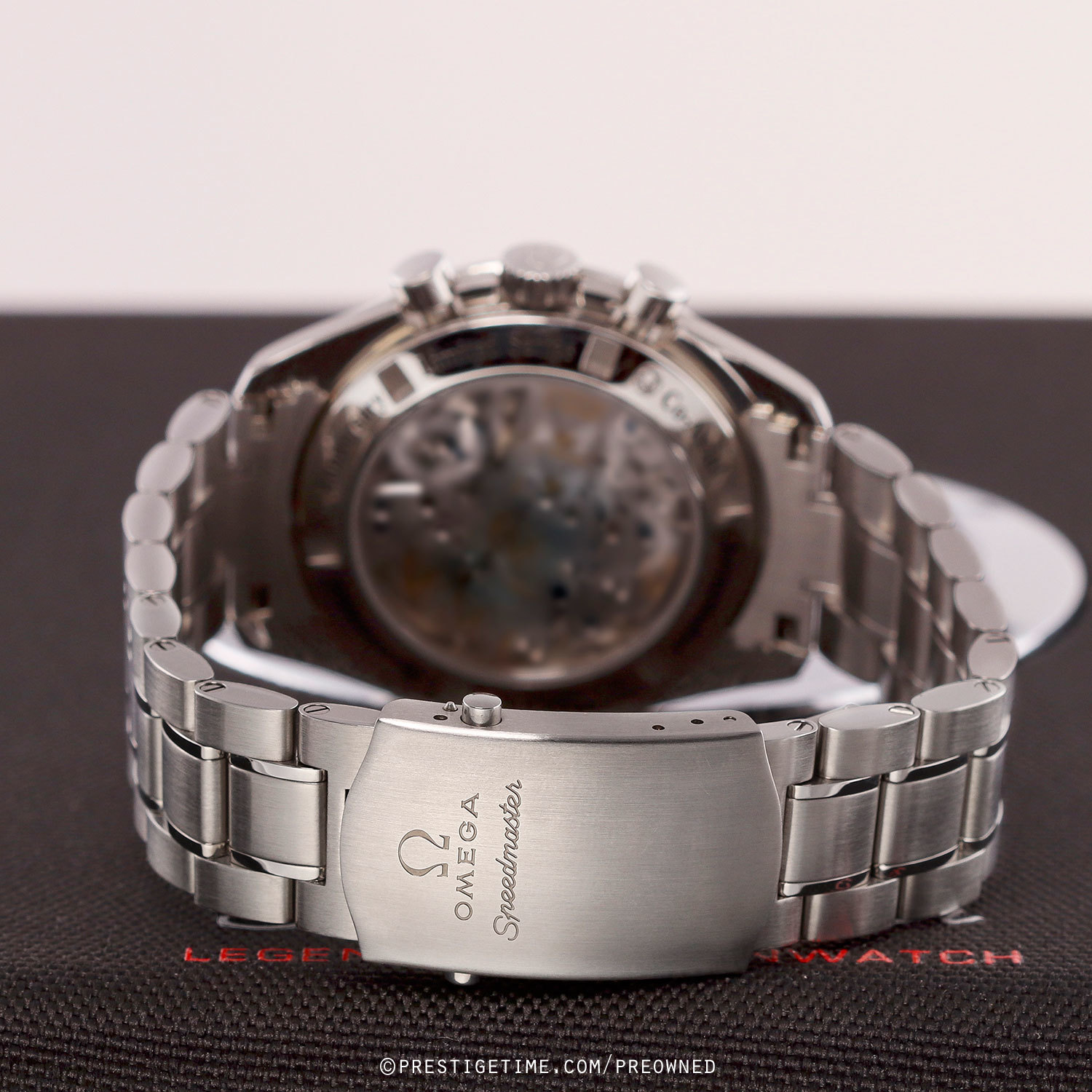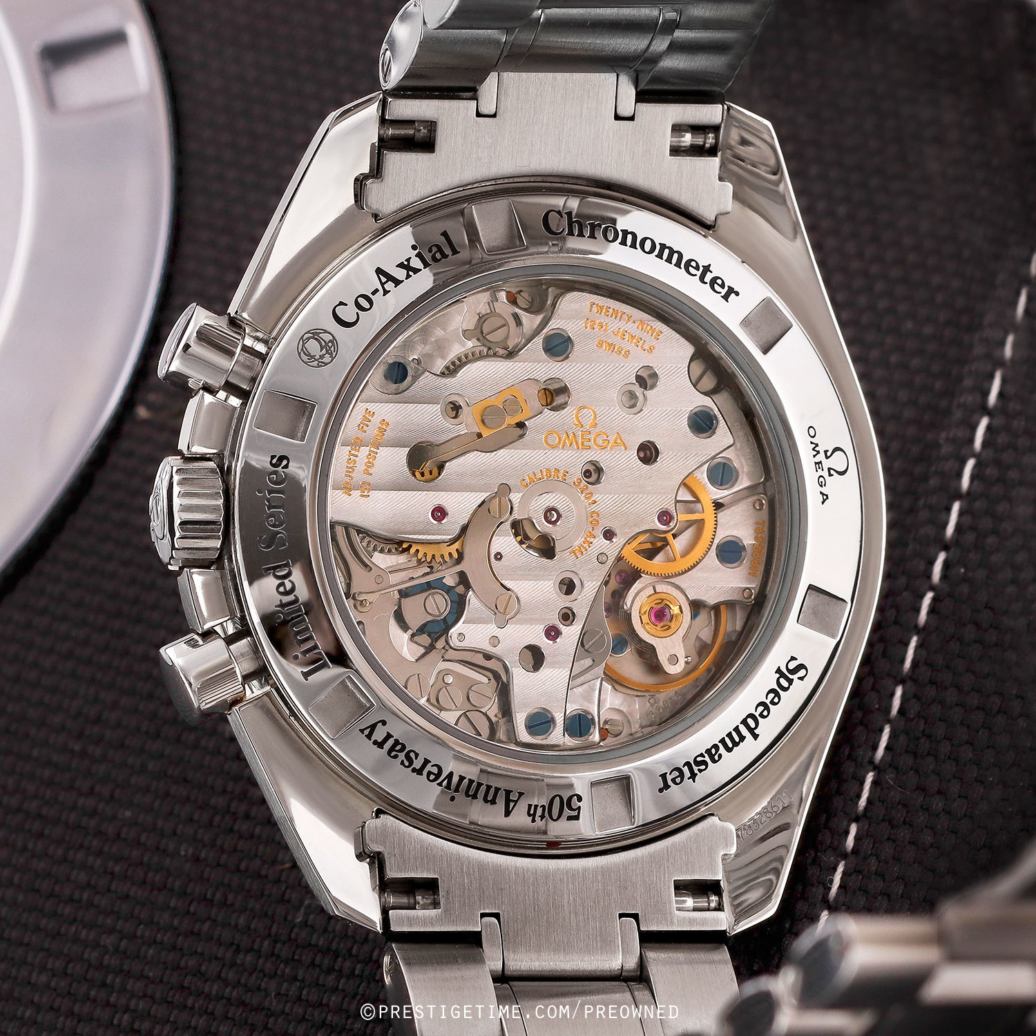 - The transparent case back is engraved "Ω OMEGA - Speedmaster - 50th Anniversary - Limited Series - Co-Axial - Chronometer".