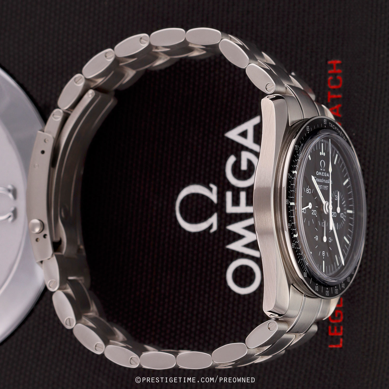 - The box: The original box to this watch was lost/misplaced. It should have been delivered in a special commemorative wooden box set with an additional strap & a tool set. In its place the watch will be delivered with a replacement Speedmaster box, containing: