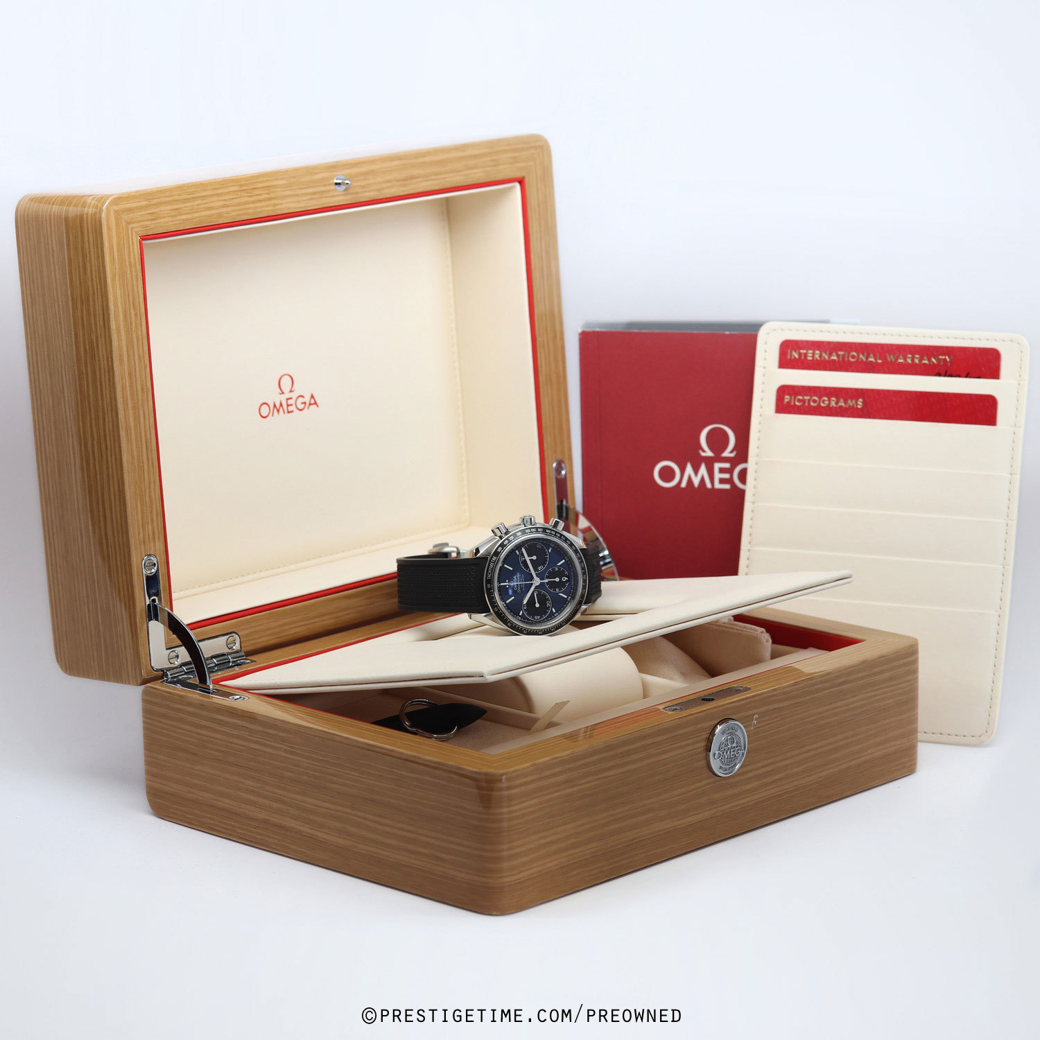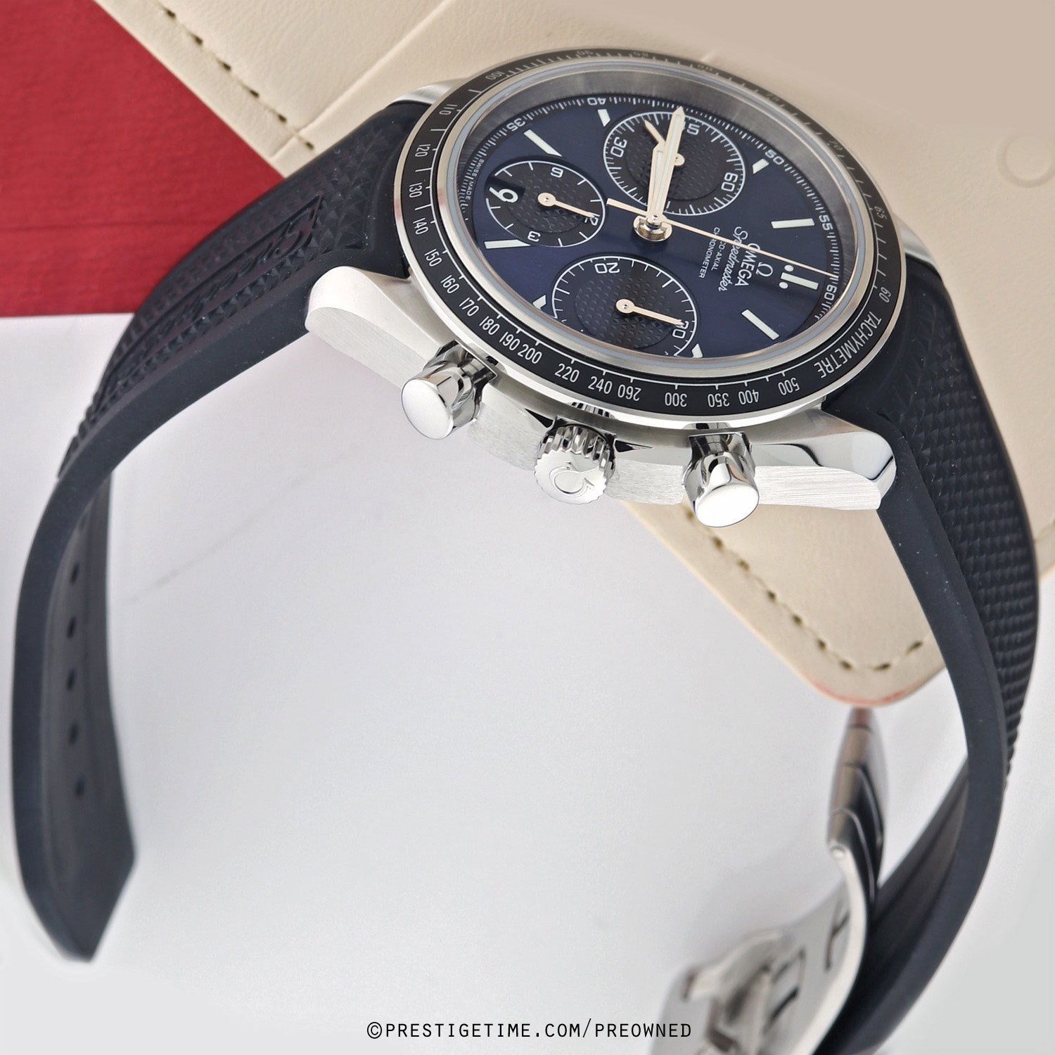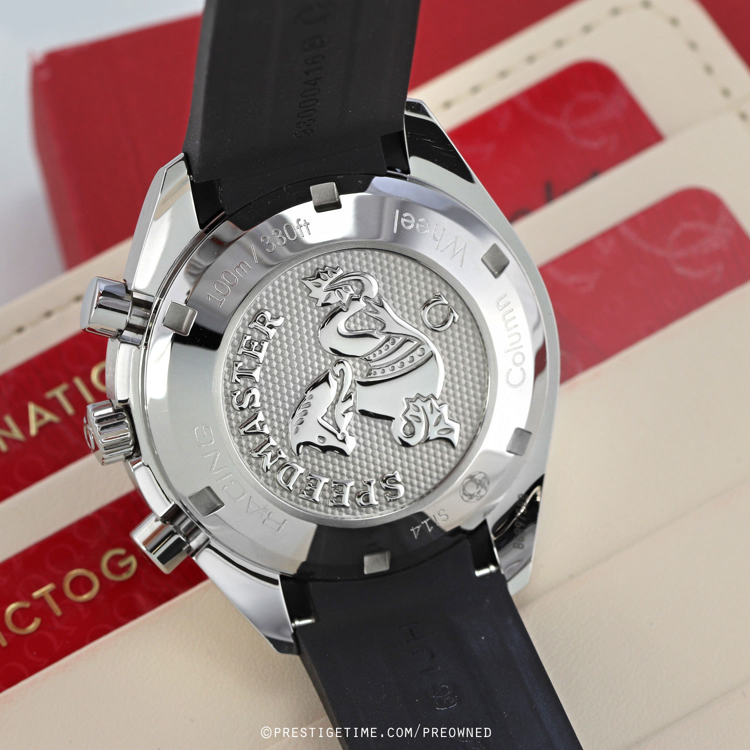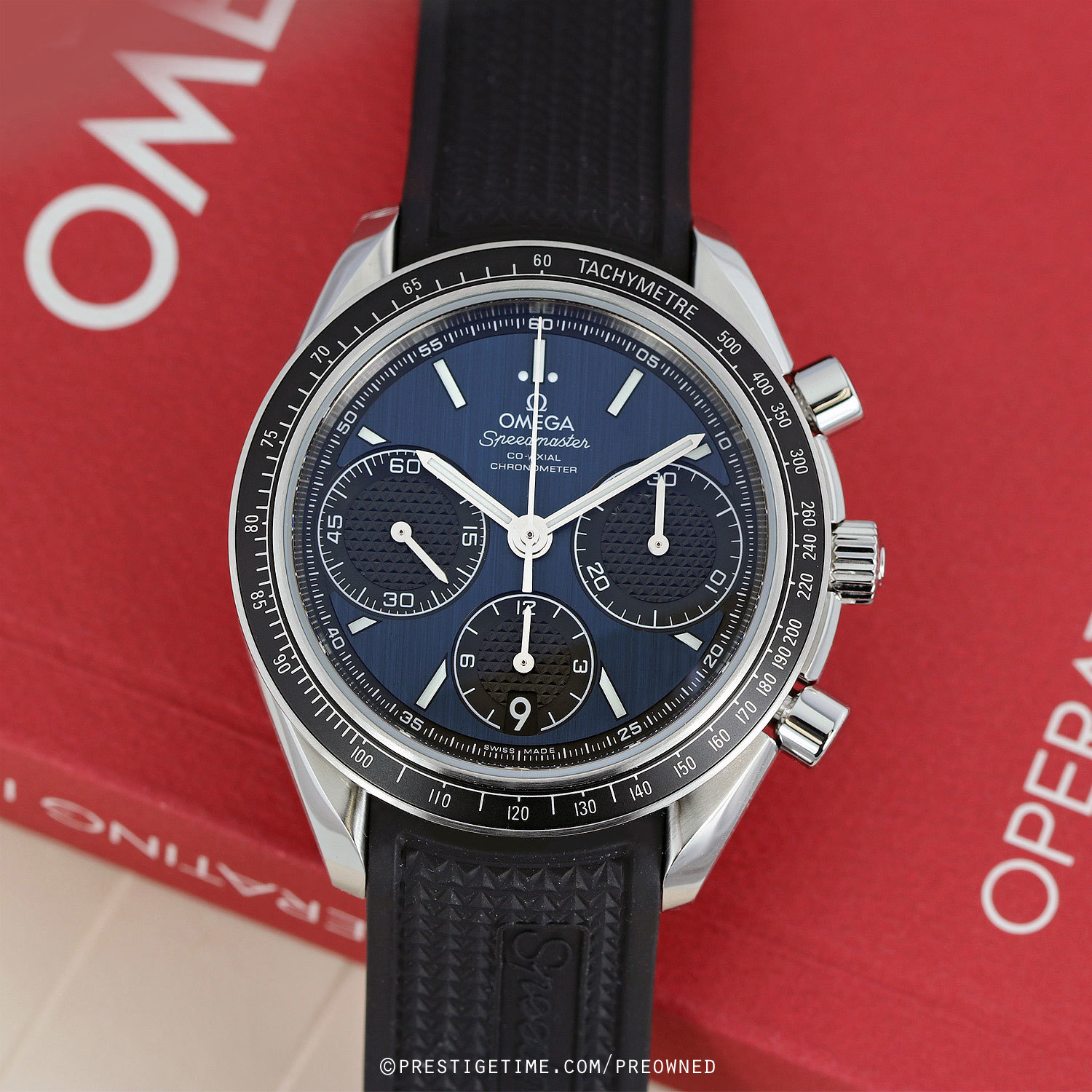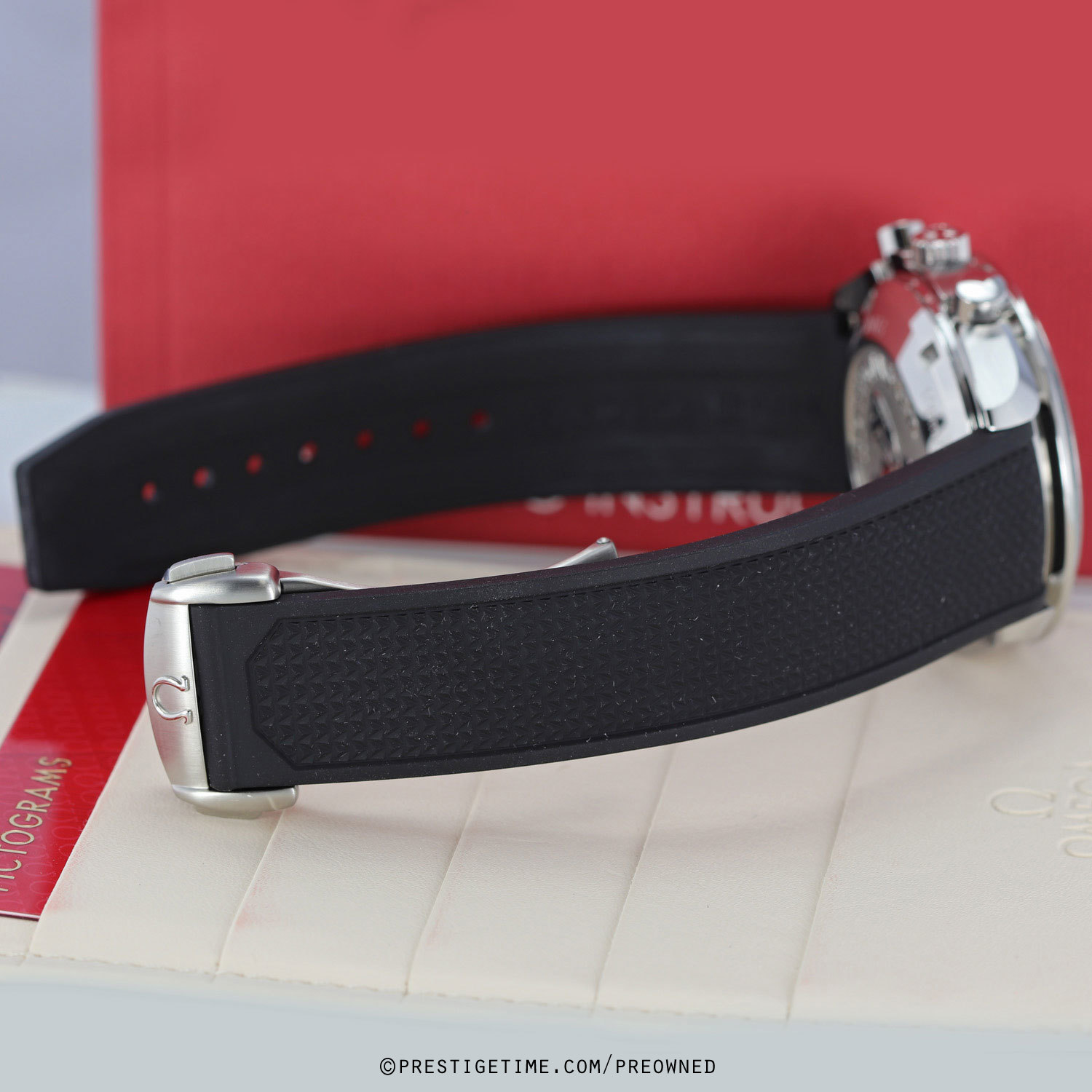 Strap: Fitted on its original 'Speedmaster' branded black rubber strap with push-button fold-over clasp. The rubber strap is in close to immaculate condition, with very little signs of wear noticeable.