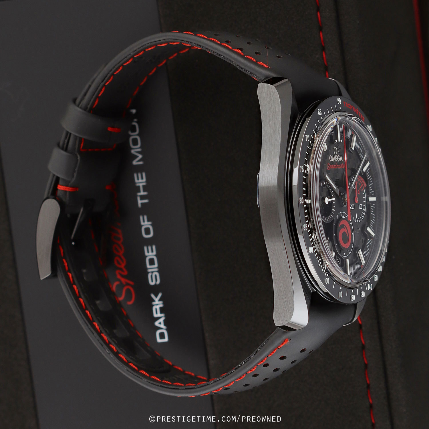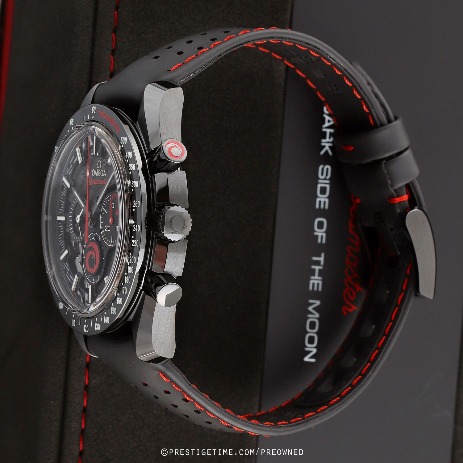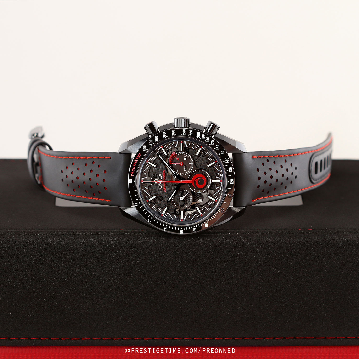Case: Brushed & polished black ceramic case. Polished black ceramic bezel engraved & luminous filled tachymeter scale. Polished black ceramic crown & chrono buttons, the crown with an engraved & luminous filled Omega logo. Skeletonized main dial. Black dial flange & sub-dials rims. Black hour & minute hands with luminous fill. Applied black index hour markers with luminous fill and printed minute/seconds & fractions of a second track. Small seconds sub-dial with white hand located at the 9 o'clock position.