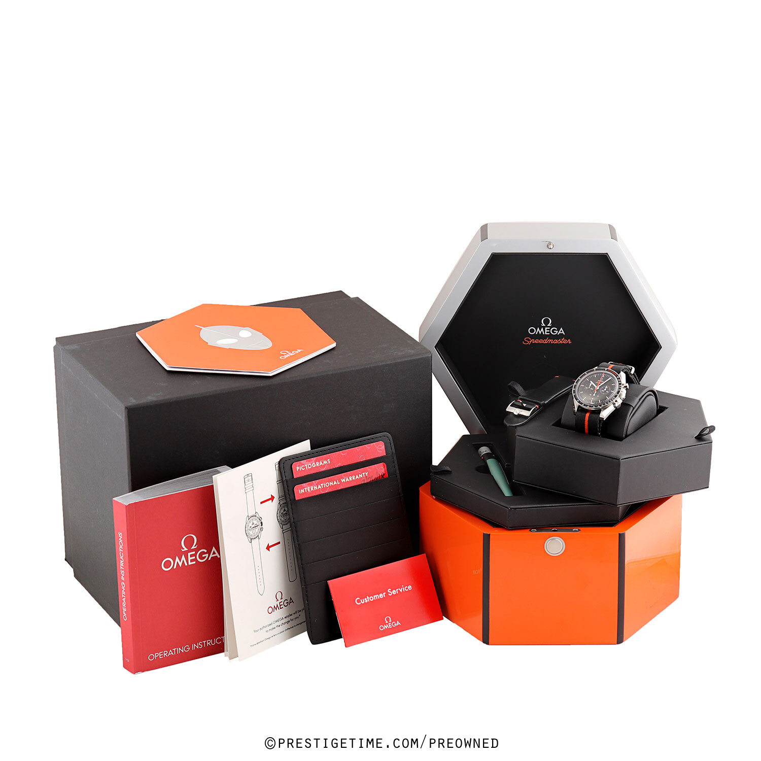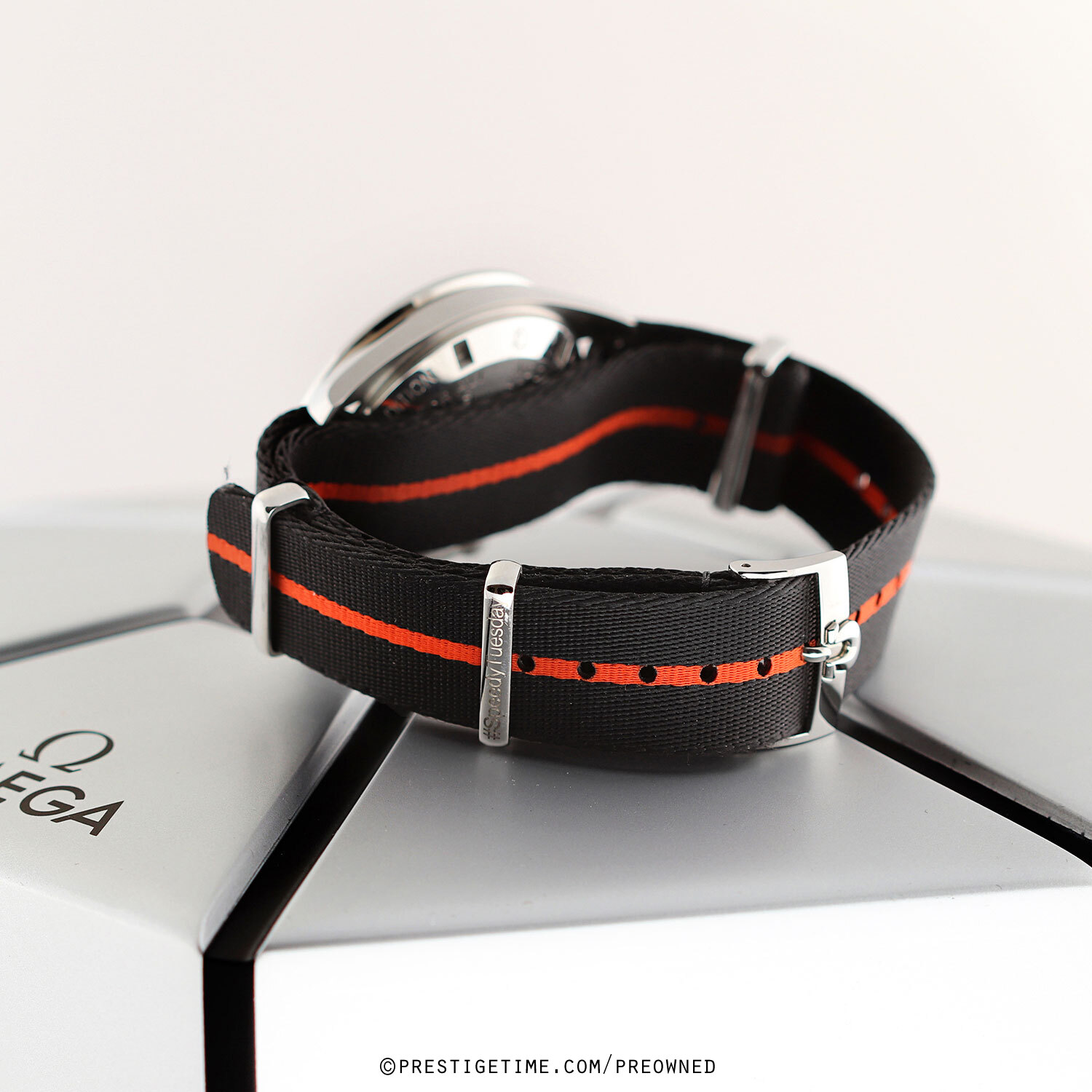 - Delivered with an additional Omega original black calfskin strap with, orange stitching & a polished stainless steel tang buckle. This strap is unworn.