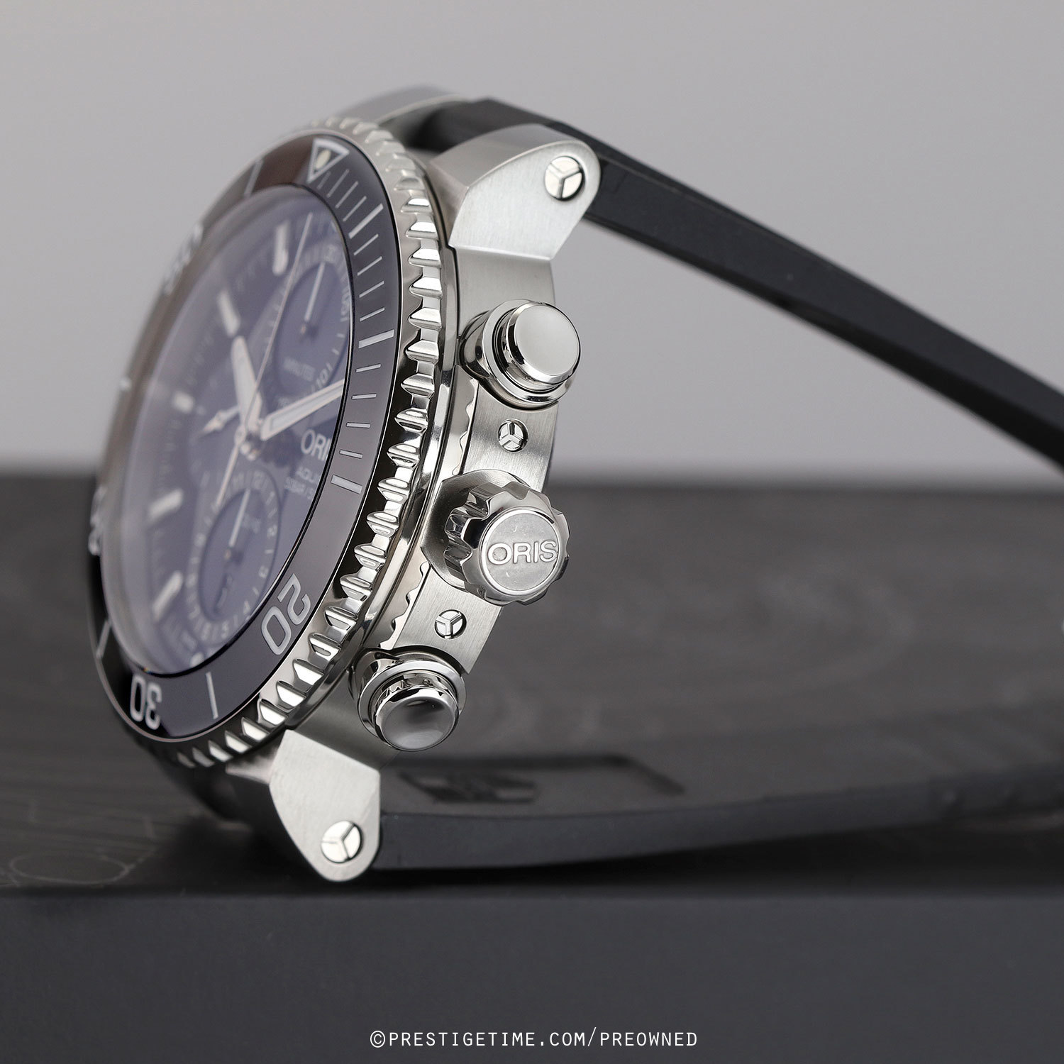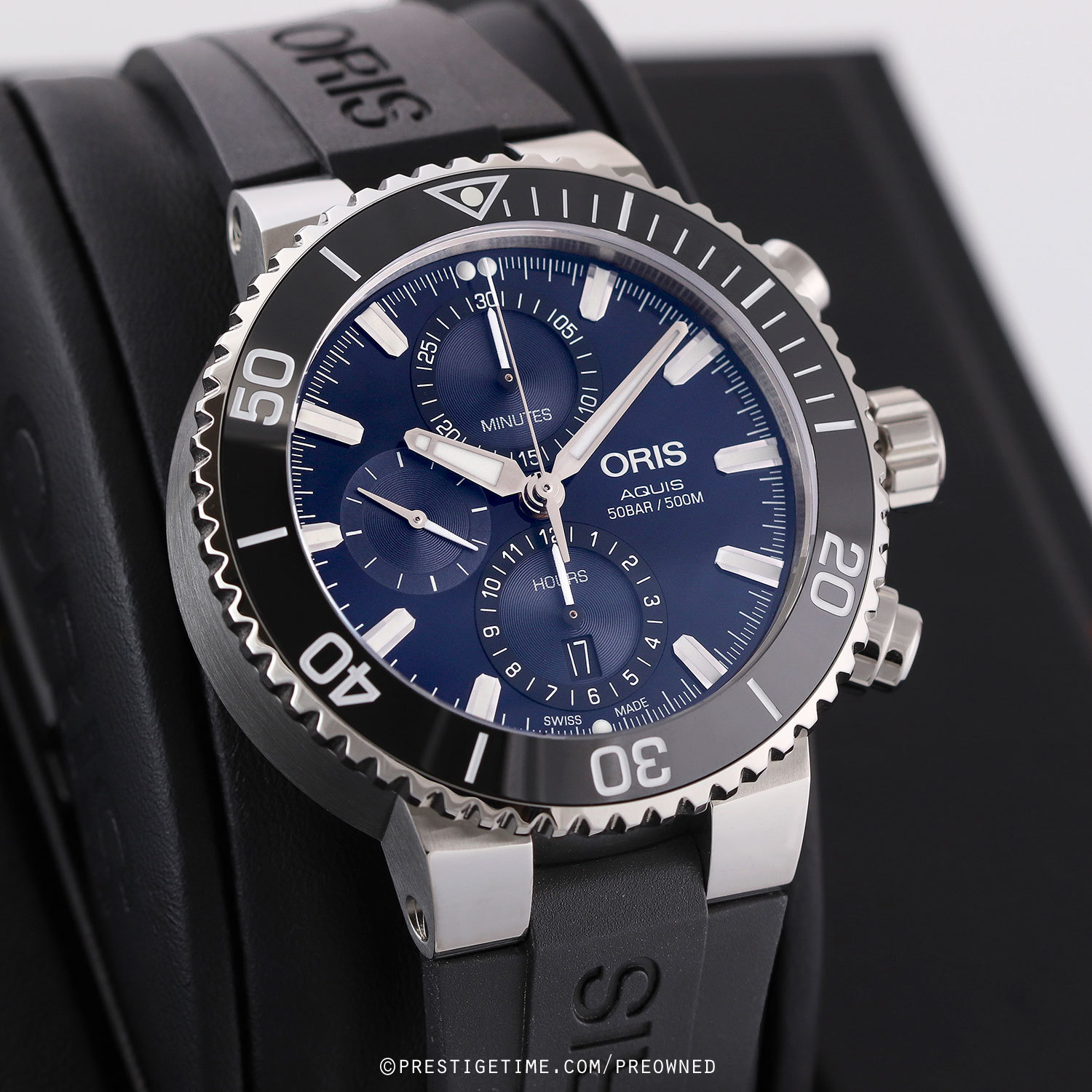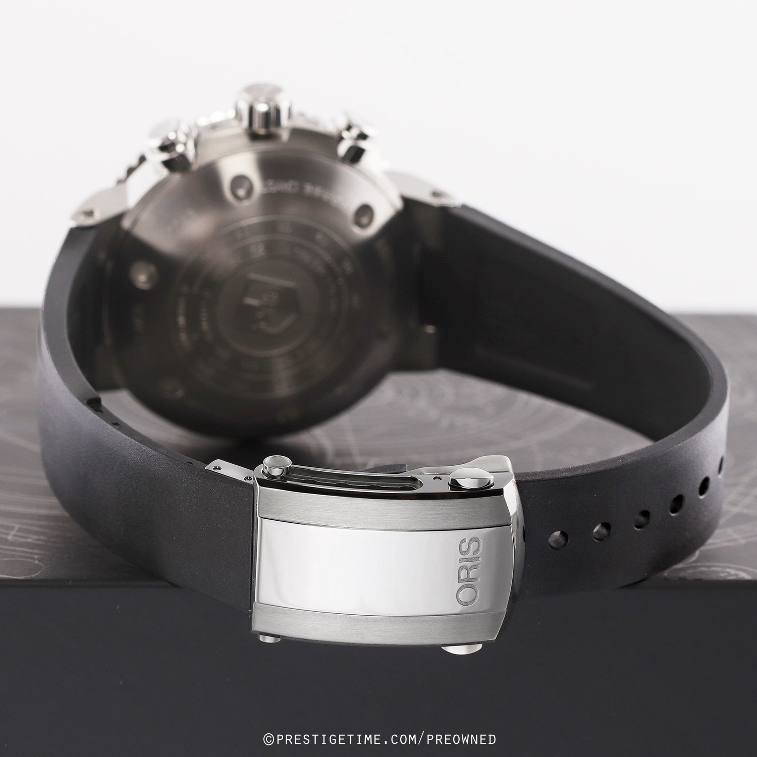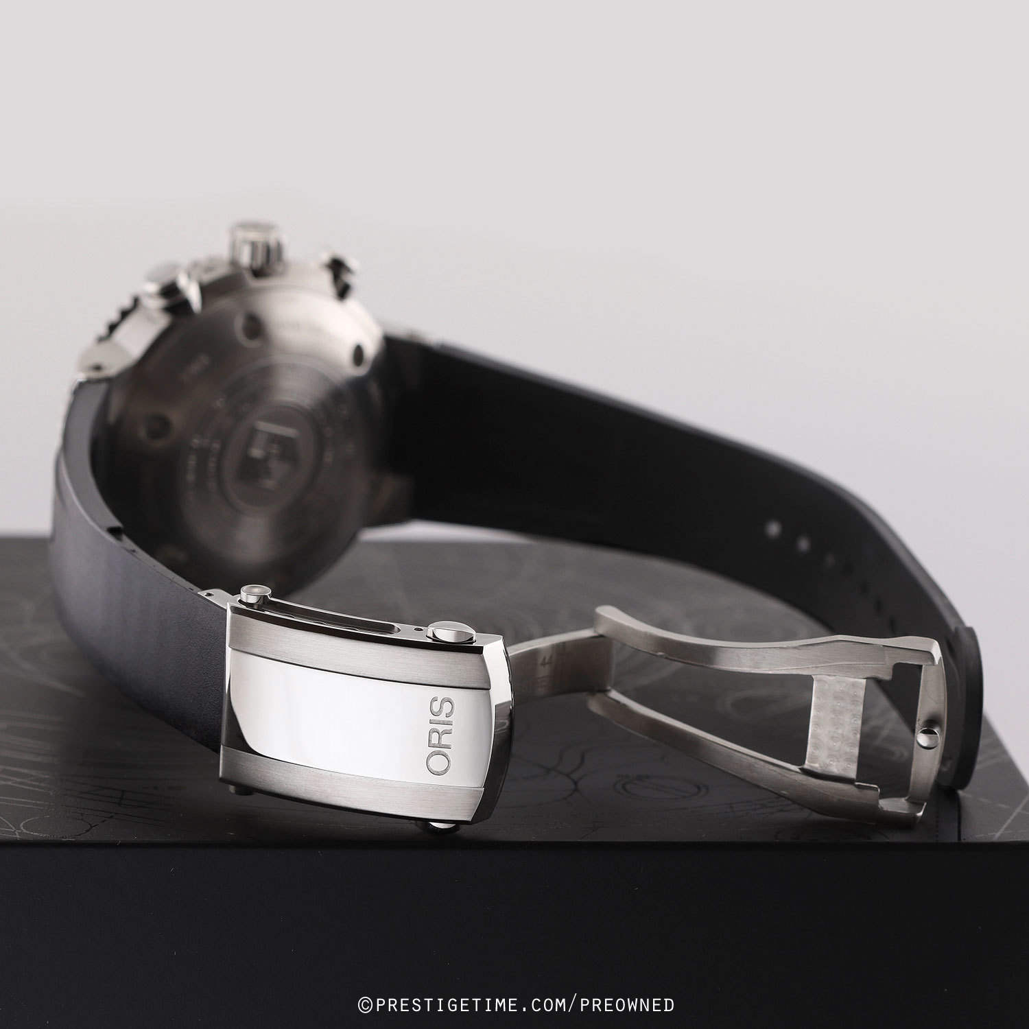 Strap: Fitted on its original ORIS branded black rubber strap with a stainless steel push-button deployant clasp featuring an integrated micro adjustment mechanism. The rubber strap is in 99% condition with its full wear lifespan remaining.