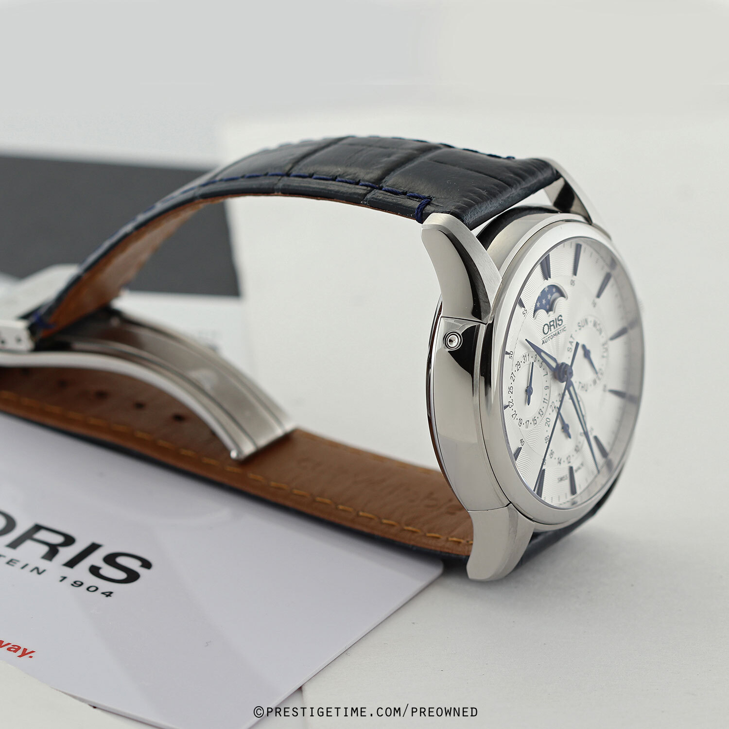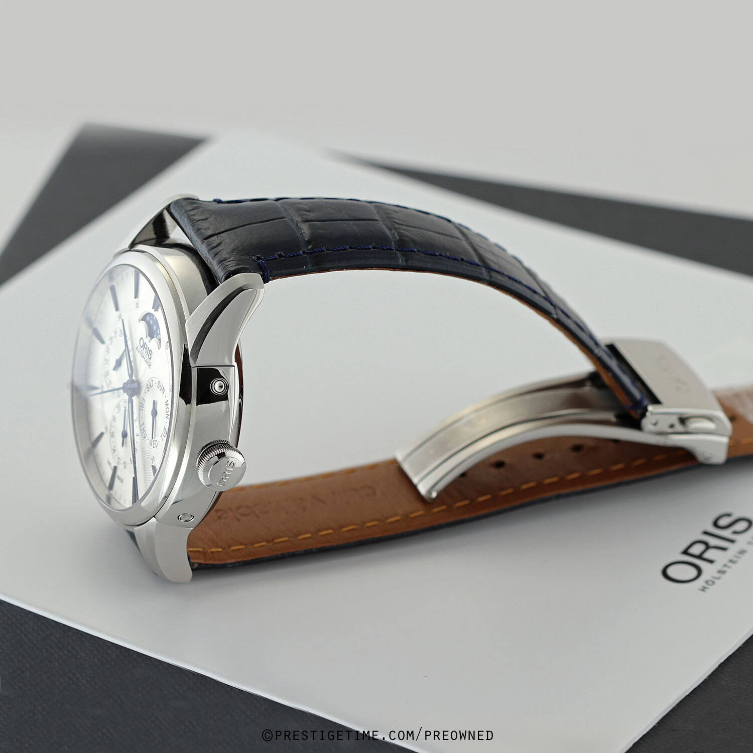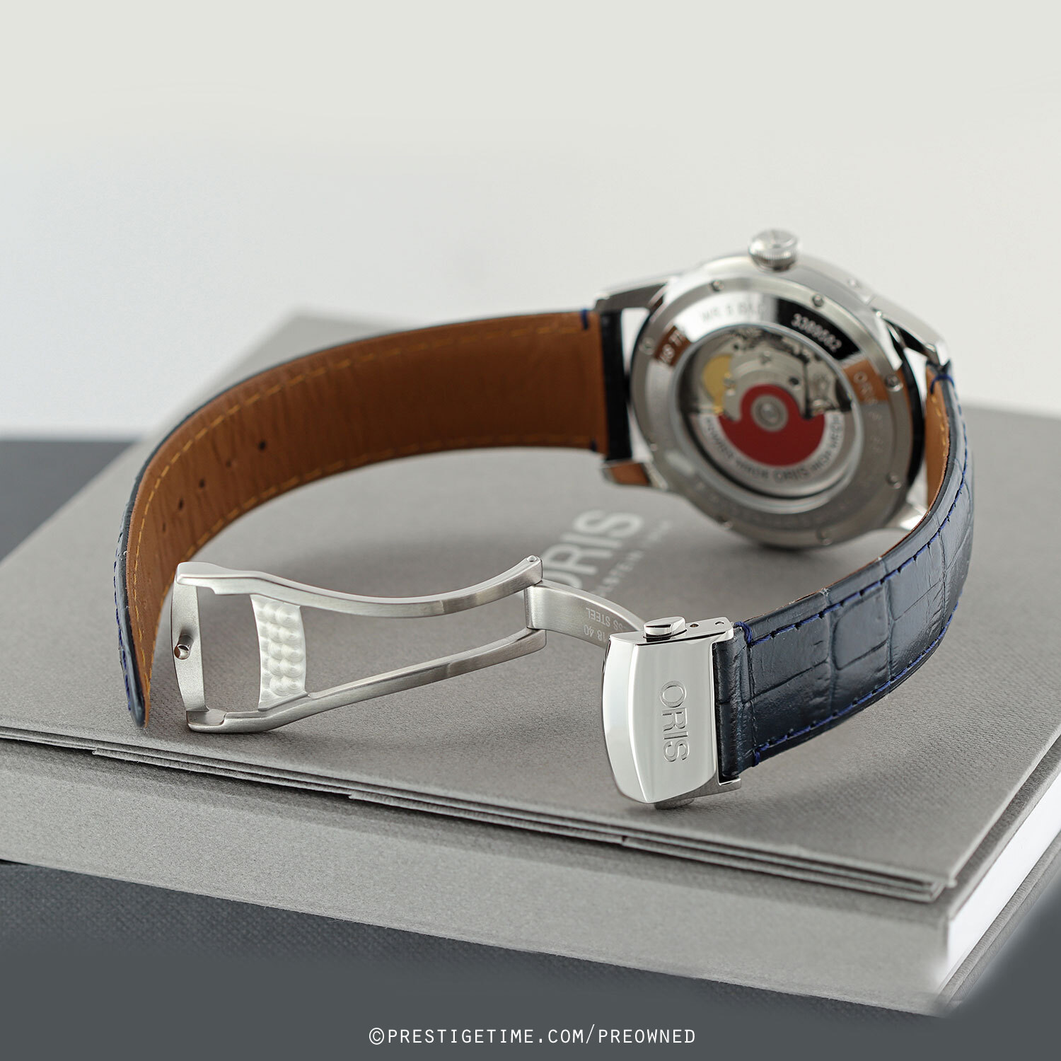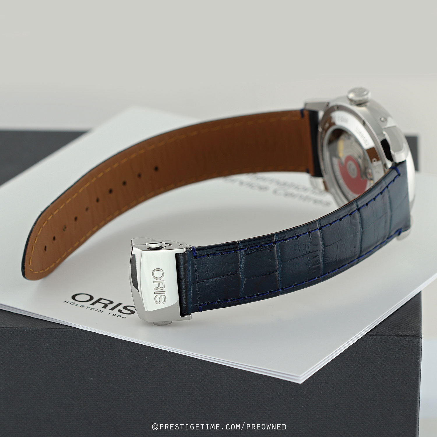 Strap: Fitted on its original Oris blue calfskin leather strap (alligator print) with a push-button deployant buckle. The strap is in excellent near new condition, with little to no signs of wear & its full wear lifespan remaining. We would be comfortable rating the strap in 98% condition.