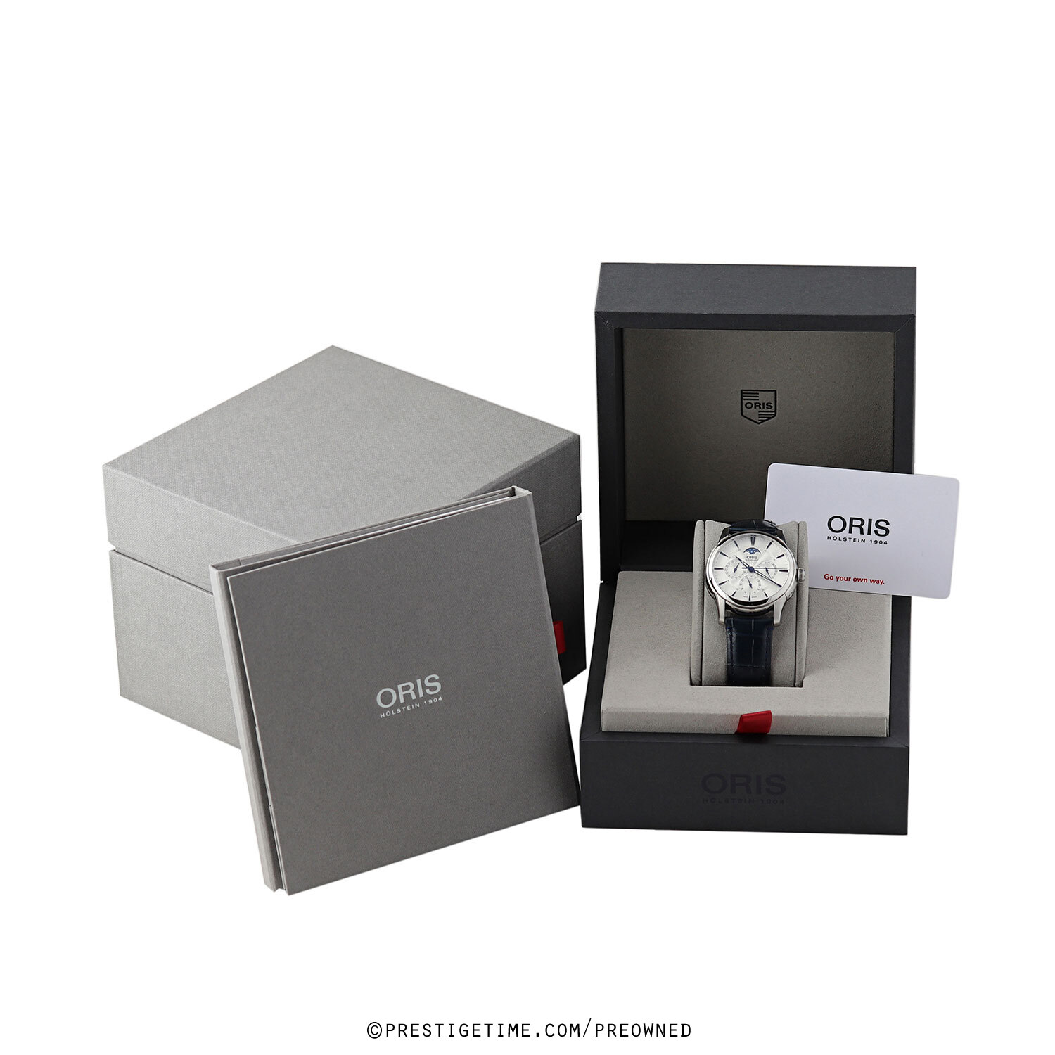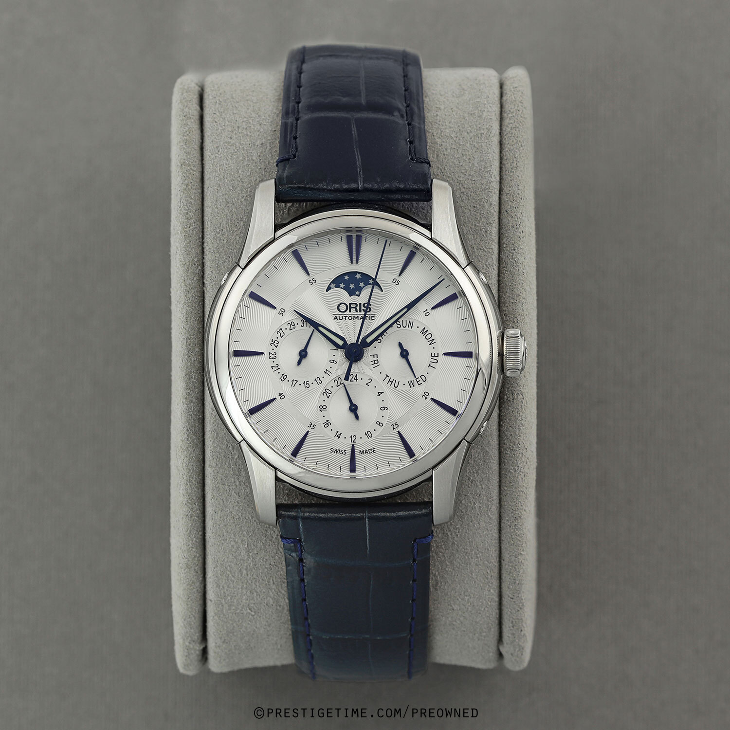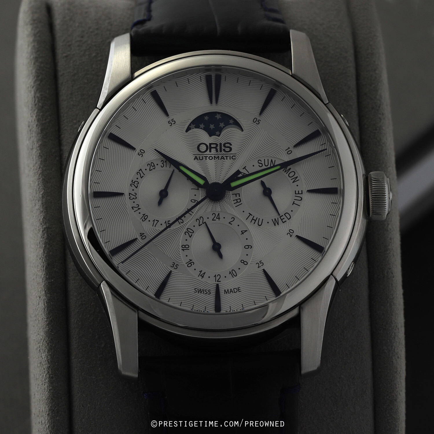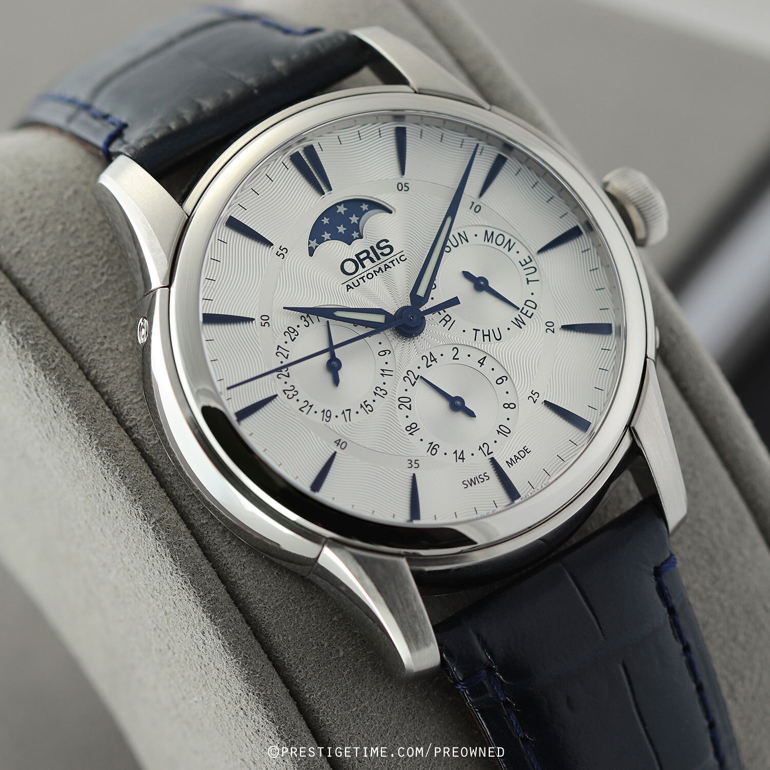 Strap: Fitted on its original Oris blue calfskin leather strap (alligator print) with a push-button deployant buckle. The strap is in excellent near new condition, with little to no signs of wear & its full wear lifespan remaining. We would be comfortable rating the strap in 98% condition.