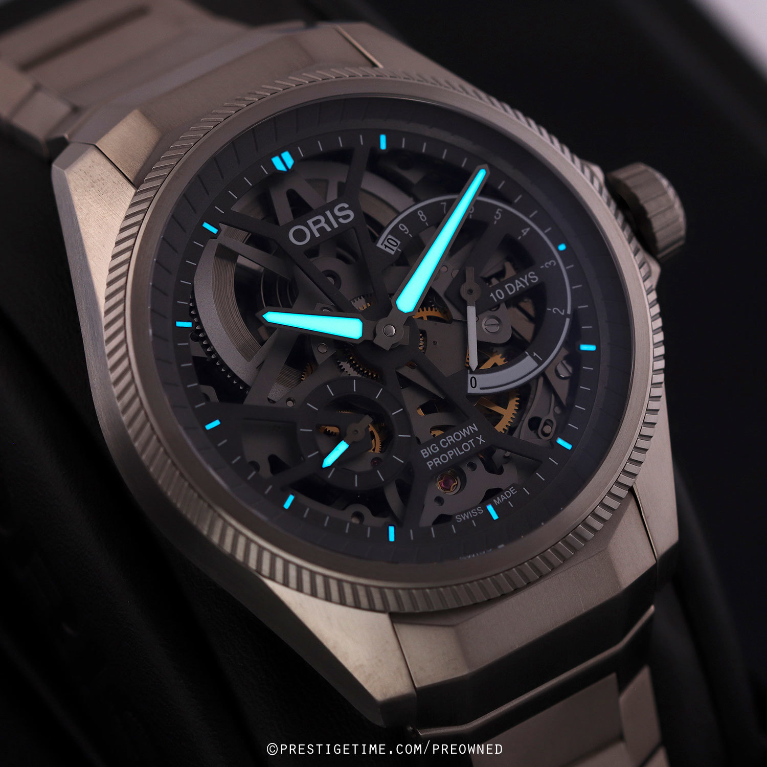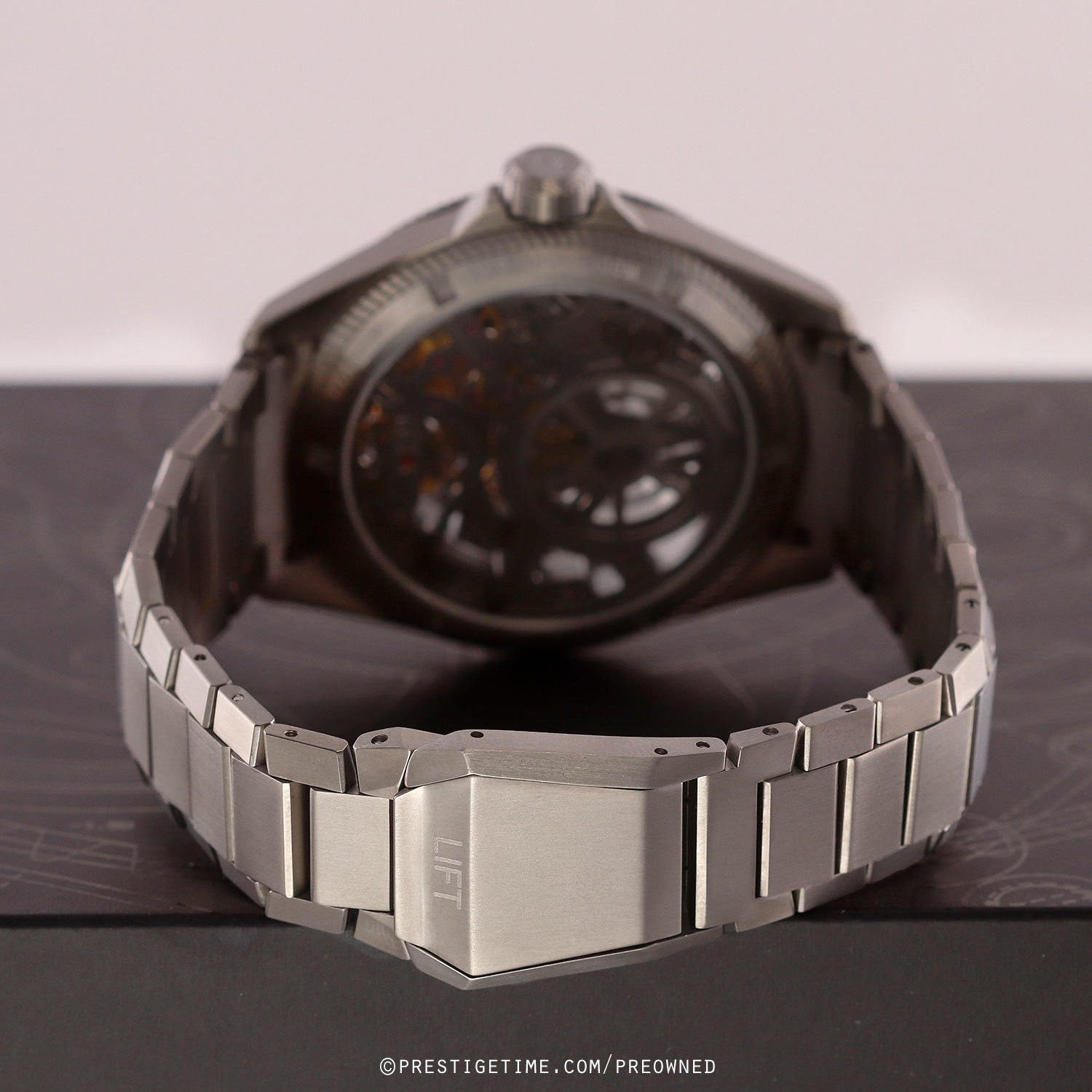 Case: Brushed finished multi-faceted titanium case with a fixed bezel ring featuring an engraved knurled pattern. Skeleton main dial. Grey dial flange & dial bridges. Brushed hands, luminous filled hour, minute & small seconds hands. Luminous hour markers. Fine printed minute track.