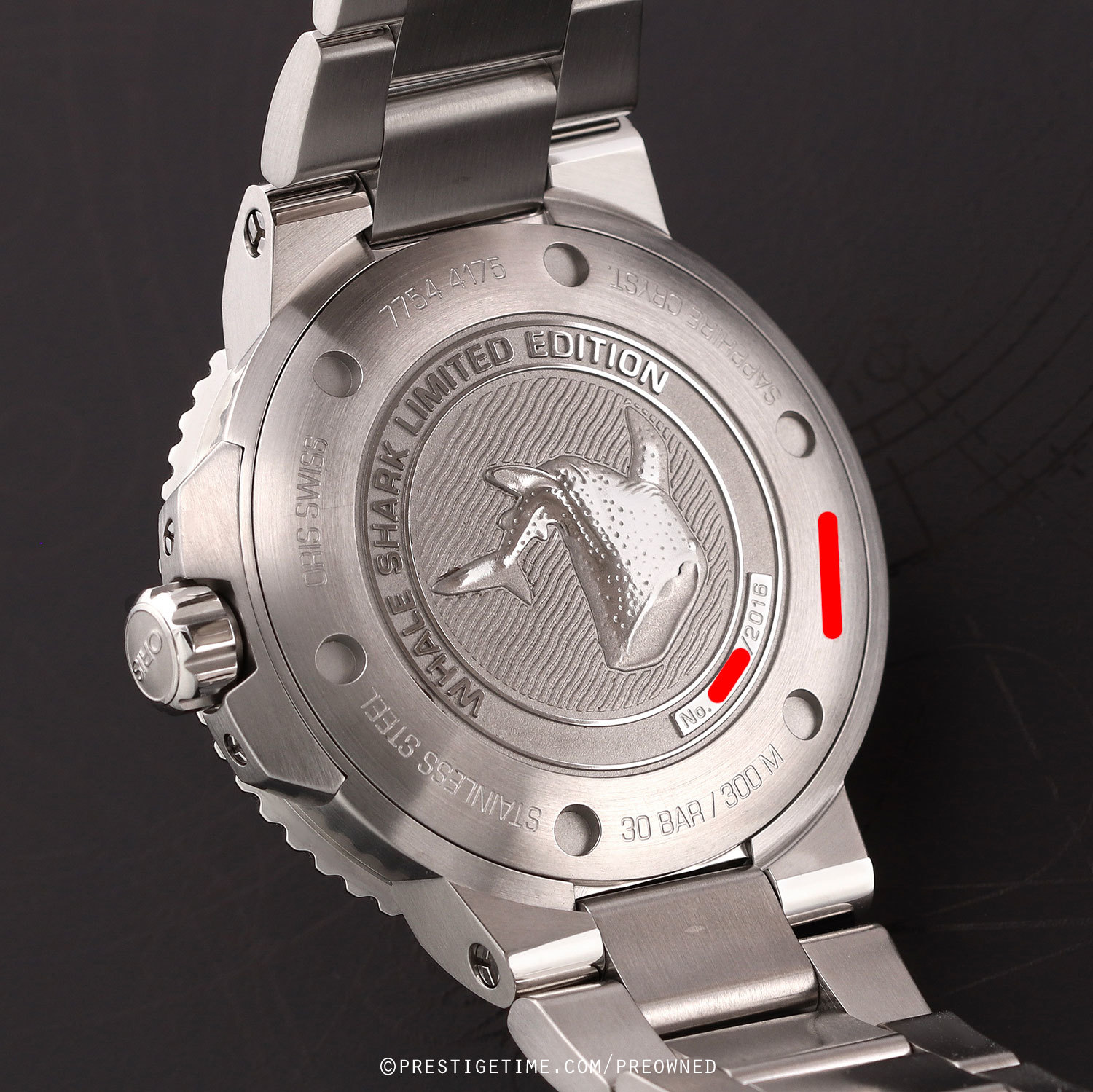Oris Whale Shark limited & numbered edition of 2016 pieces. The case back is engraved with a whale-shark.
