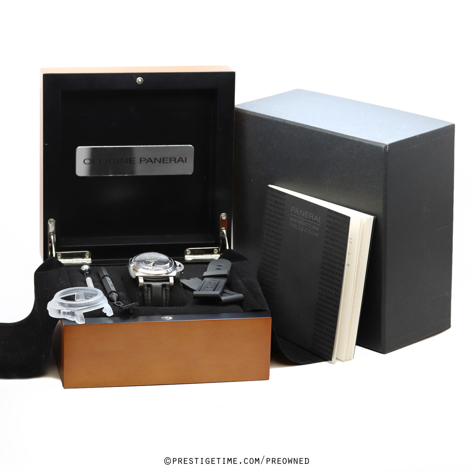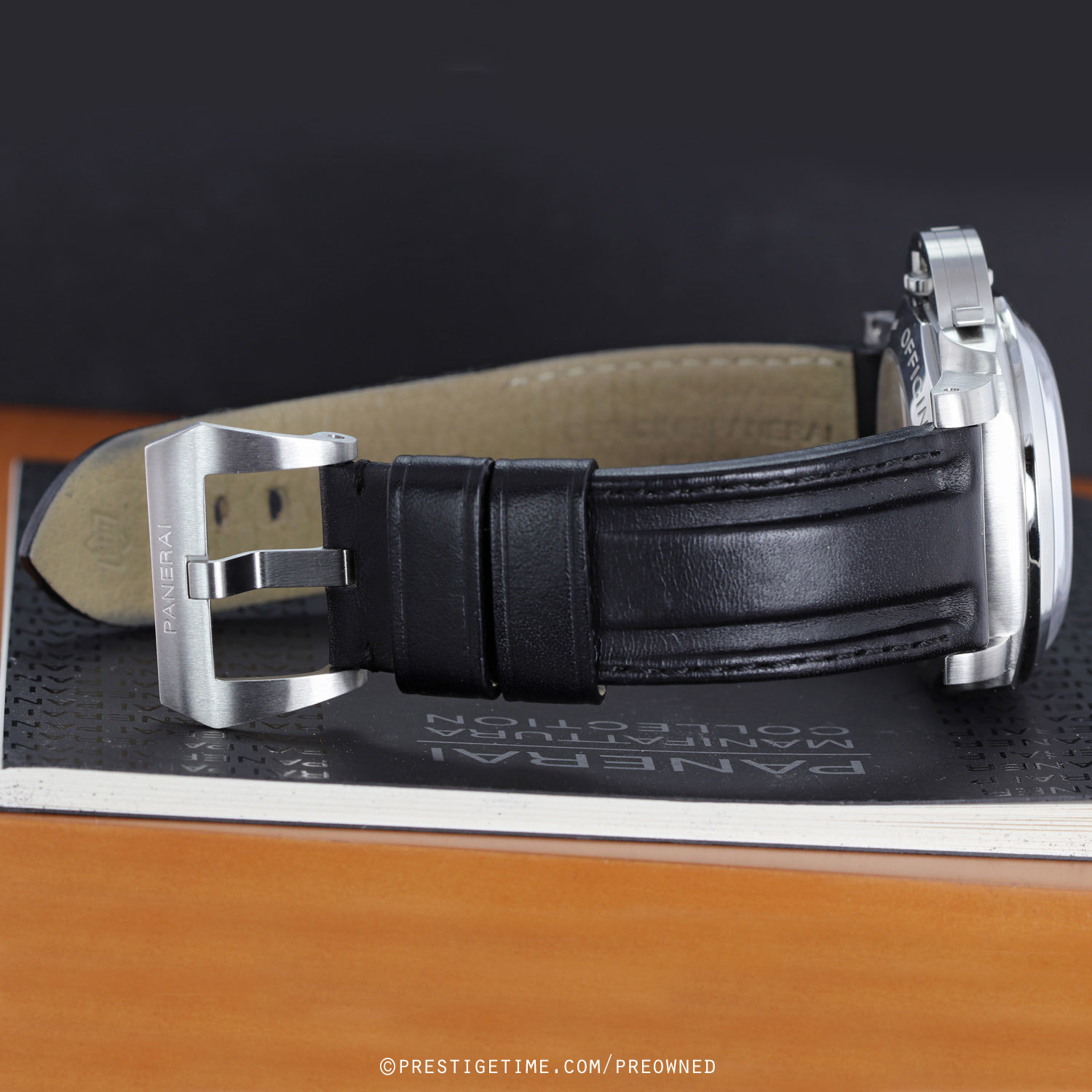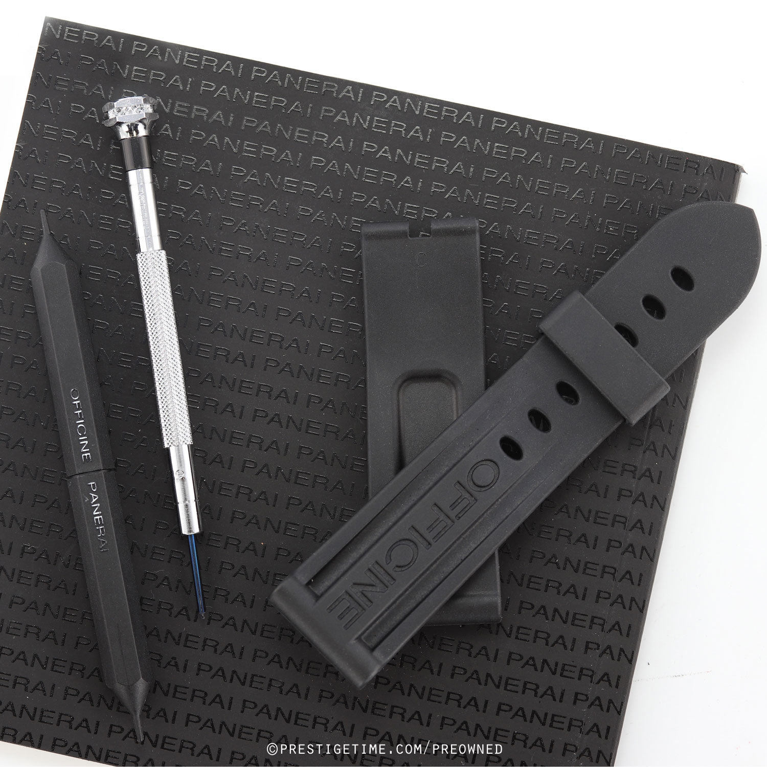 Strap: Fitted on its original ribbed black calfskin leather strap with a brushed steel tang buckle. The condition of the strap is very good with plenty of wear time remaining. We would rate the calfskin strap as being in 85% condition. Included is an original Panerai black rubber strap with the tools necessary to change the straps. The black rubber strap is in brand new condition.