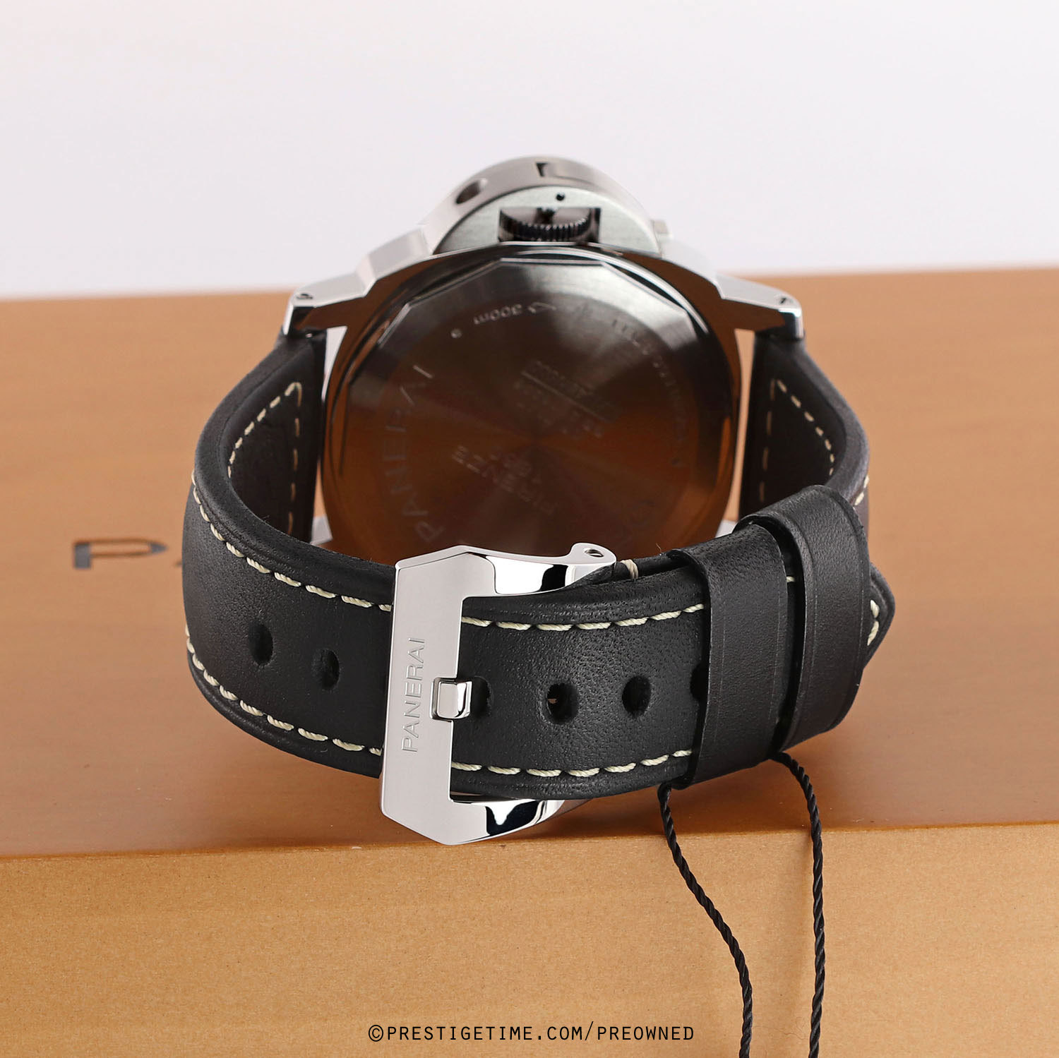 - Fitted on its original Panerai black calfskin leather strap with a stainless steel tang buckle. This strap is unworn, in new condition with its full wear lifespan remaining.
