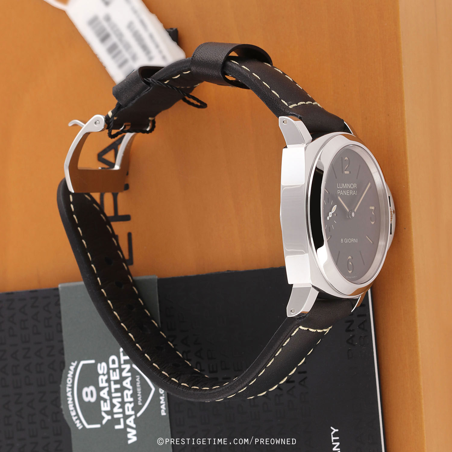 Movement: Powered by a manual winding Panerai in-house caliber P.5000, beats at 21,600 vph (3Hz), contains 21 jewels & has an impressive power reserve of 8 days (192 hours).