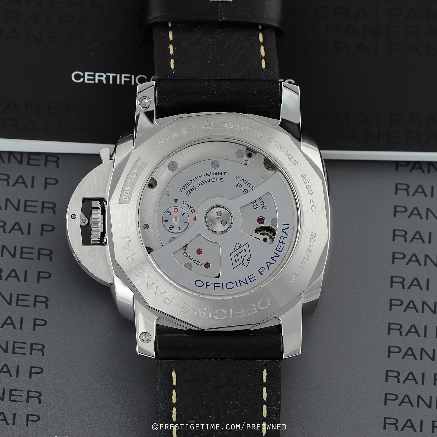 Movement: Powered by a Panerai in-house Caliber P.9003, beats at 28,800 vph, composed out of 233 parts, contains 28 Jewels & has an impressive 3 days (72 hours) power reserve.