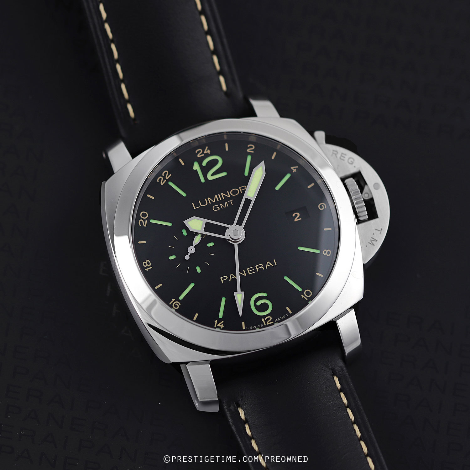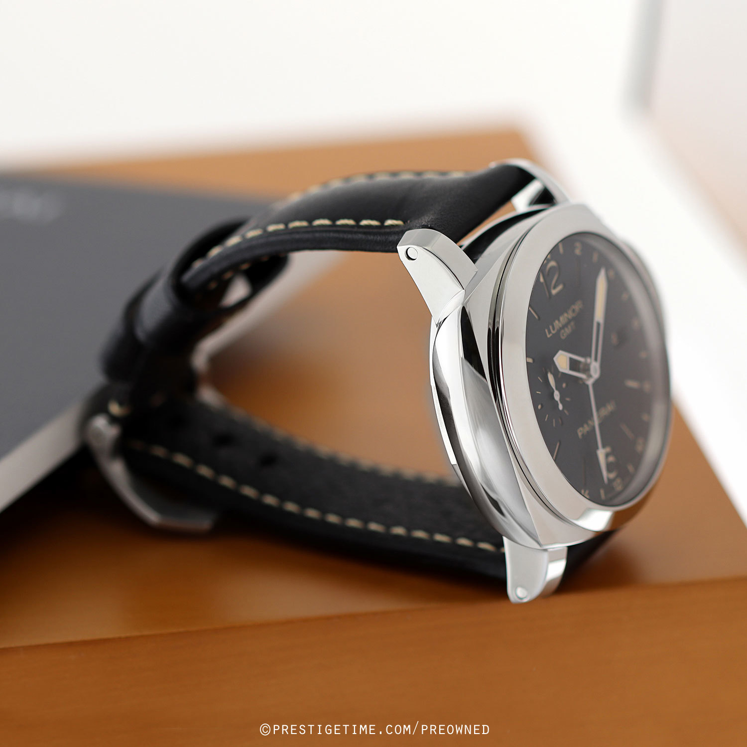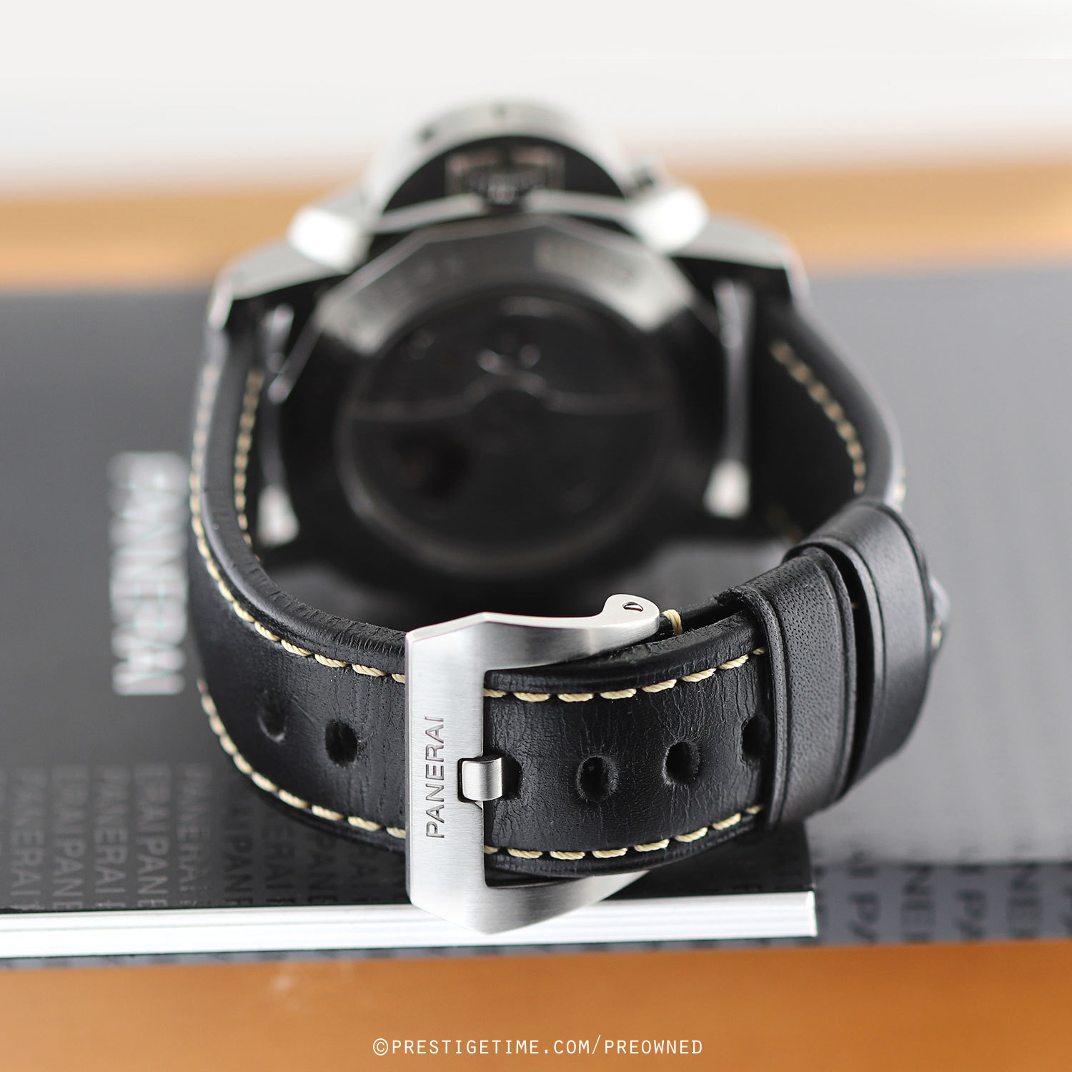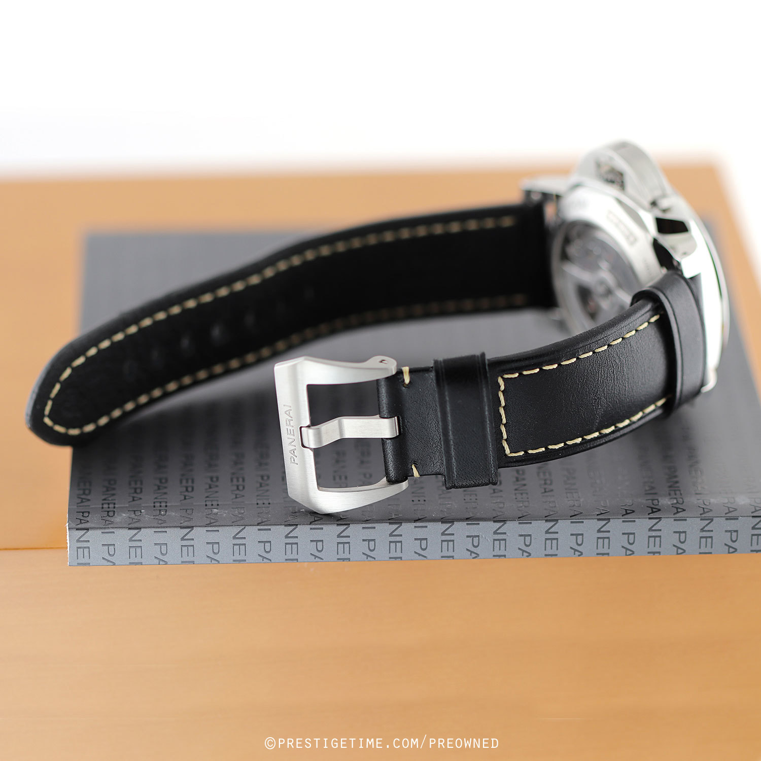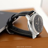 - Fitted on its original Panerai black calfskin leather strap with contrasting off-white stitching & brushed stainless steel tang buckle. The strap is in excellent overall condition with some light scuff marks typical of calfskin. We would be comfortable rating the strap as in 95% in terms of wear life-span & in 92% condition visually.