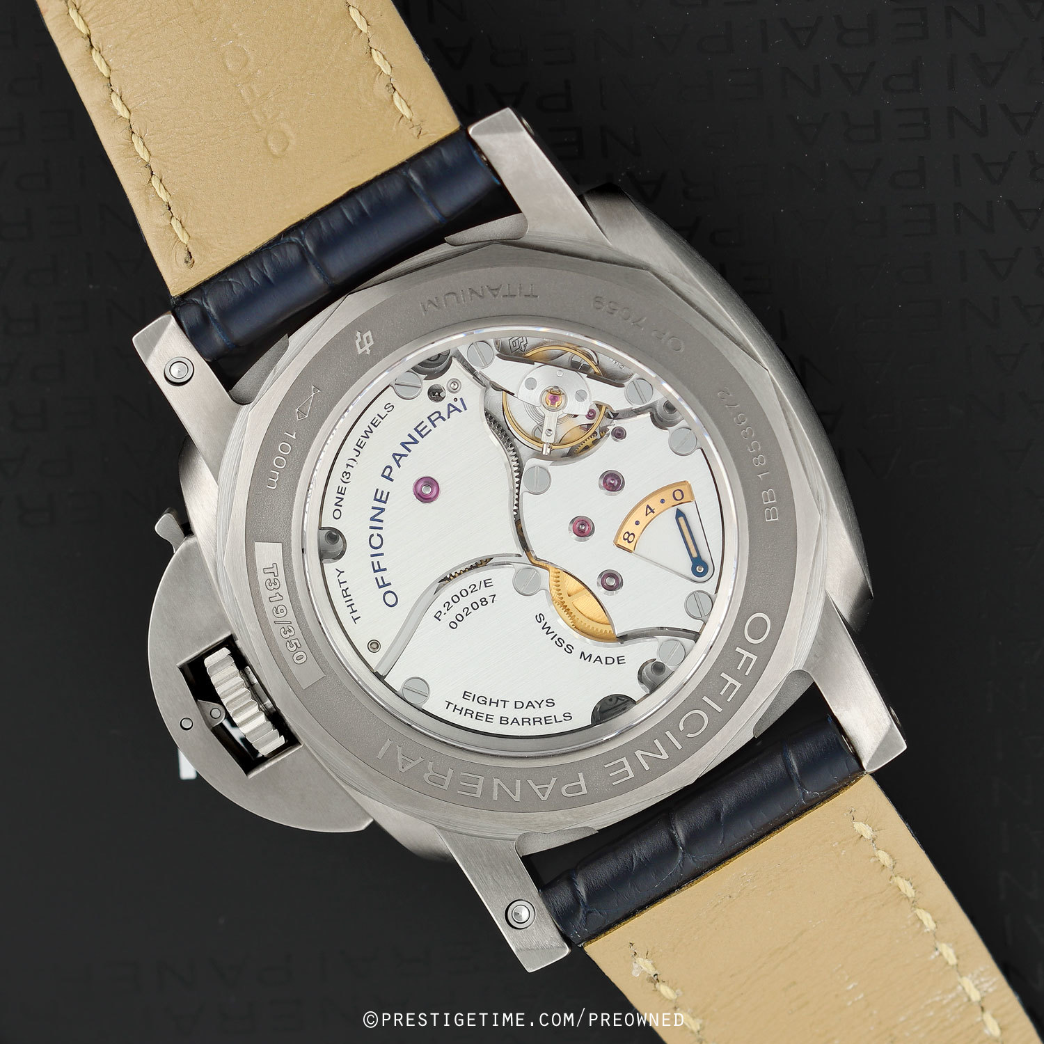Movement: Powered by a Panerai in-house manually wound caliber P.2002/E which beats at 28,800 vph, contains 31 jewels & has an incredible power reserve of 8 days or 192 hours when fully wound.
