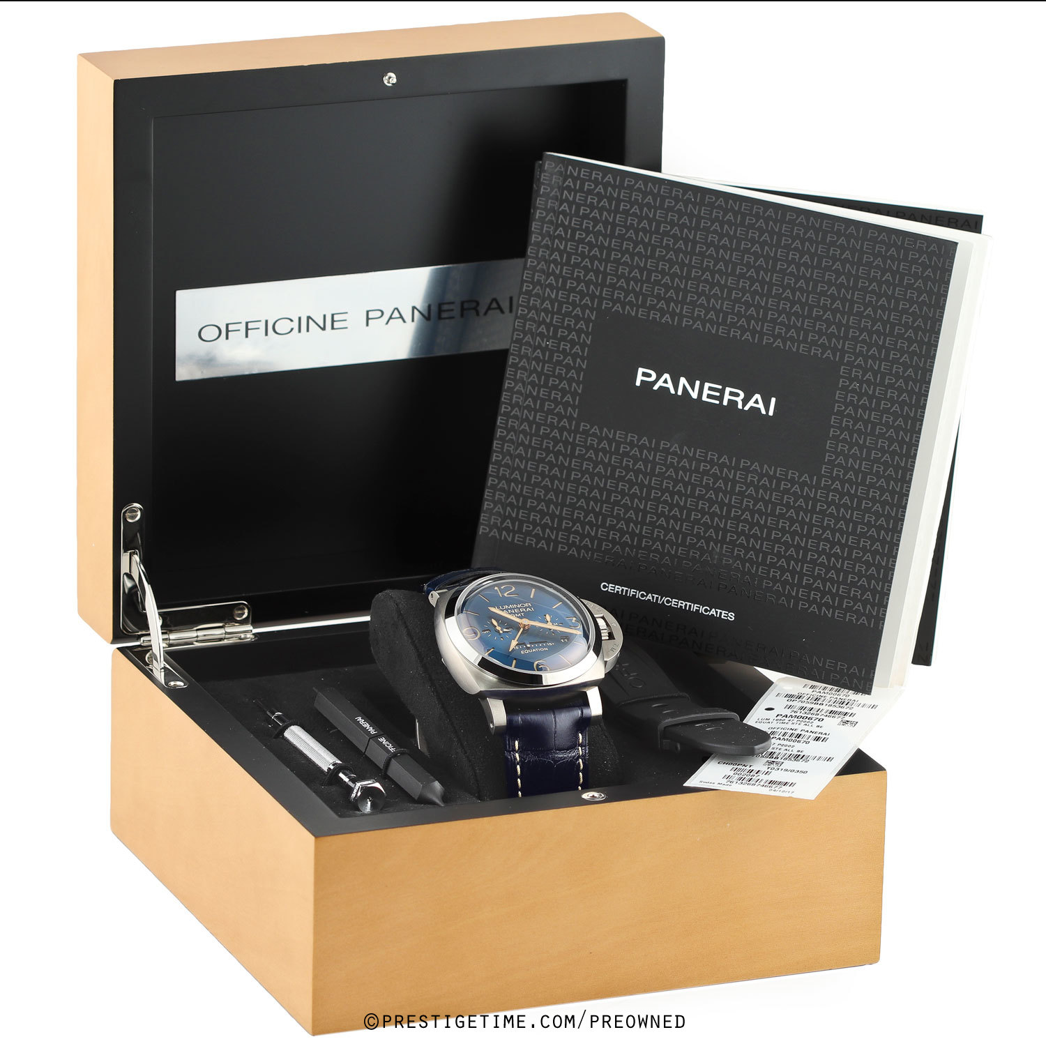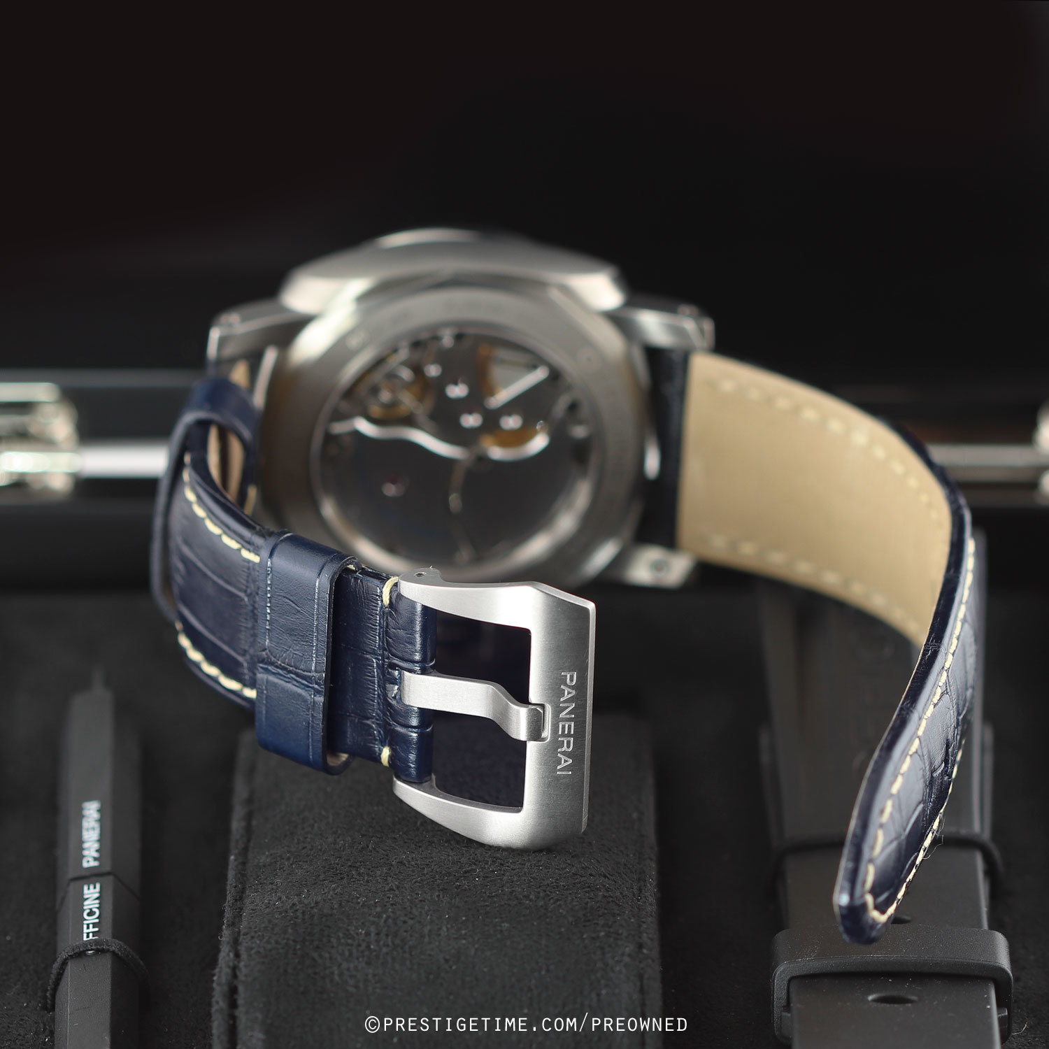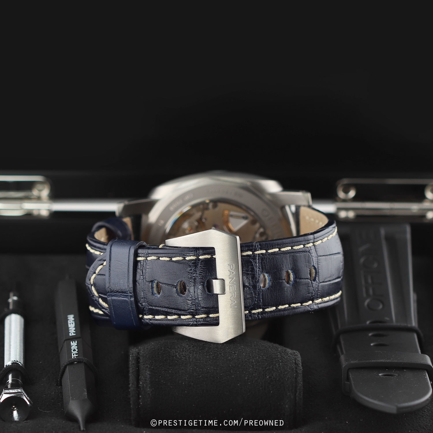 Strap: Fitted on its original, barely worn blue alligator leather strap with off-white stitching & a brushed tang buckle. Supplied with an additional, unworn, Panerai branded black rubber strap & with the necessary tools to change the strap & buckle.