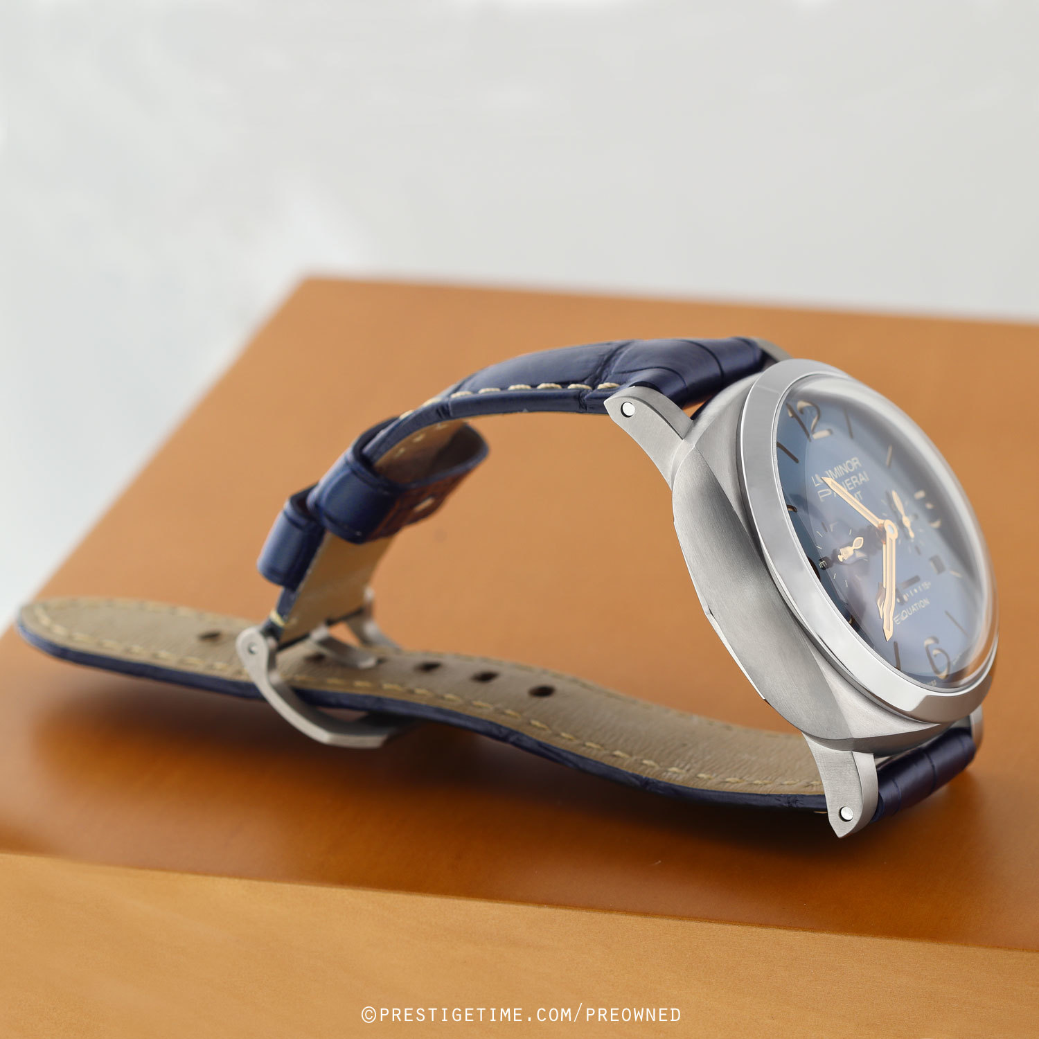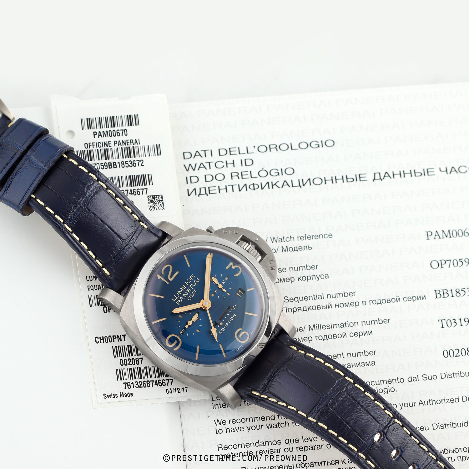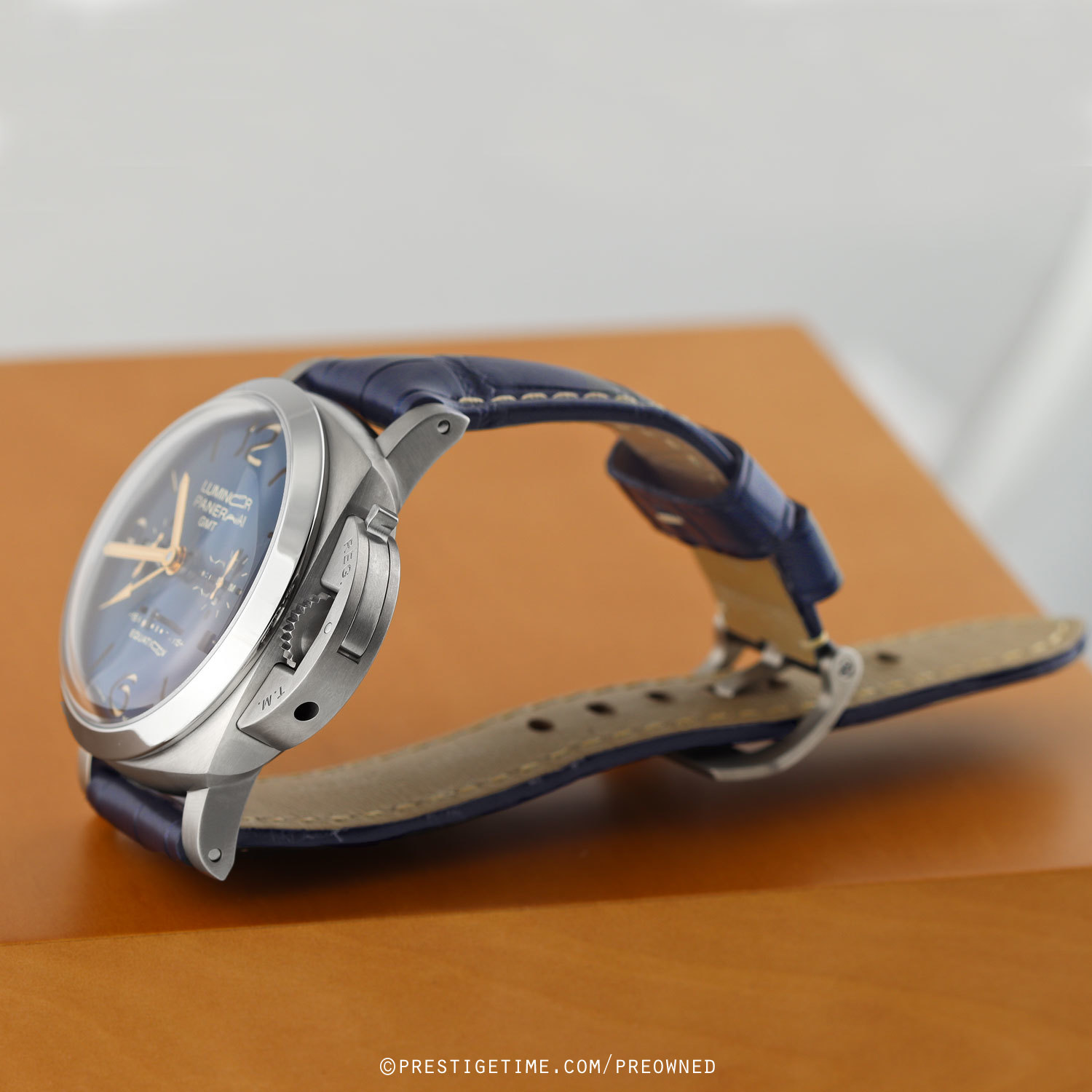 Strap: Fitted on its original, barely worn blue alligator leather strap with off-white stitching & a brushed tang buckle. Supplied with an additional, unworn, Panerai branded black rubber strap & with the necessary tools to change the strap & buckle.