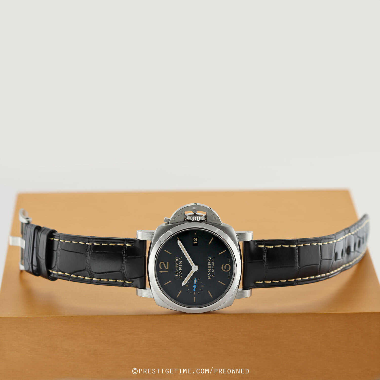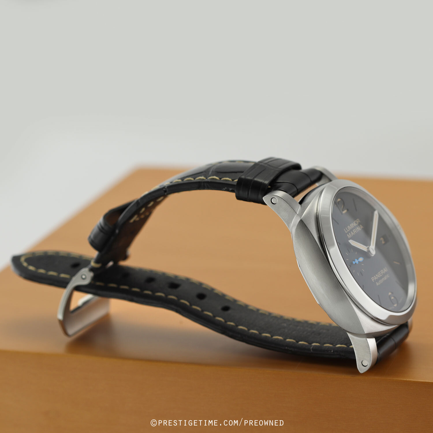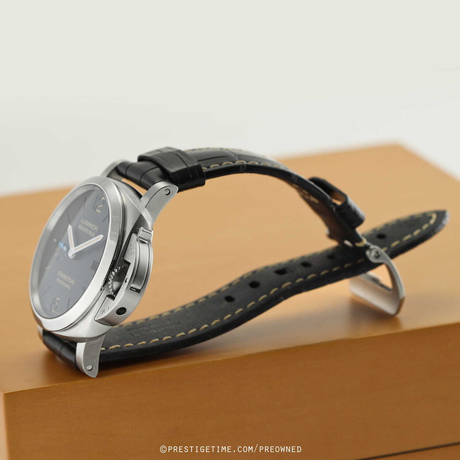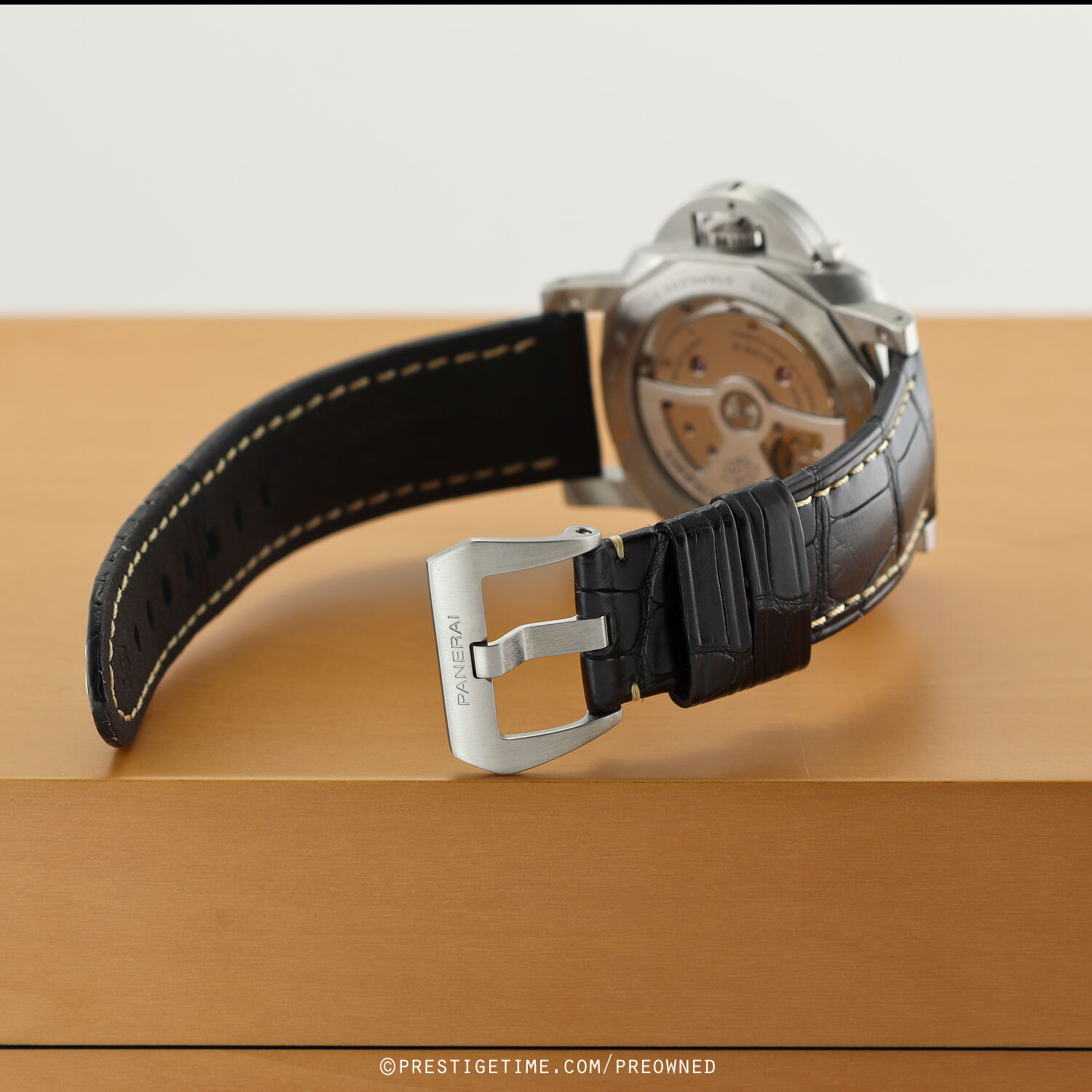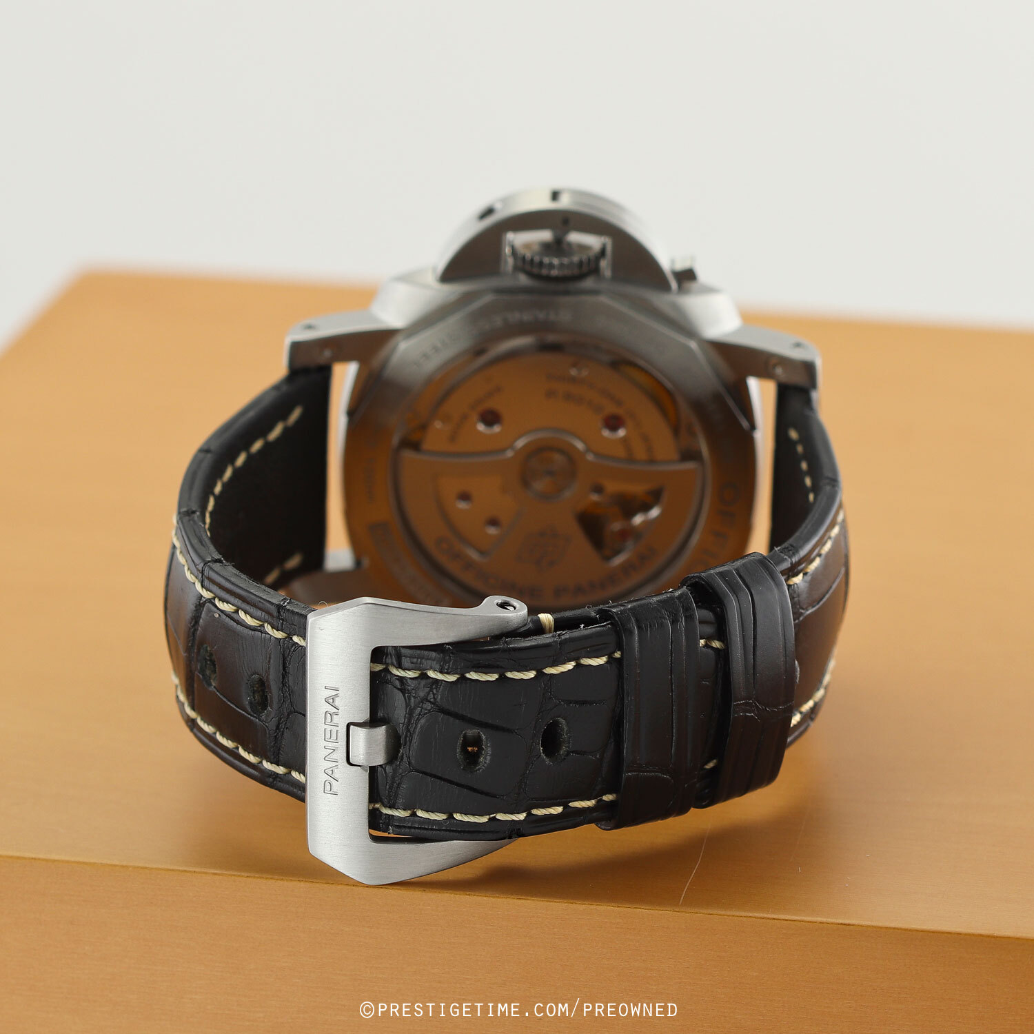 • Fitted on its original OEM Panerai black alligator leather strap with a stainless steel tang buckle. The strap is in excellent overall condition with most of wear lifespan remaining. We would be comfortable rating the strap as in 95% condition.