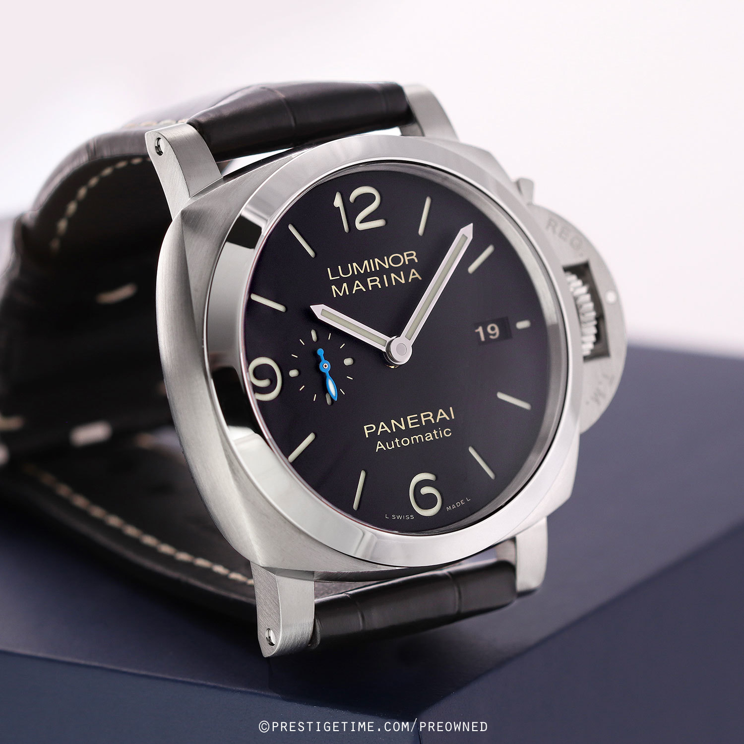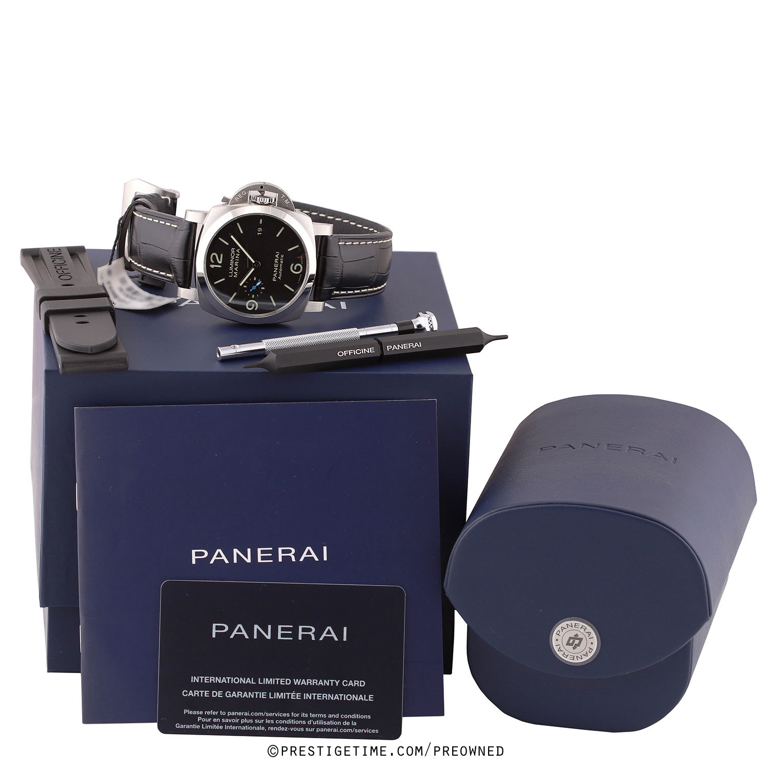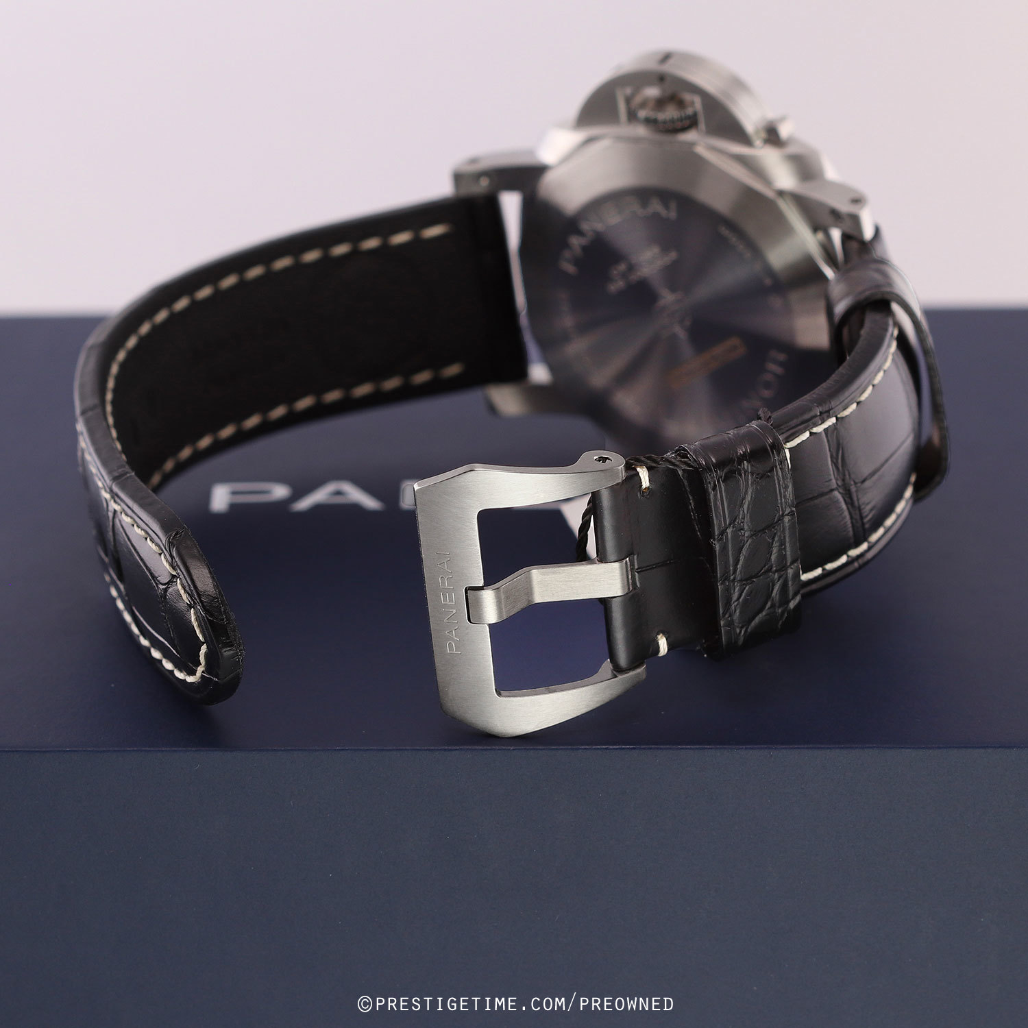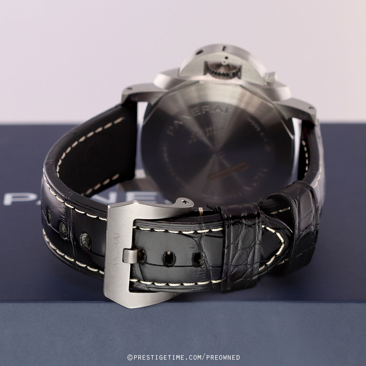 - Fitted on its original Panerai black alligator leather strap with contrasting white stitching & a stainless steel tang buckle. This strap is in new & unworn condition with its full wear lifespan remaining.