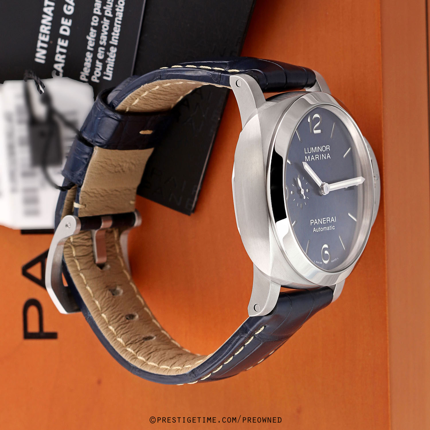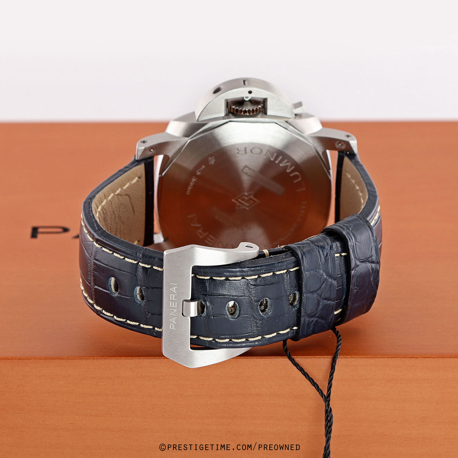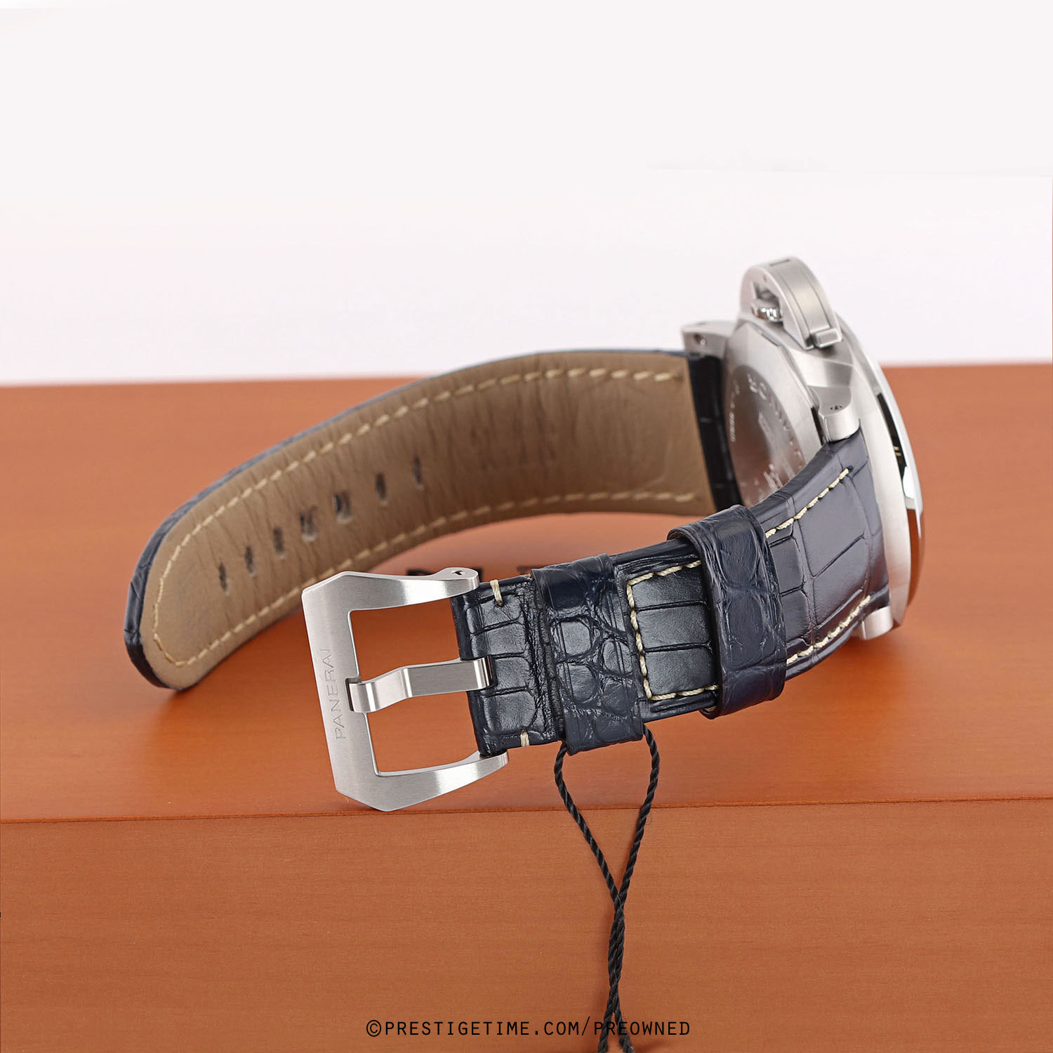 1. Fitted on its original Panerai blue alligator leather strap with contrasting off-white stitching & a stainless steel tang buckle. This strap is in new & unworn condition with its full wear lifespan remaining. This