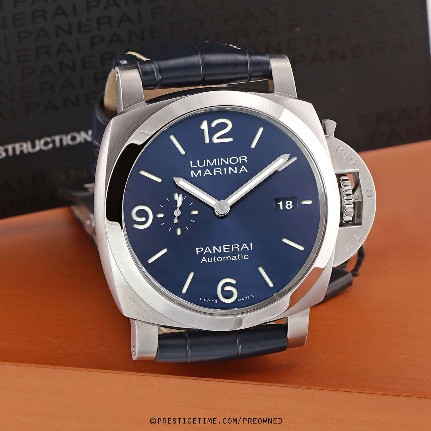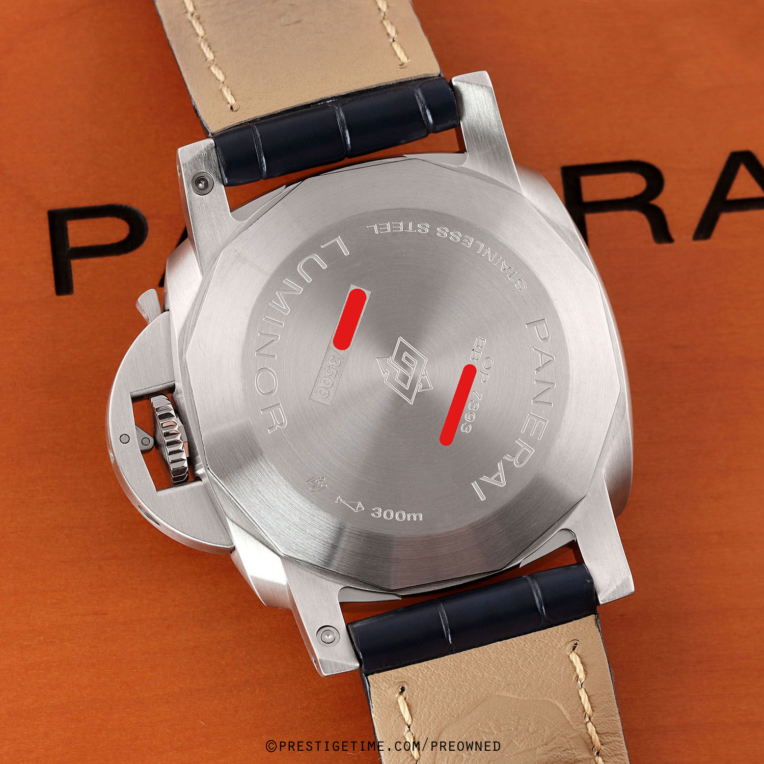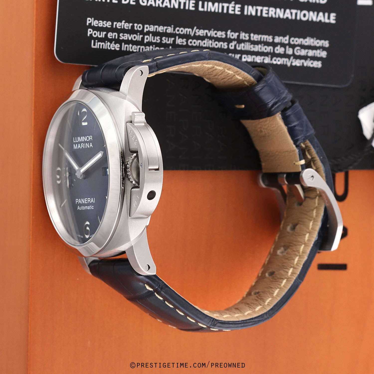 1. Fitted on its original Panerai blue alligator leather strap with contrasting off-white stitching & a stainless steel tang buckle. This strap is in new & unworn condition with its full wear lifespan remaining. This