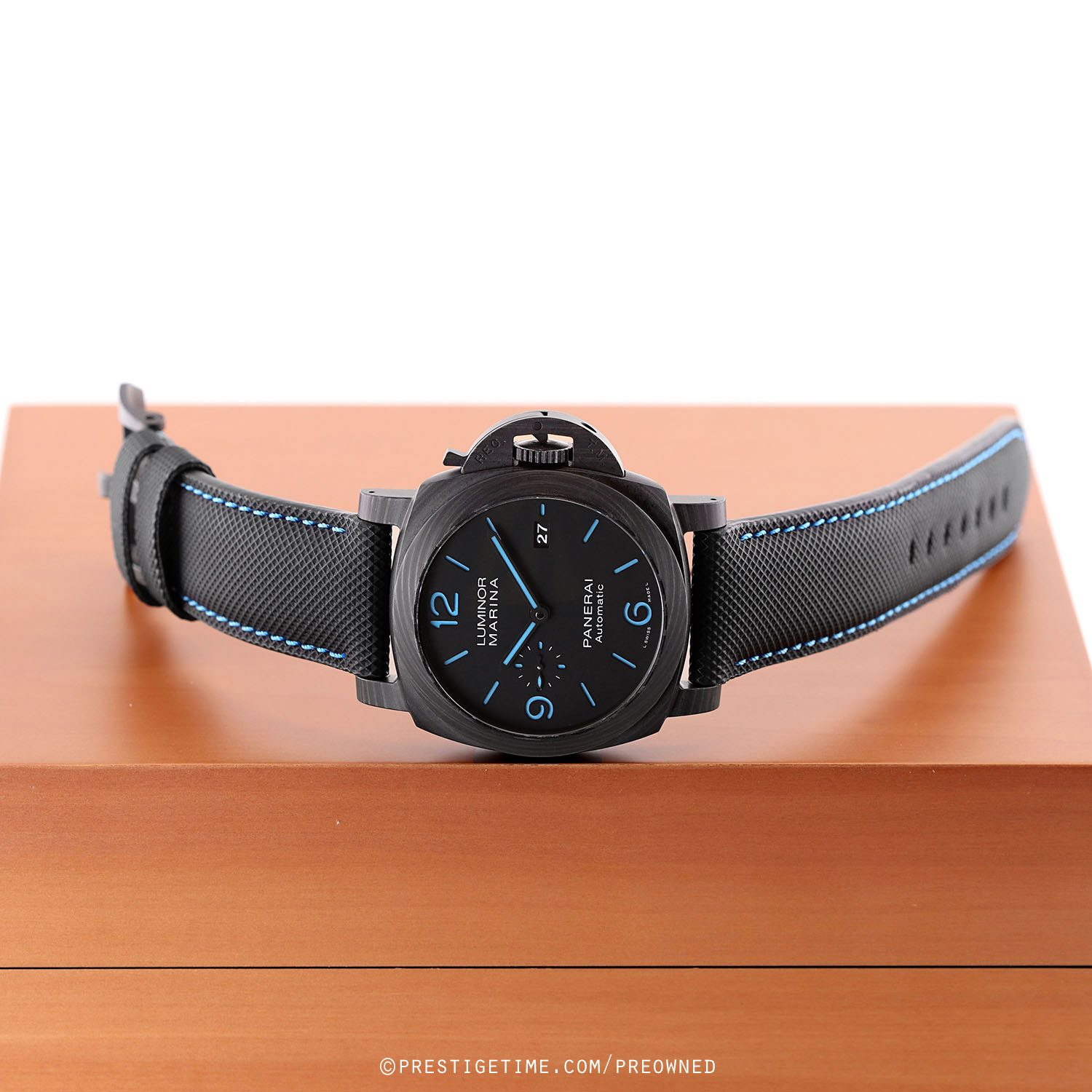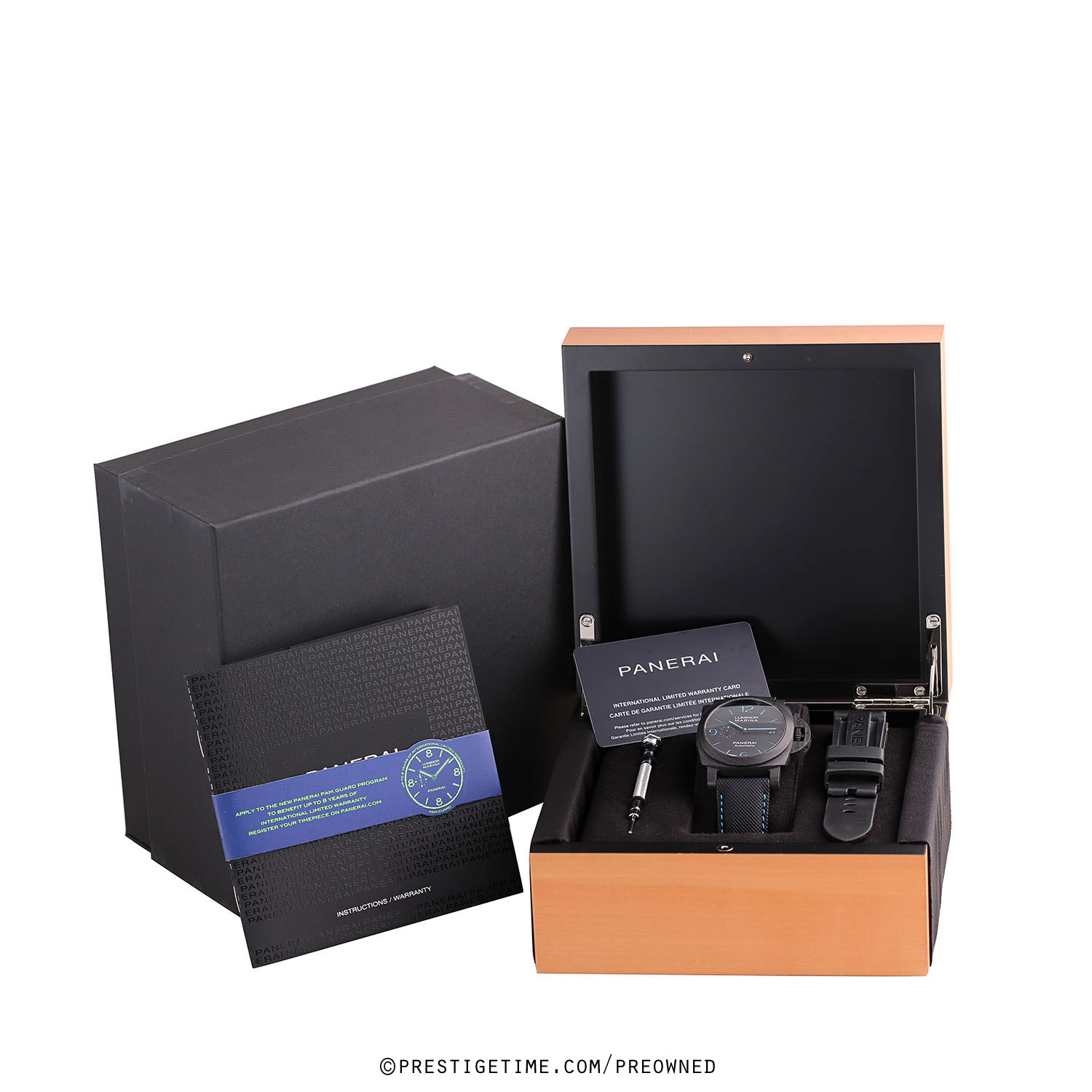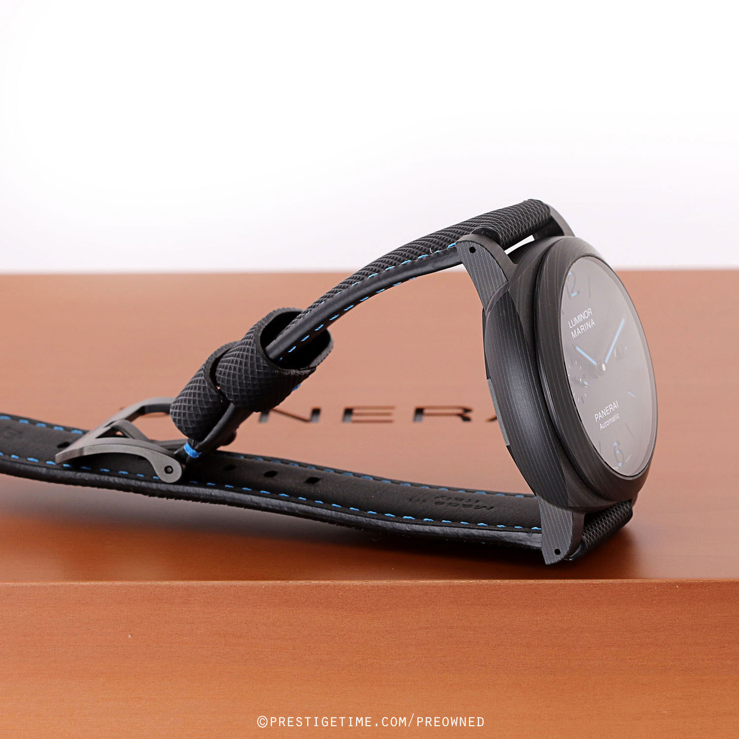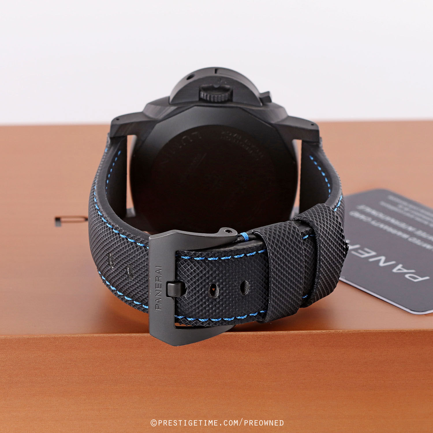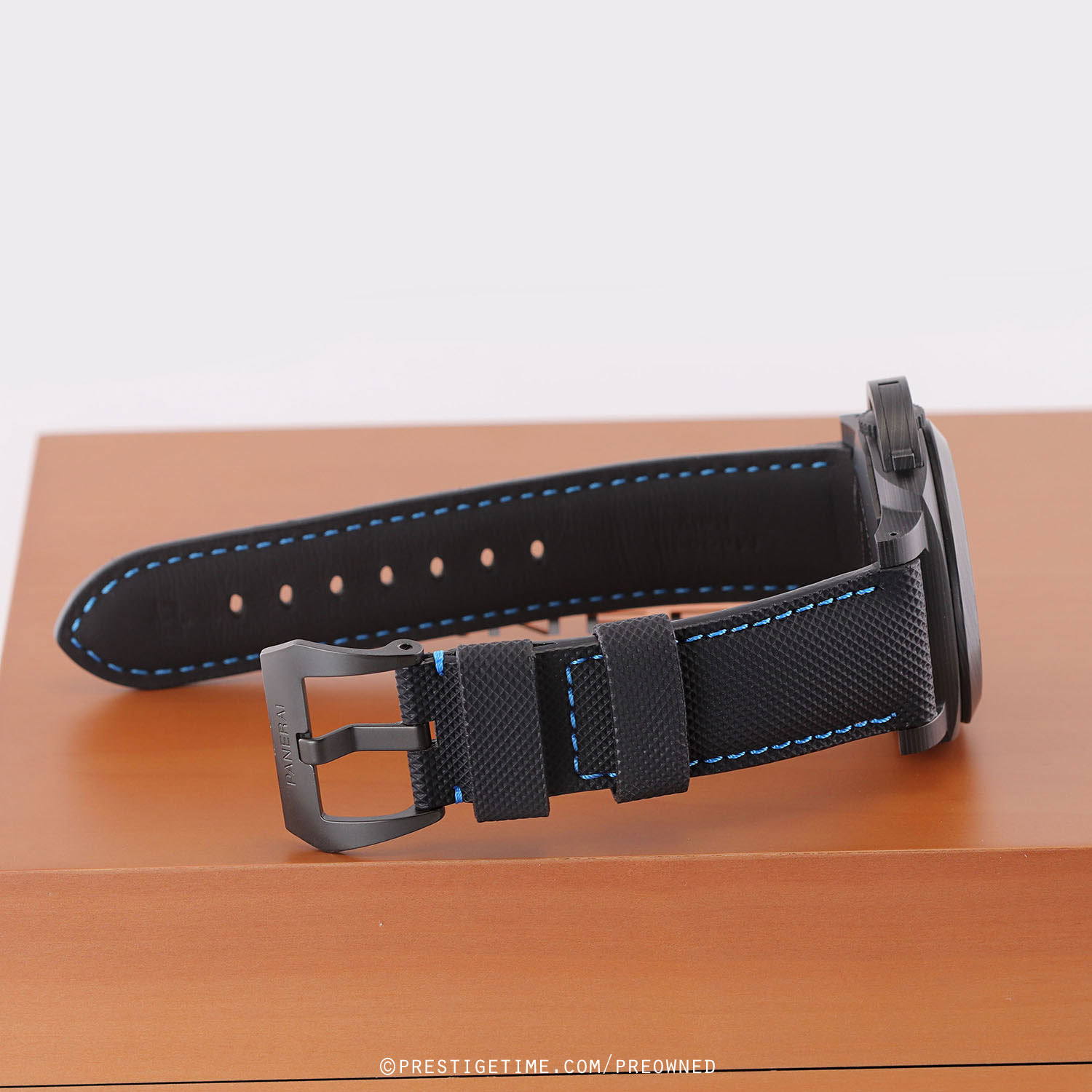 - Fitted on a Panerai original black calfskin leather strap with blue stitching & a black PVD coated stainless steel tang buckle. The strap is in excellent overall condition, with the majority of its wear-lifespan remaining. We would grade the strap as in 97% condition.