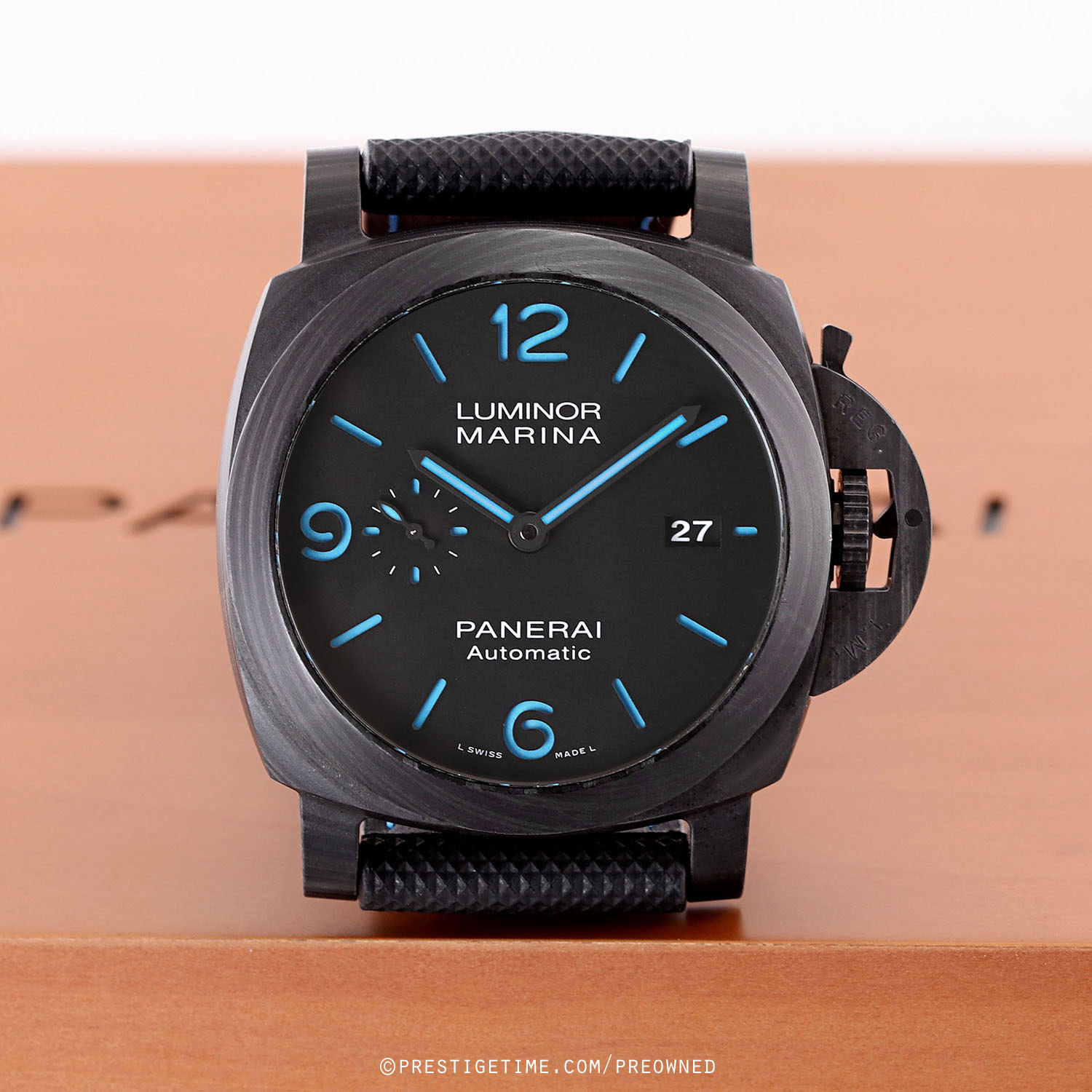 Case: Black carbotech case & levered crown guard. Black coated titanium case back. Matte black Sandwich construction dial with hour marker cutouts superimposed on a solid blue luminous plate. Black hands with blue luminous fill. Date window at 3 o'clock. Small seconds sub-dial at 9 o'clock.