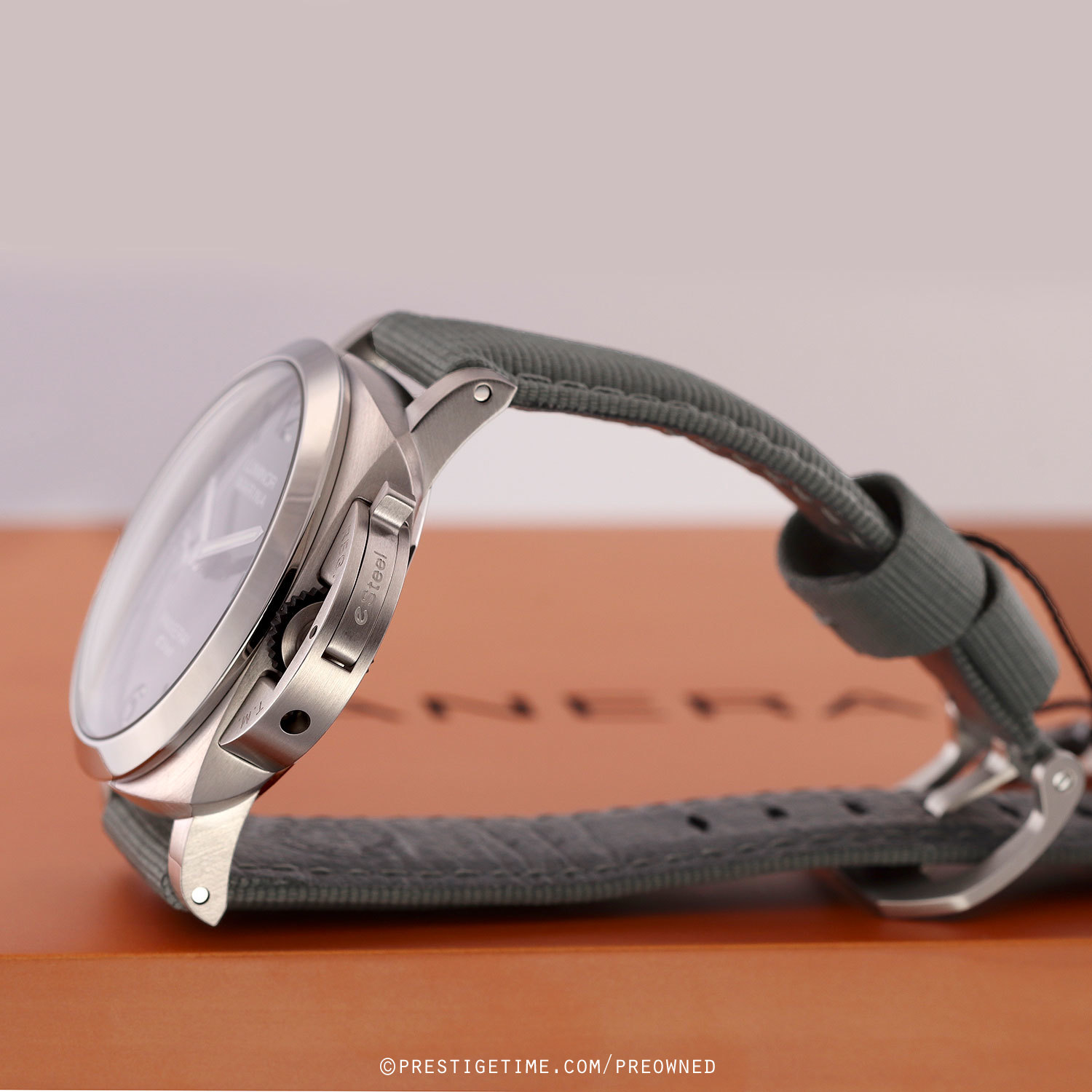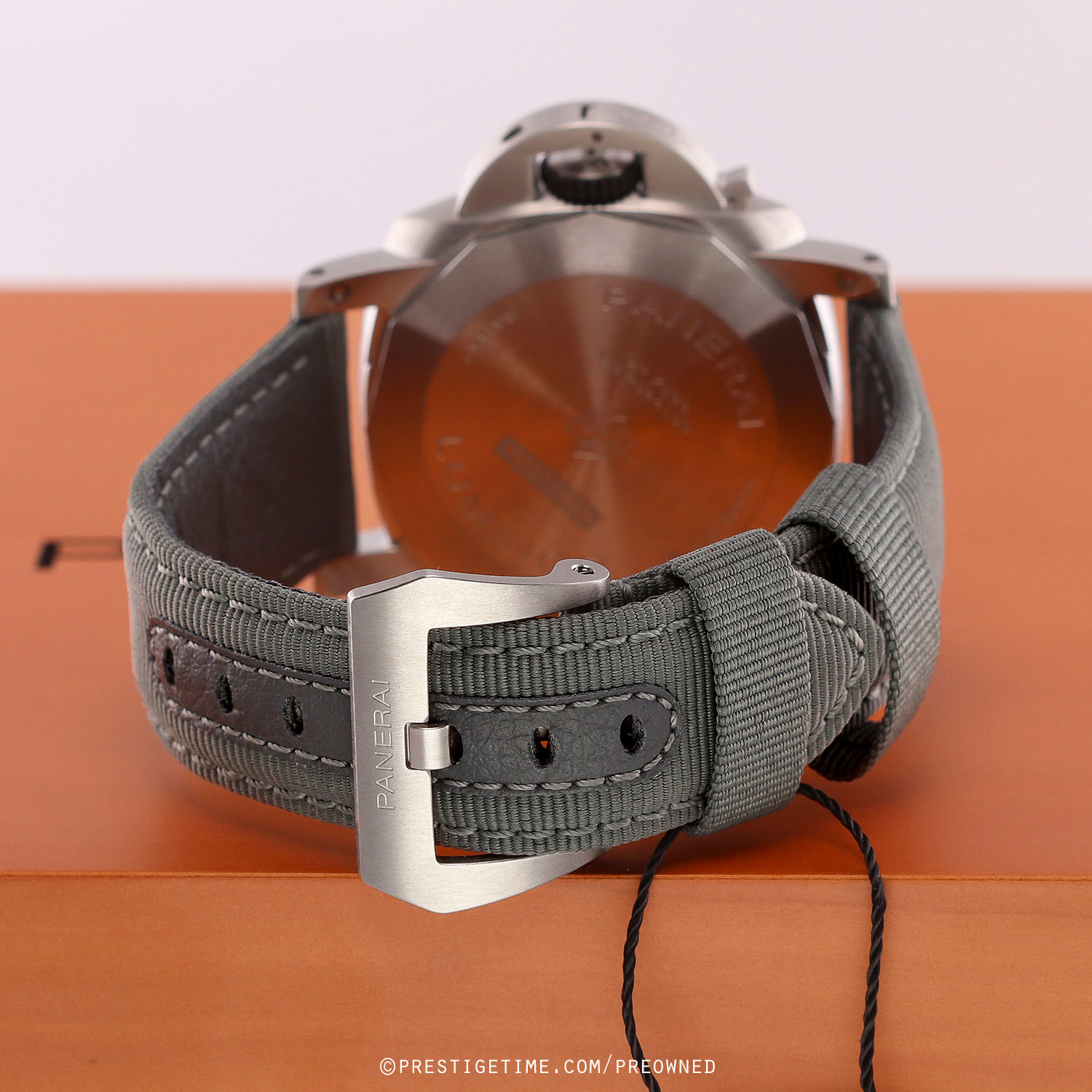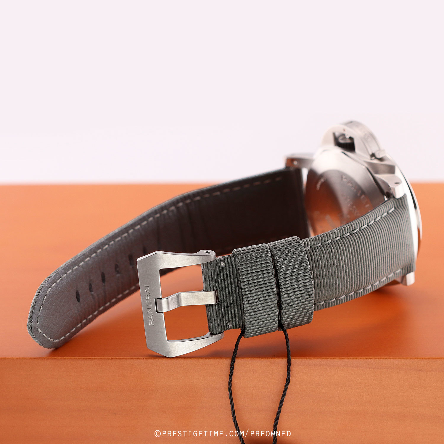 - Fitted on its original Panerai recycled PET grey rubberized strap with a stainless steel tang buckle. This strap is in new & unworn condition with its full wear lifespan remaining. This