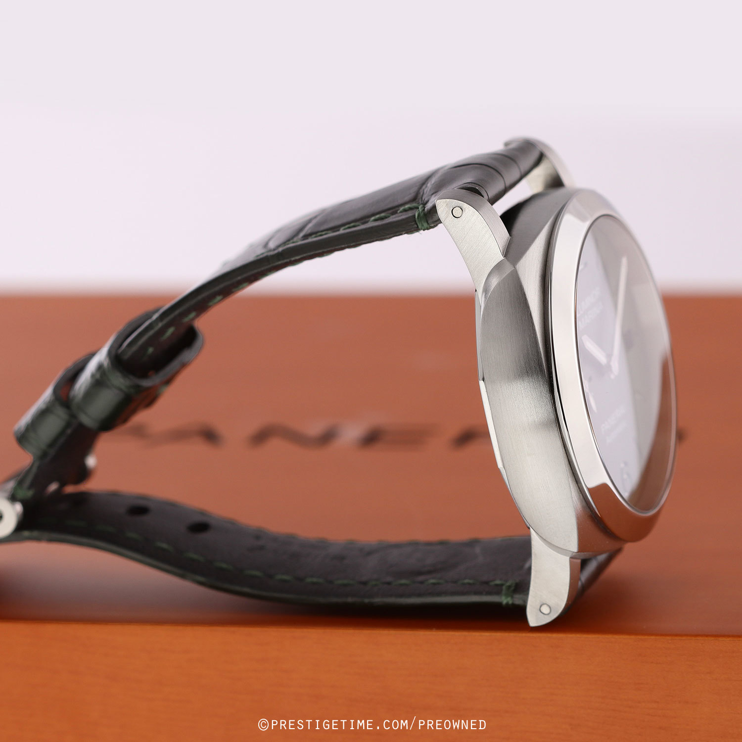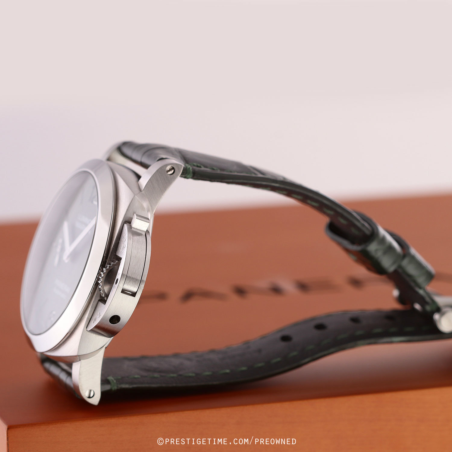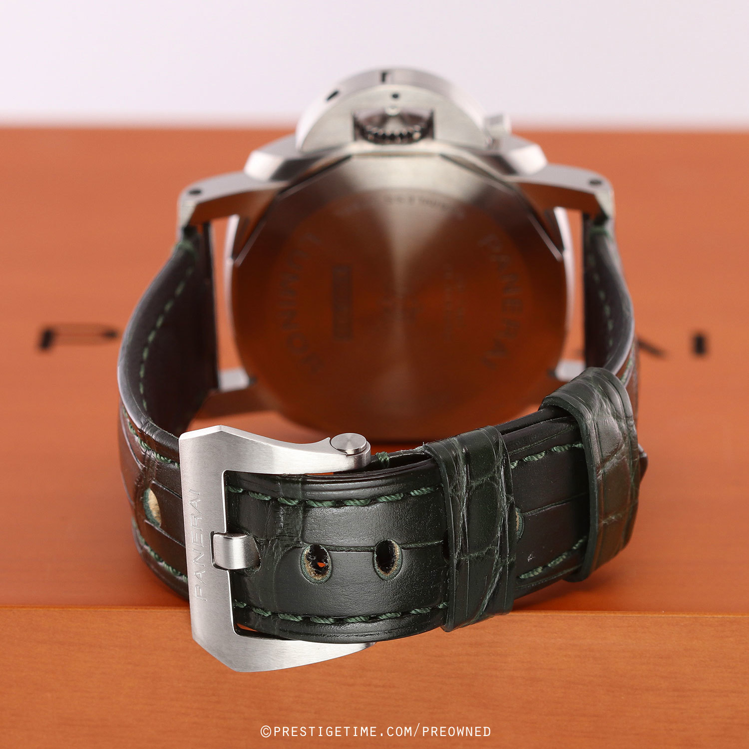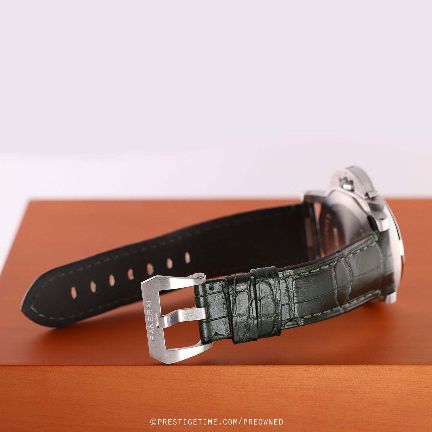 Strap: Fitted on its original Panerai green alligator leather strap with a stainless steel tang buckle. The strap is in excellent overall condition with the majority of its wear lifespan remaining. We would be comfortable rating this strap in 93% overall condition.