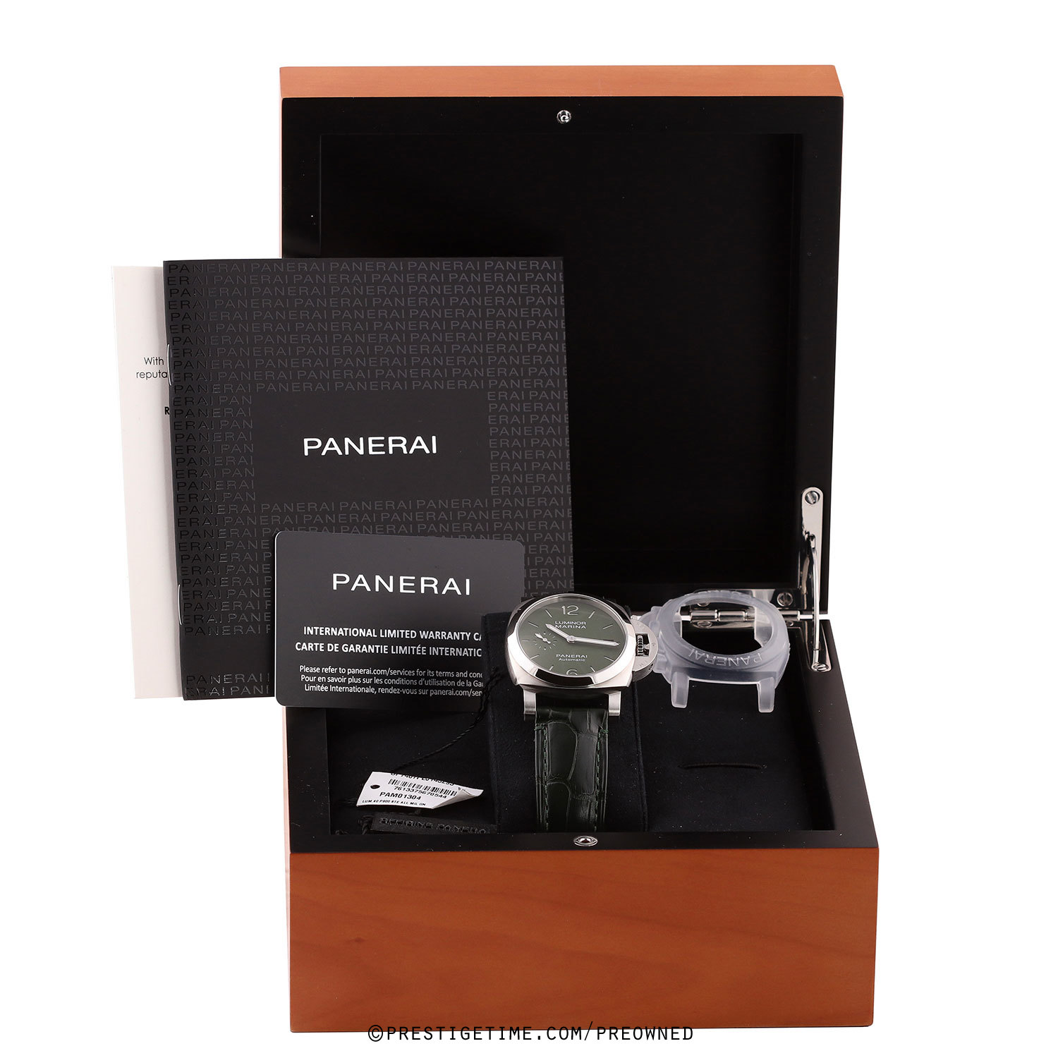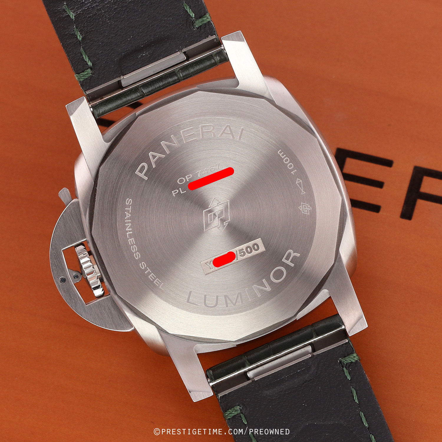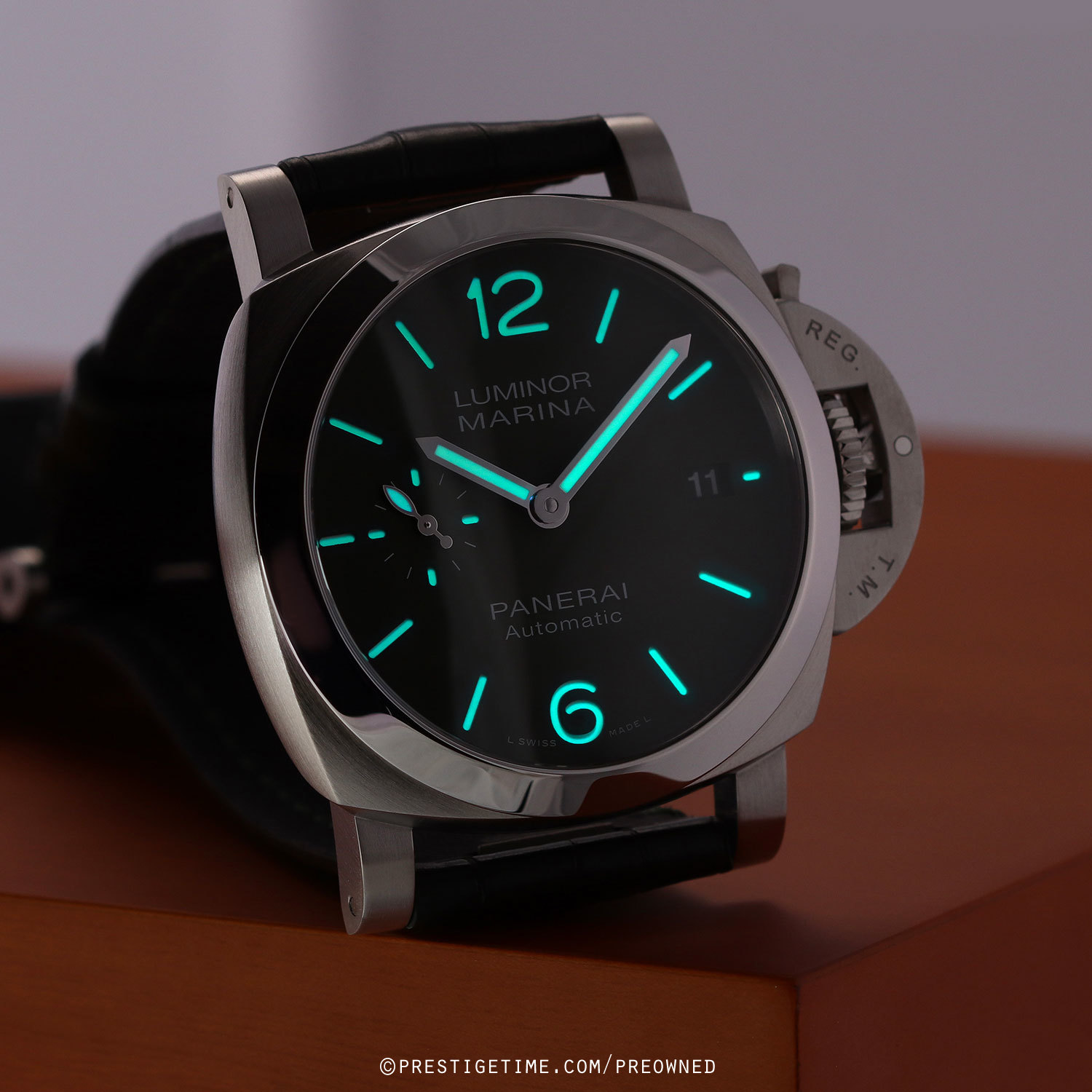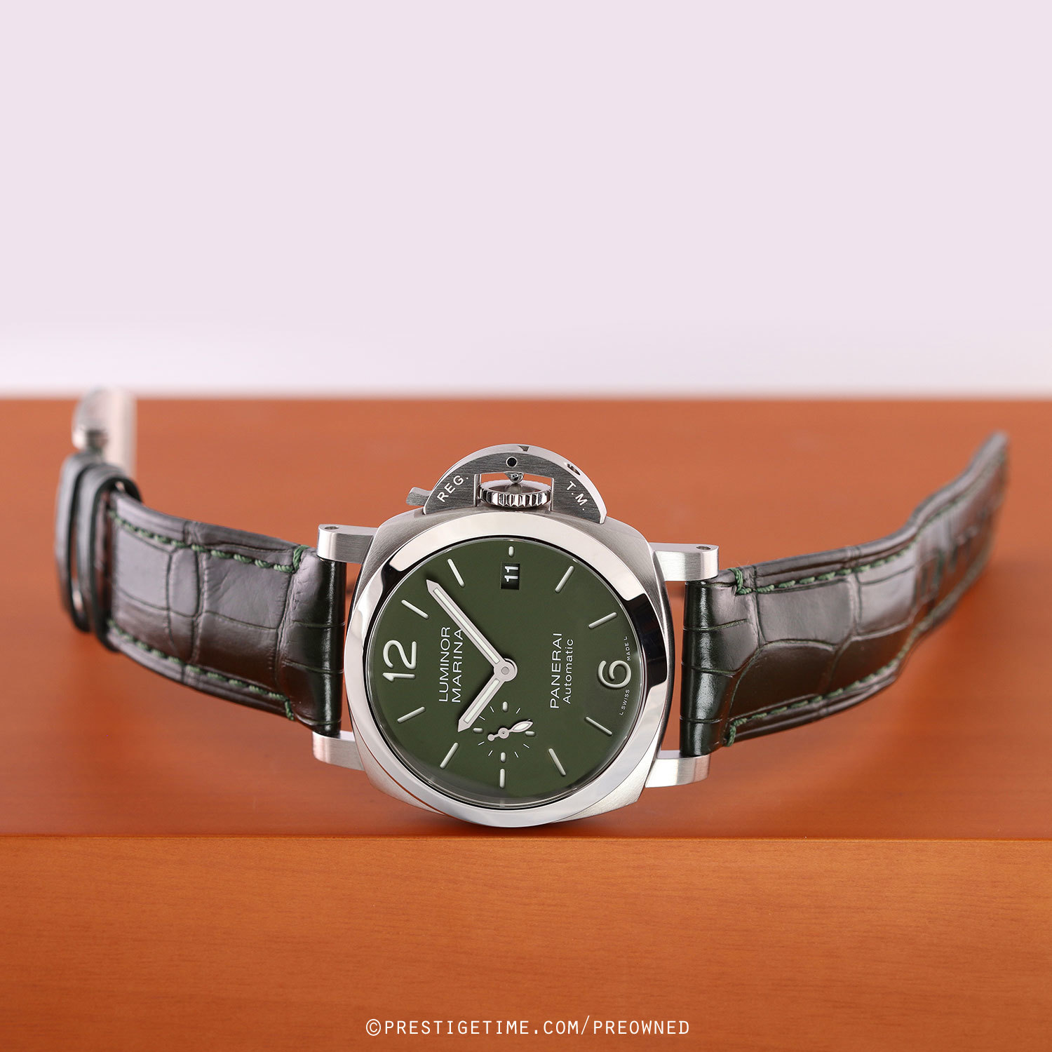 Strap: Fitted on its original Panerai green alligator leather strap with a stainless steel tang buckle. The strap is in excellent overall condition with the majority of its wear lifespan remaining. We would be comfortable rating this strap in 93% overall condition.