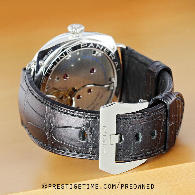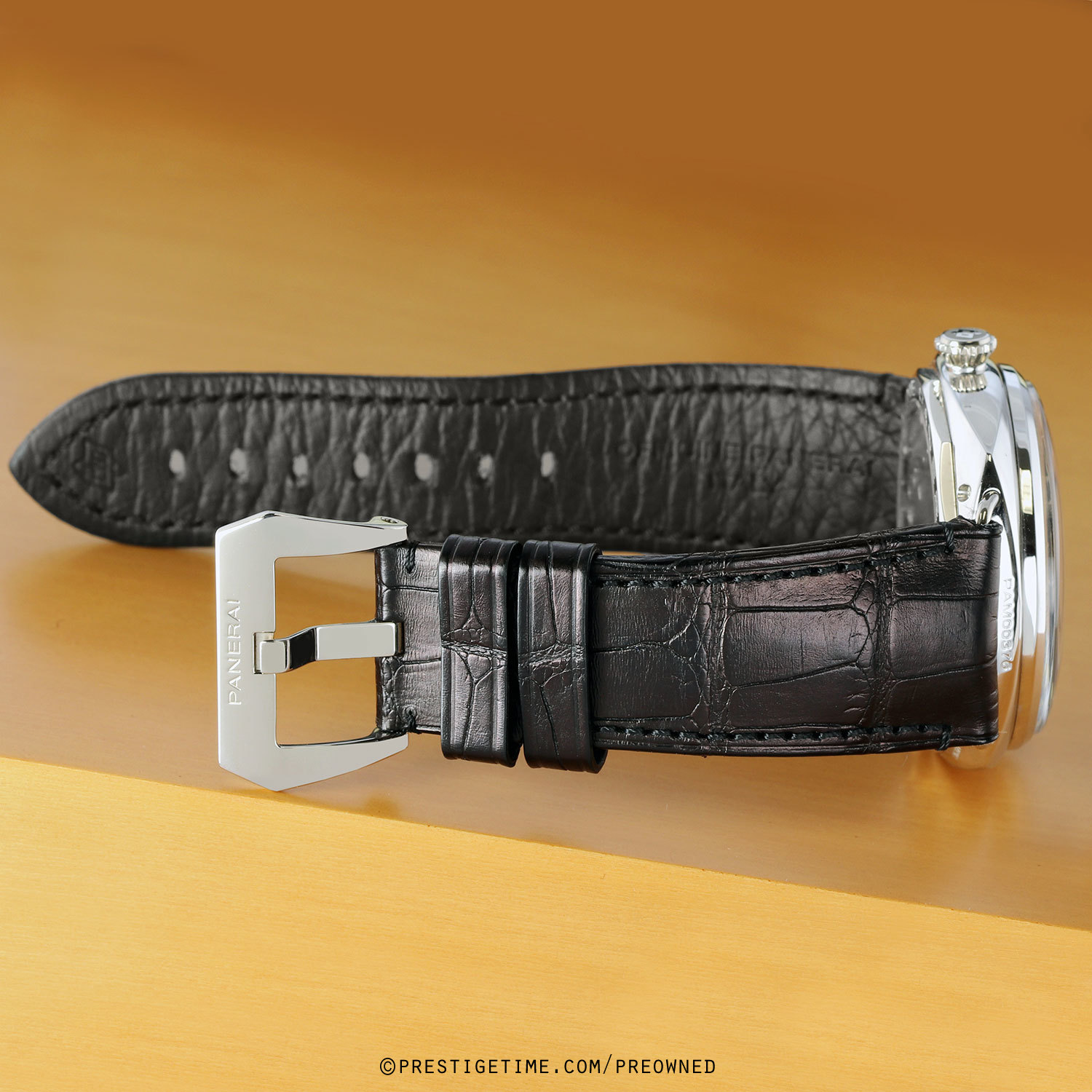 Strap: Fitted on an original Panerai dark brown alligator leather strap with a solid white gold tang buckle. The strap has developed a very light deep reddish patina/sheen. The strap is in great condition with plenty of life in it, we would grade the strap as being in 85% condition.