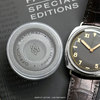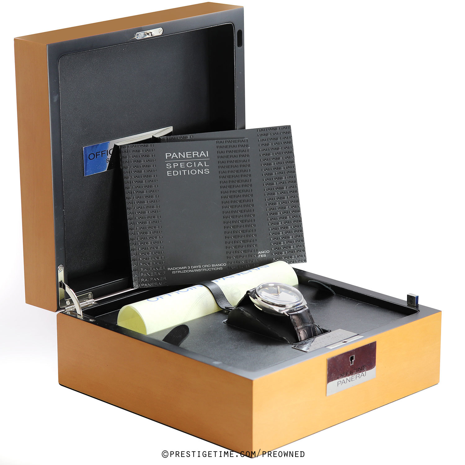 Case: Polished 18kt white gold case. Dark brown California dial. Luminous filled hour marker in a combination of Arabic numerals, Roman Numeral & indexes. Very fine printed minute track. Polished rose gold hands. The strap is attached to the watch via Panerais patented wire-loop attachments
