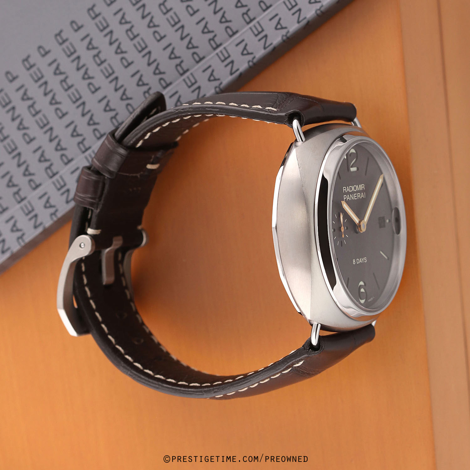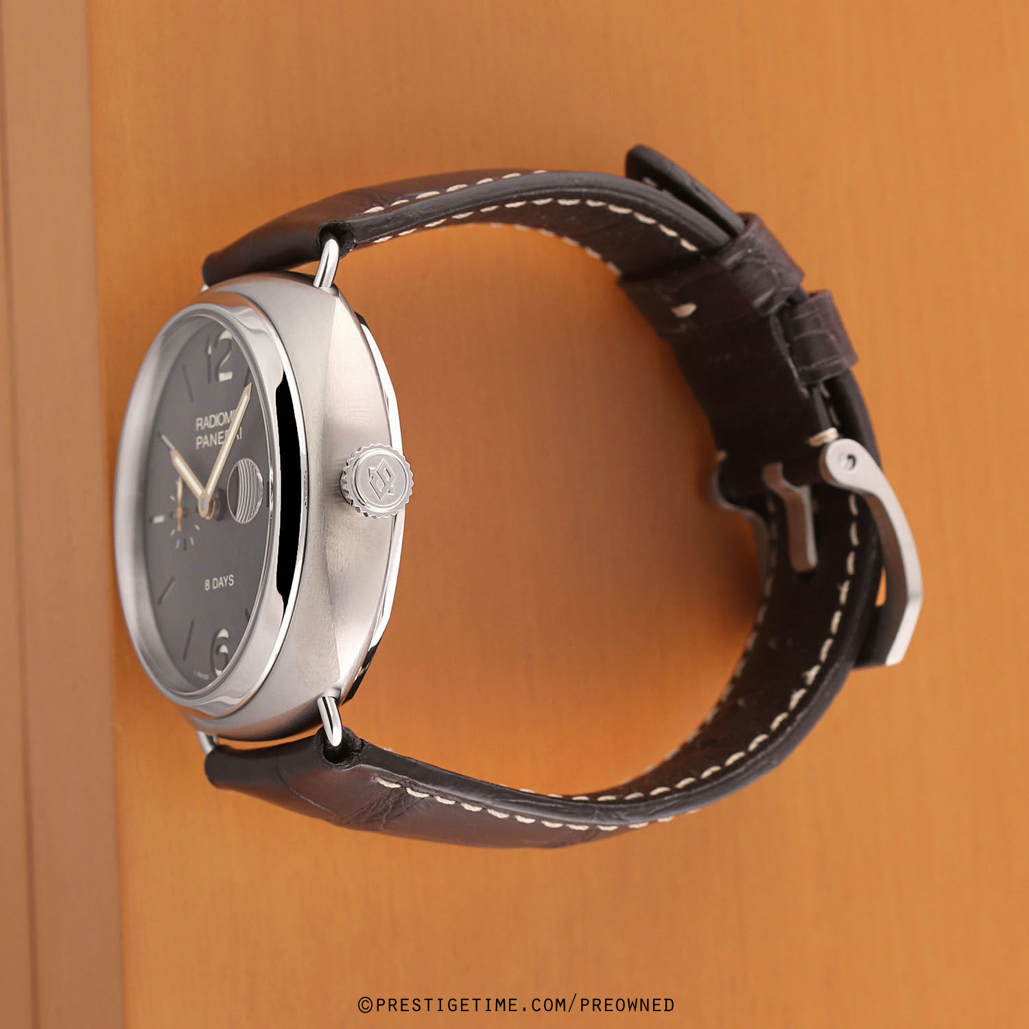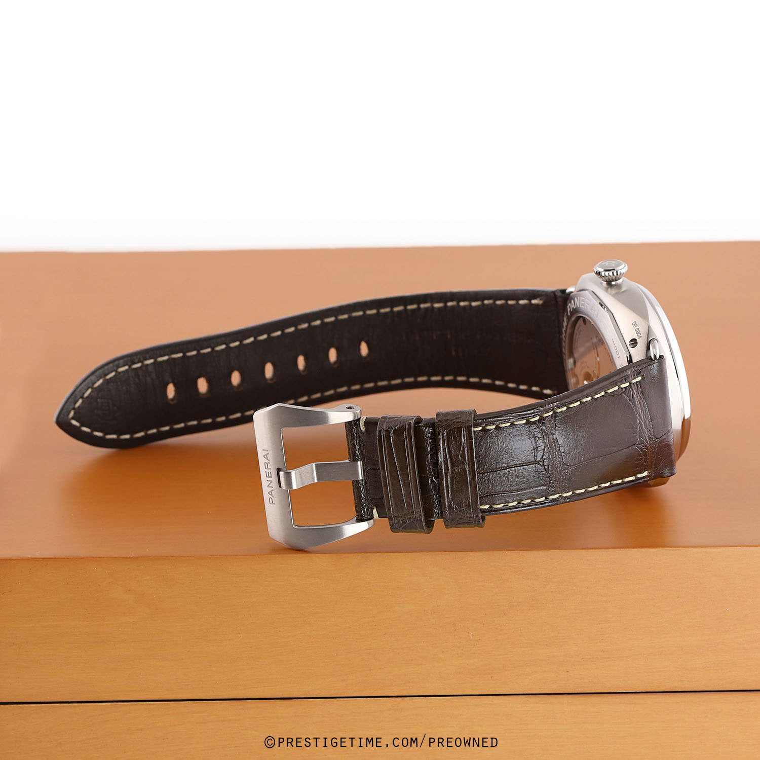 Strap: Fitted on its original Panerai brown leather strap with contrasting off-white stitching & a titanium tang buckle. The strap is excellent near-new condition with the majority of its wear lifespan remaining. We would be comfortable rating this strap as in 97%+ condition.