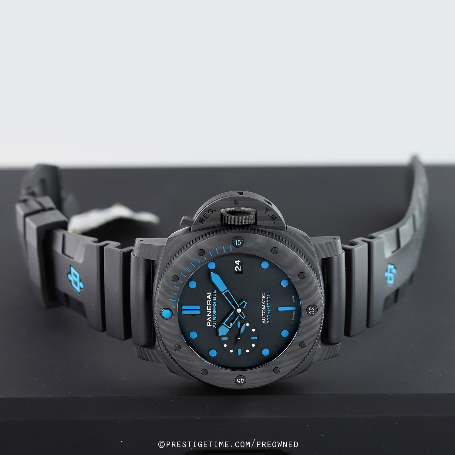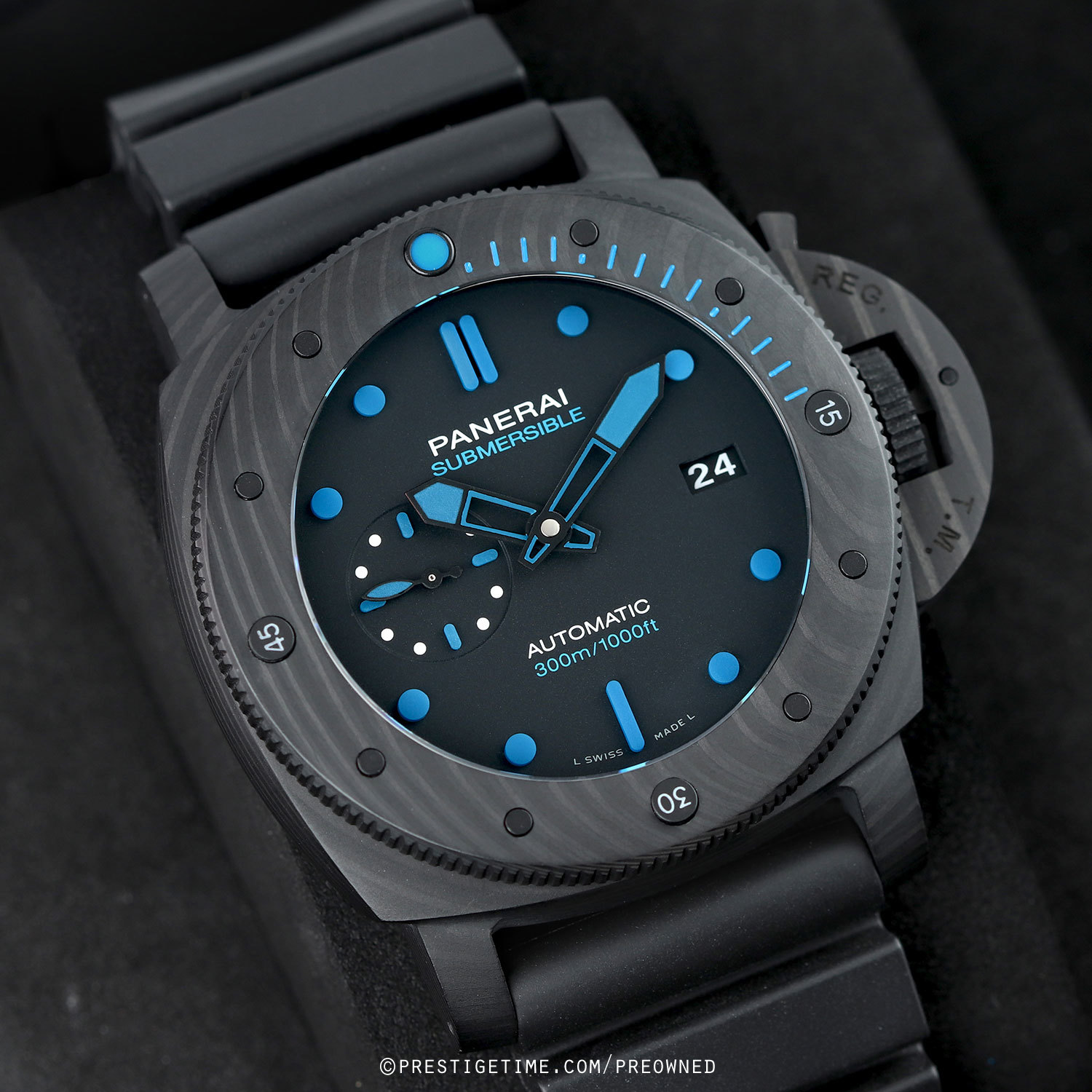 Case: Black carbotech case, bezel, crown protector & lever. Carbotech is a lightweight & durable composite material based on carbon fiber. Black titanium case back. Bezel with blue 15 seconds graduation, raised 5 minute markers & a luminous dot at the starting point. Black dial. Black hands, partially skeletonized with blue colored luminous filled tips. Applied bold blue luminous hour markers. Date window at 3 o'clock. Small seconds sub-dial at 9 o'clock.