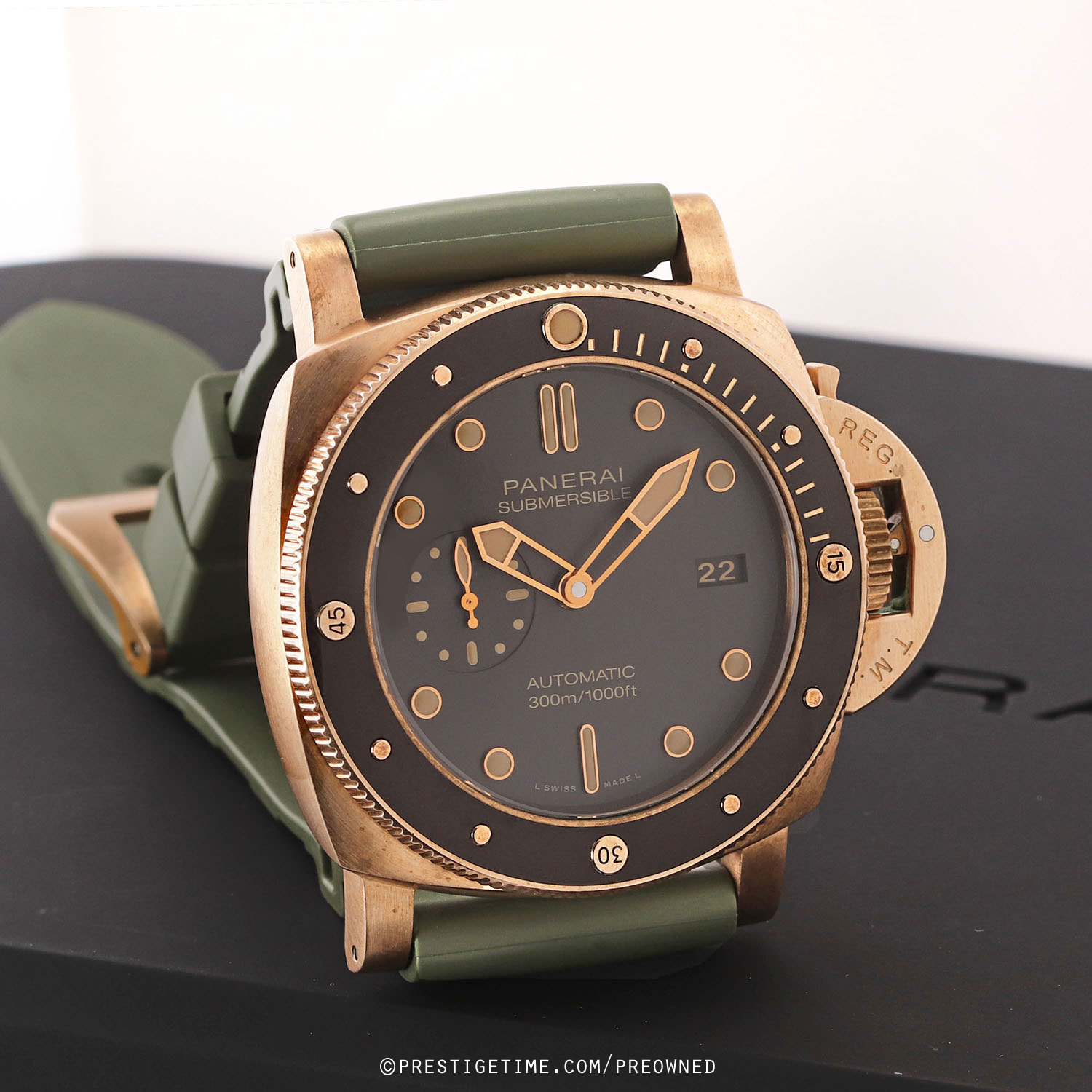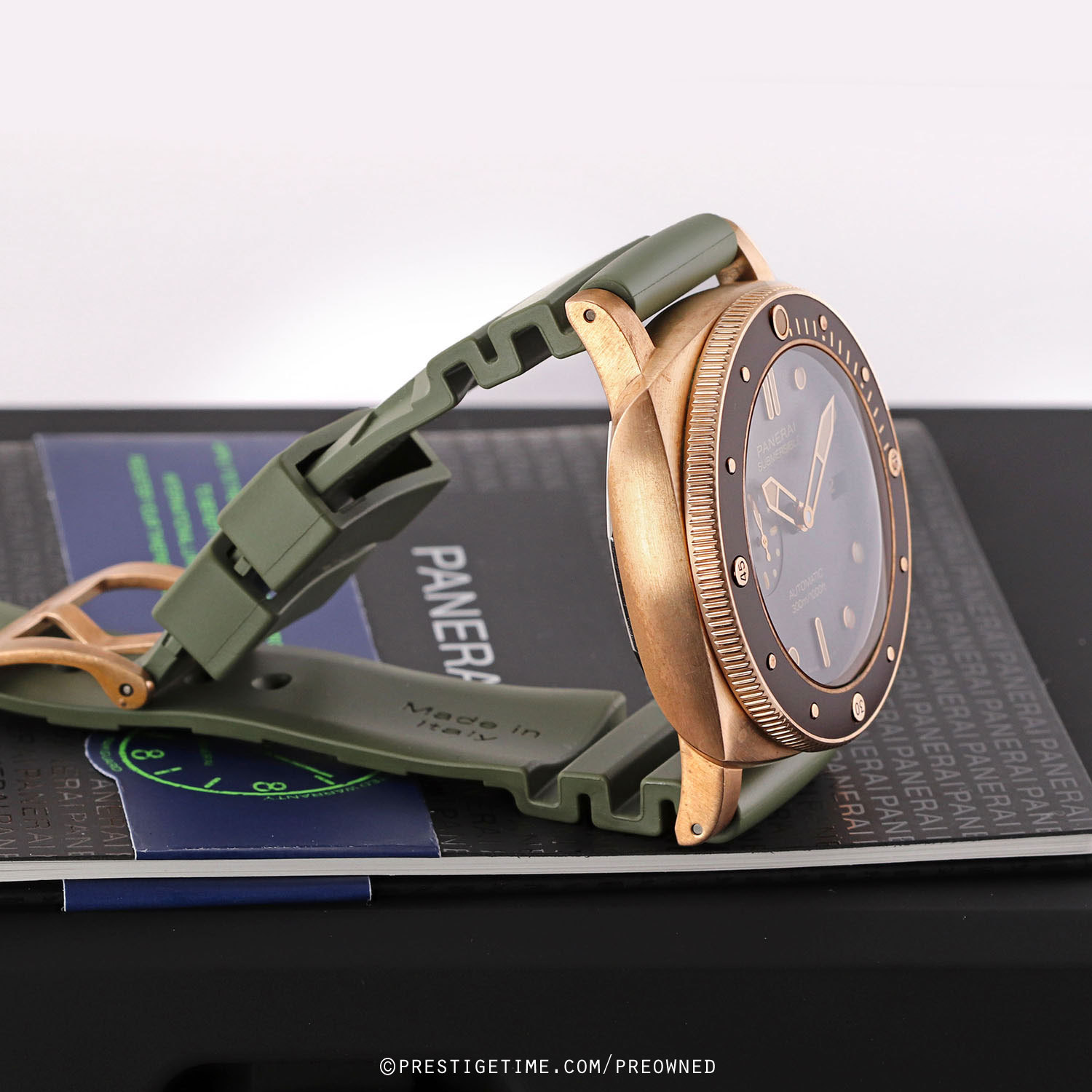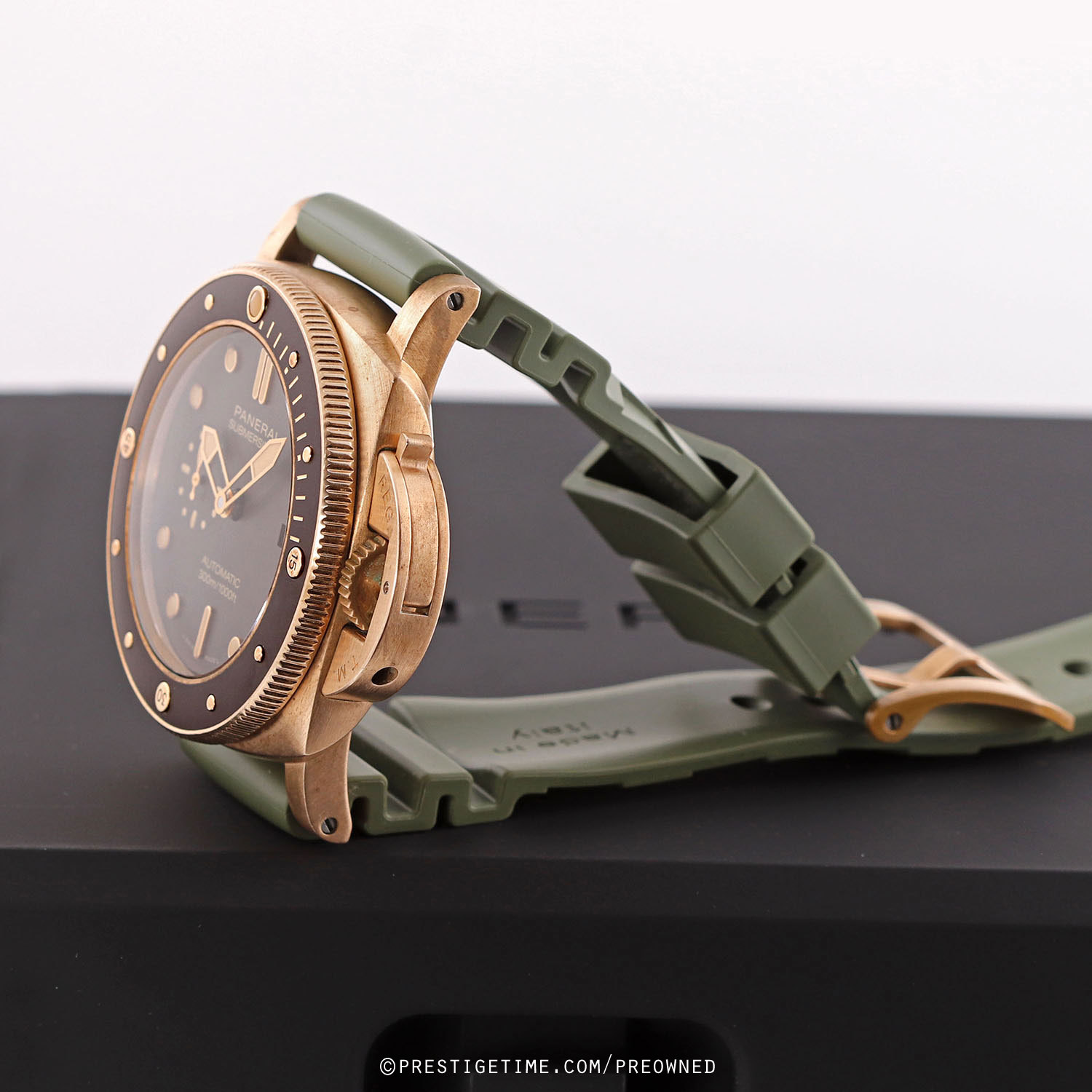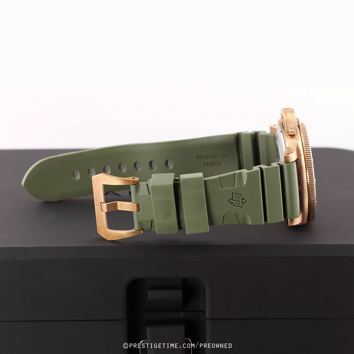 - Fitted on its original Panerai green rubber strap & a bronze tang buckle. This strap is in excellent near new condition with the majority of its wear lifespan remaining.