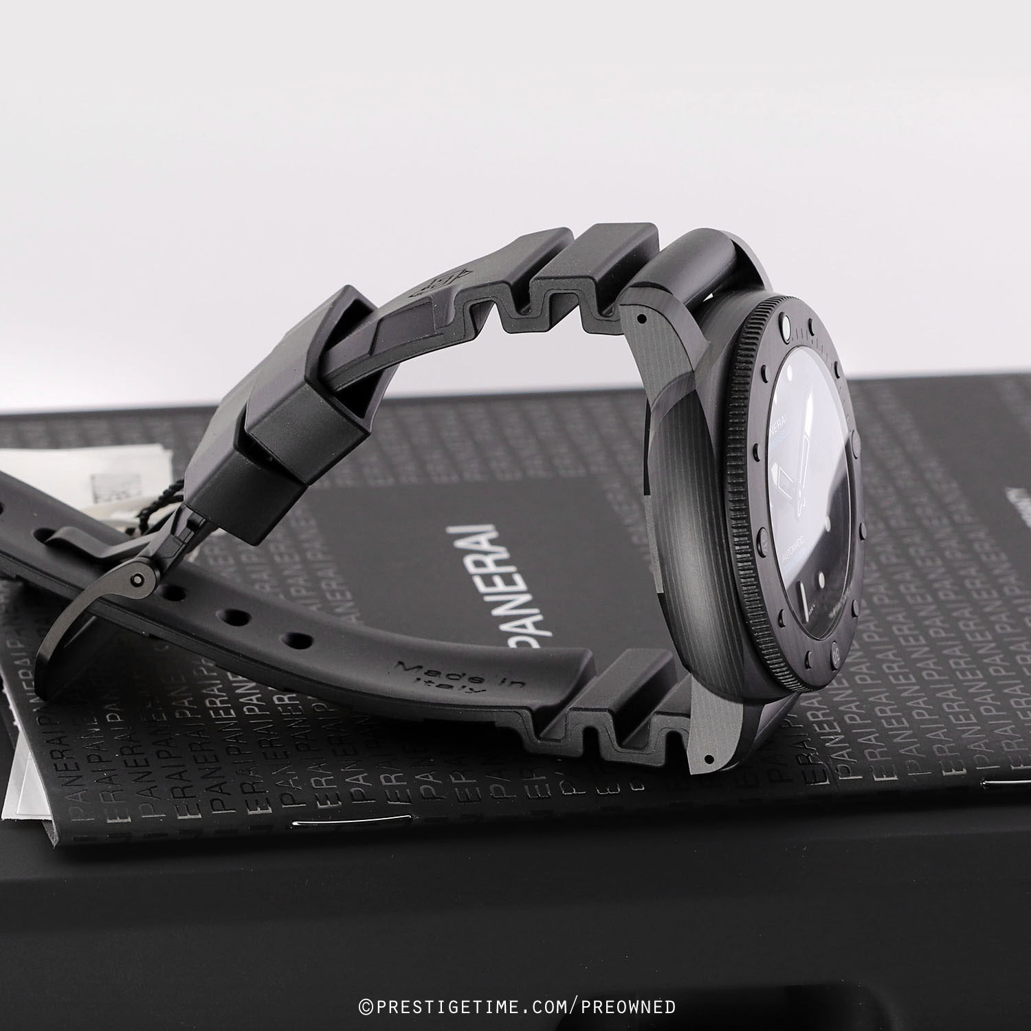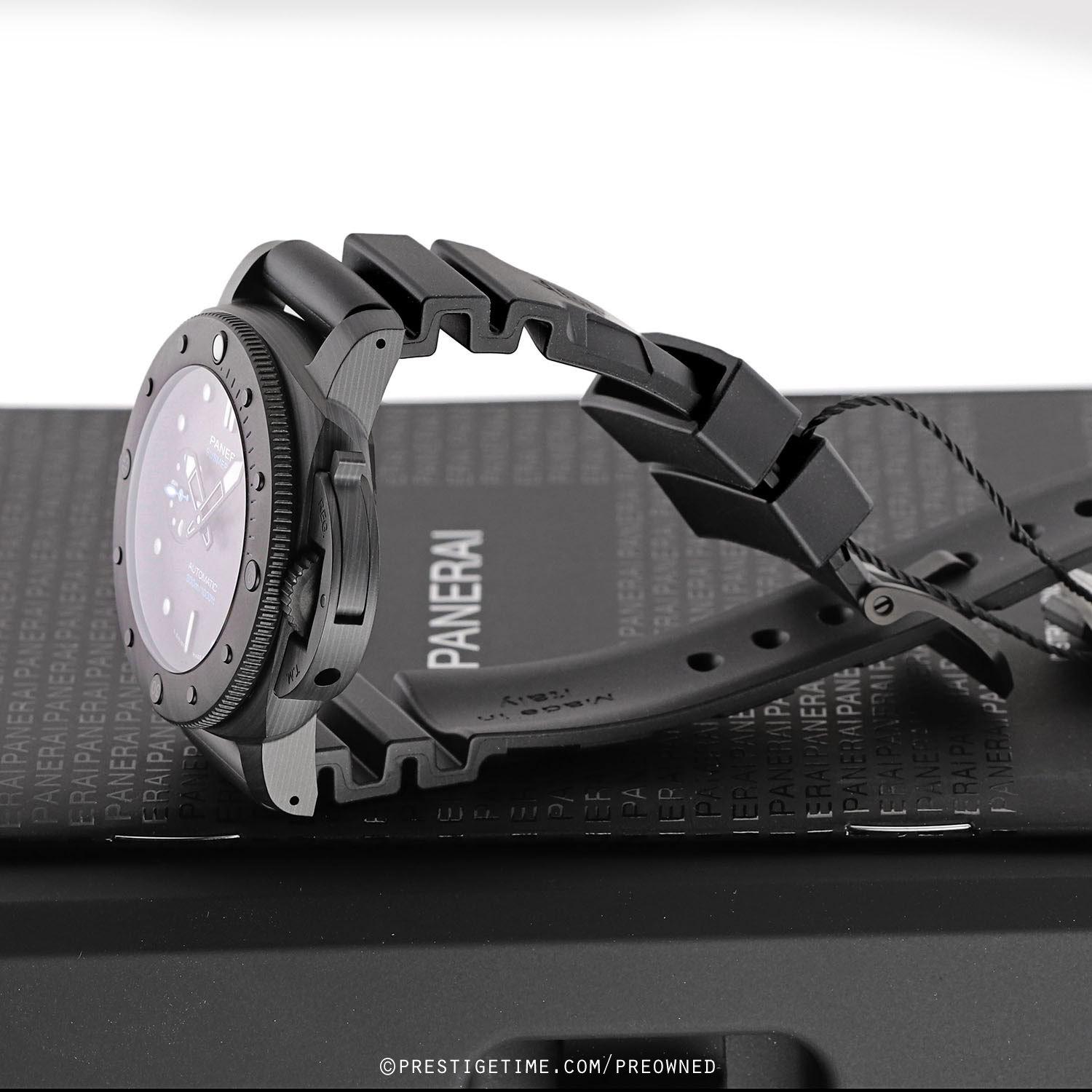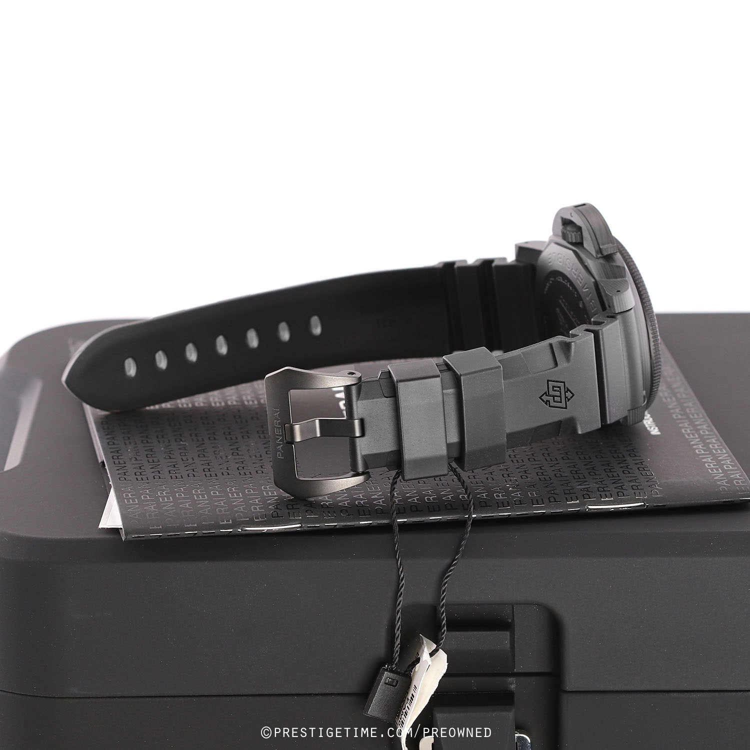 - Fitted on its original Panerai black rubber strap with black PVD coated titanium tang buckle. This strap is brand new & unworn with its full wear-lifespan remaining.