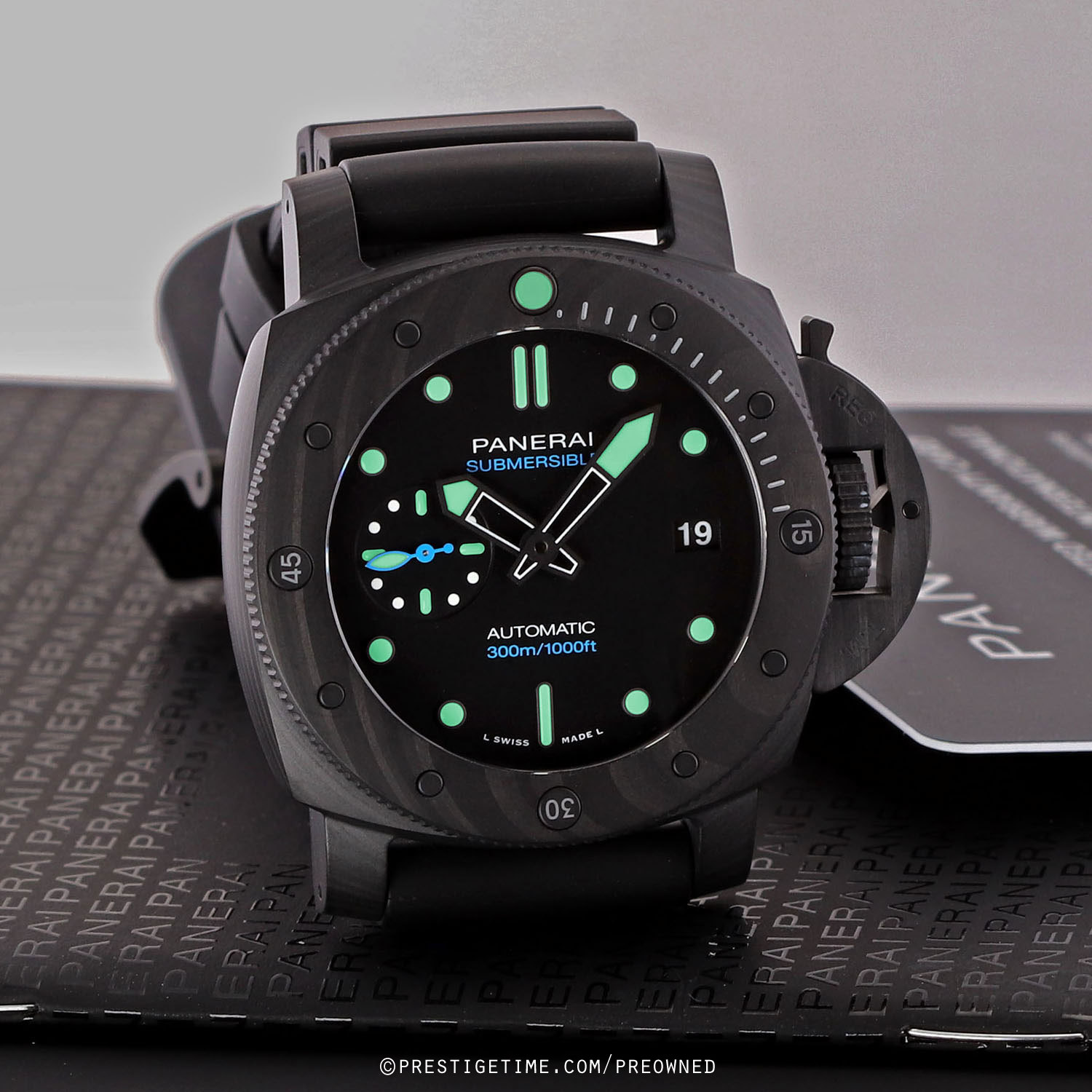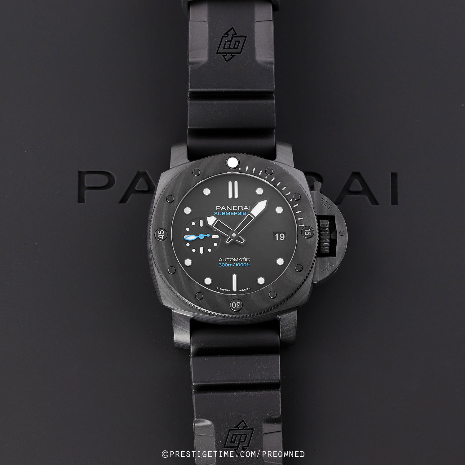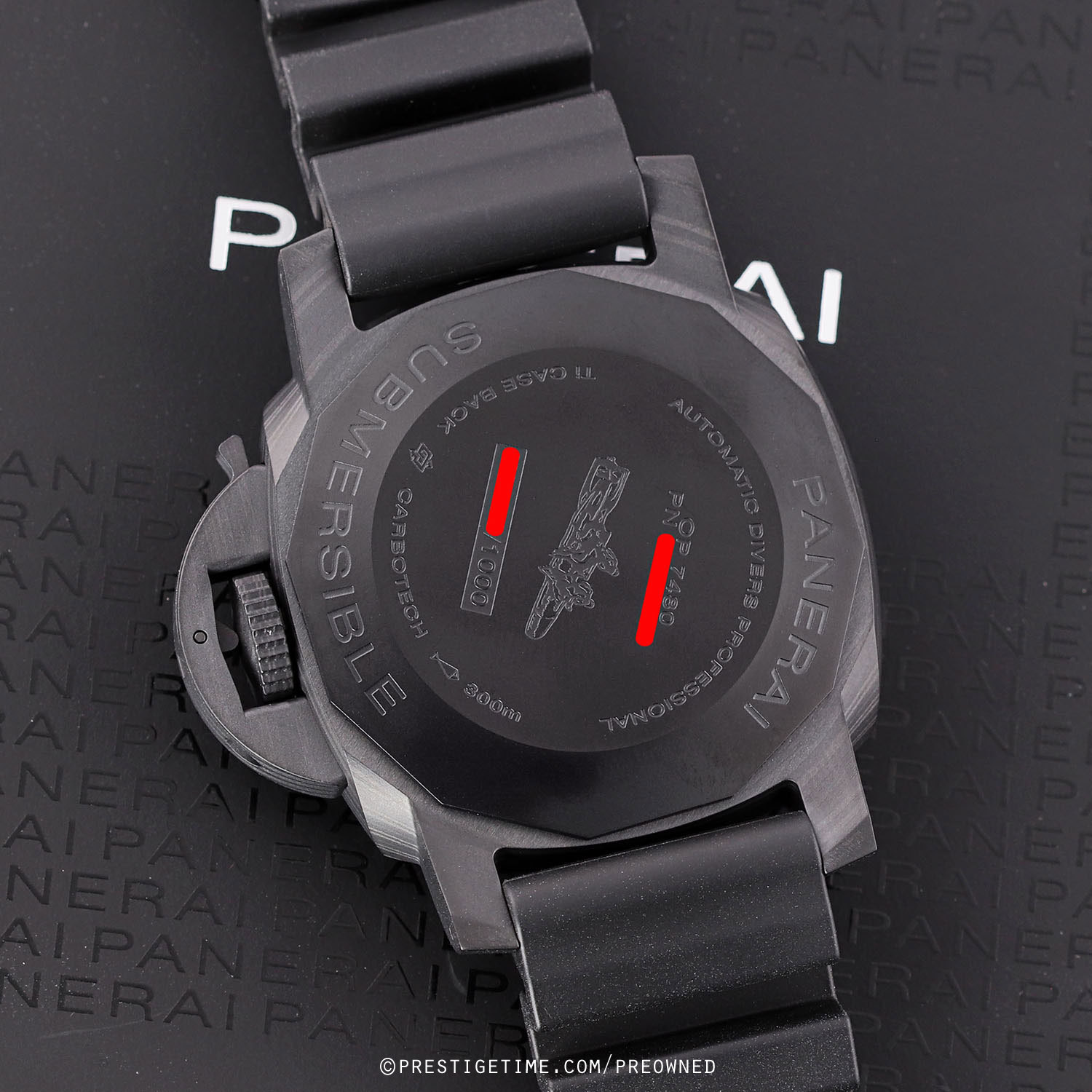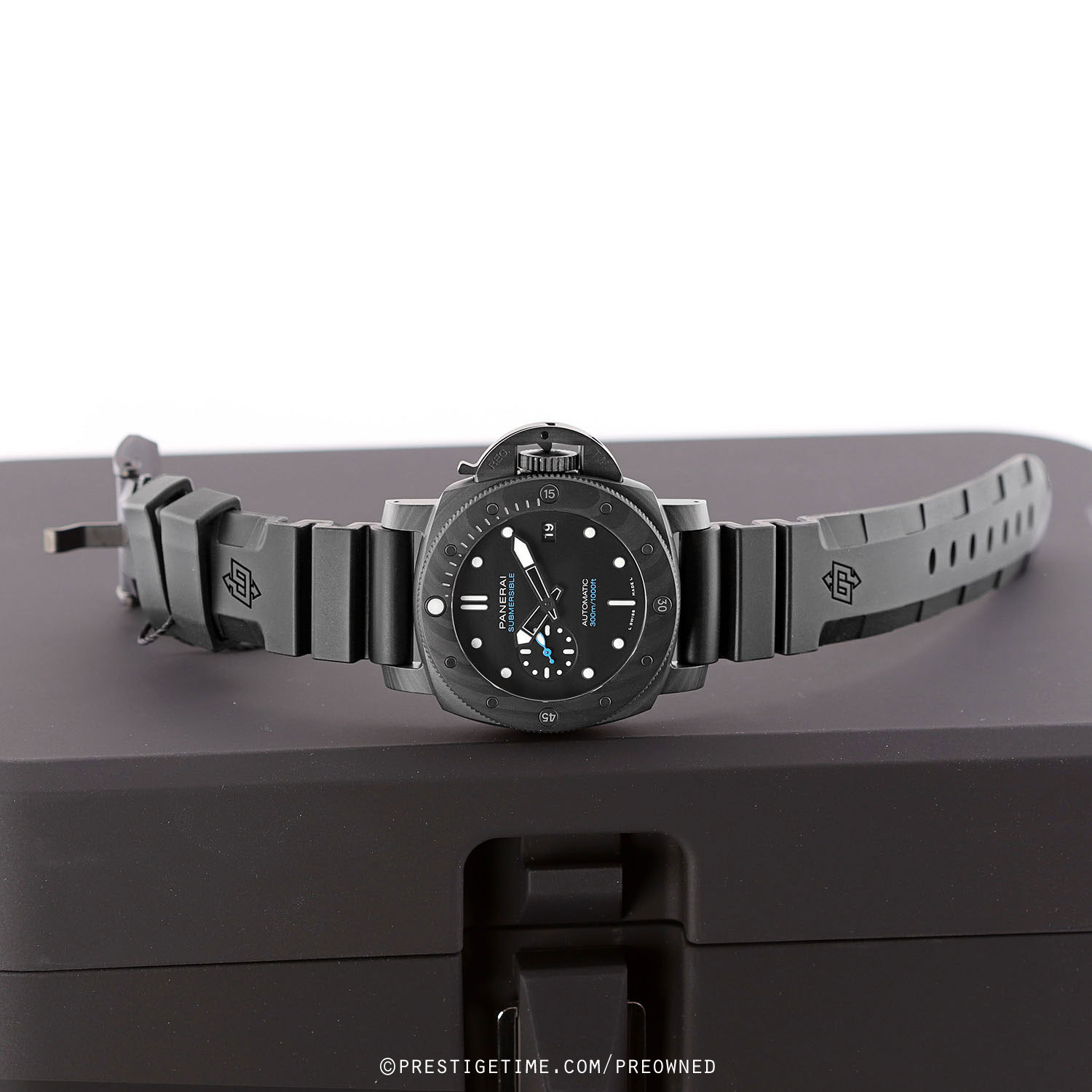 - Fitted on its original Panerai black rubber strap with black PVD coated titanium tang buckle. This strap is brand new & unworn with its full wear-lifespan remaining.