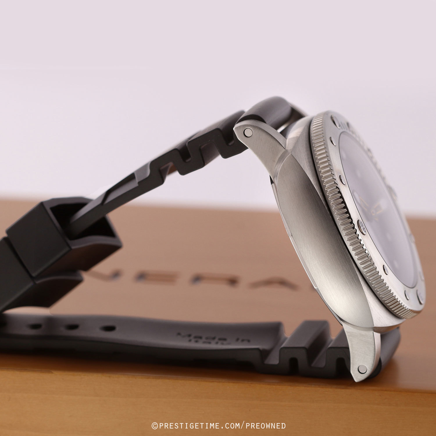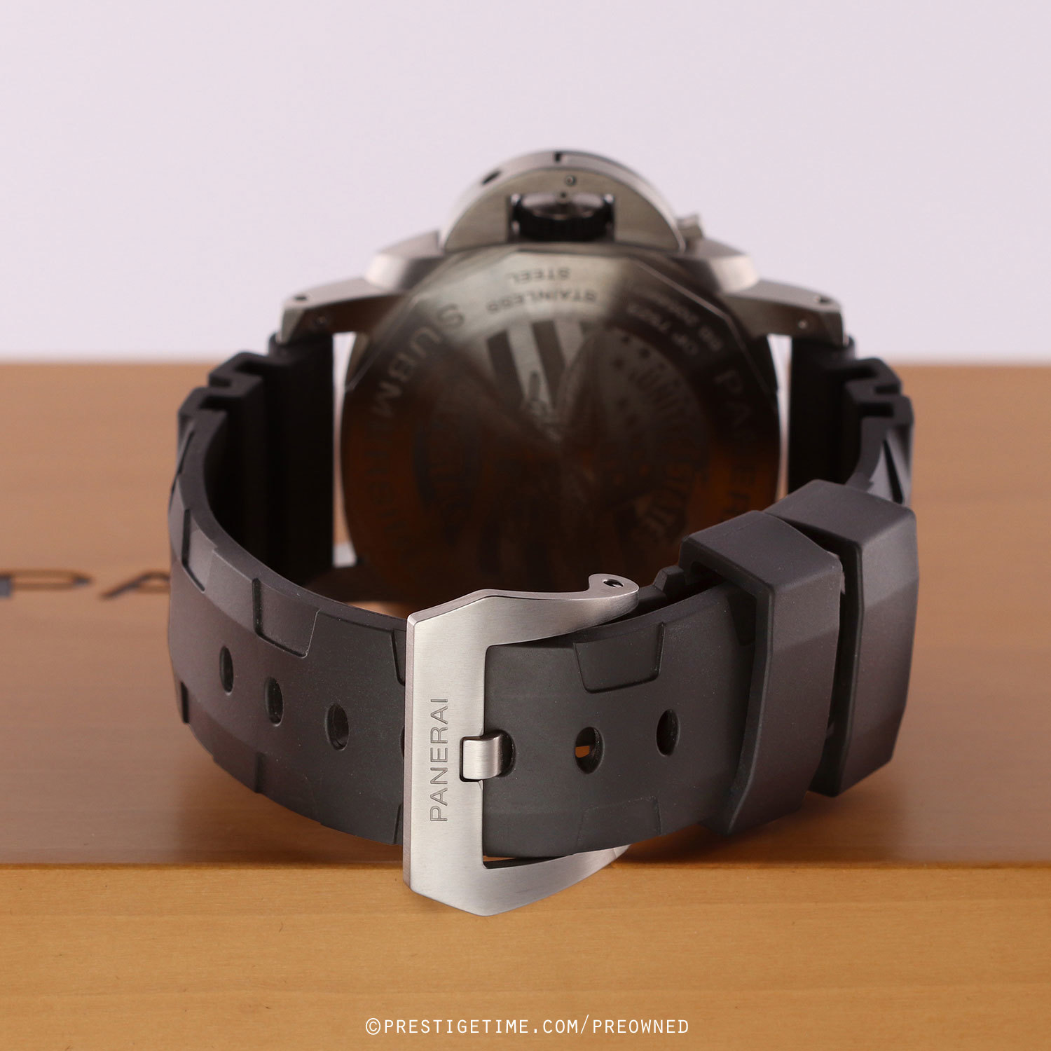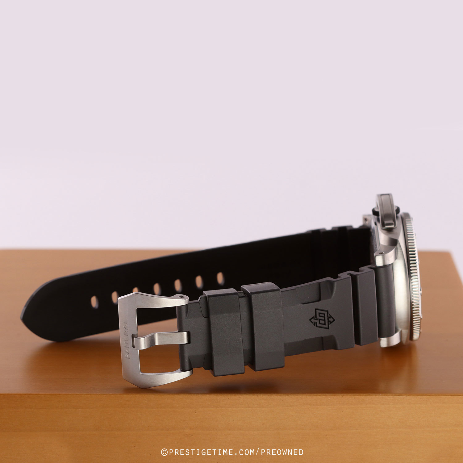- Fitted on its original Panerai black rubber strap with a stainless steel tang buckle. This strap is in pristine, near brand new condition with its full wear-lifespan remaining. We would be comfortable rating this strap in 99% overall condition.