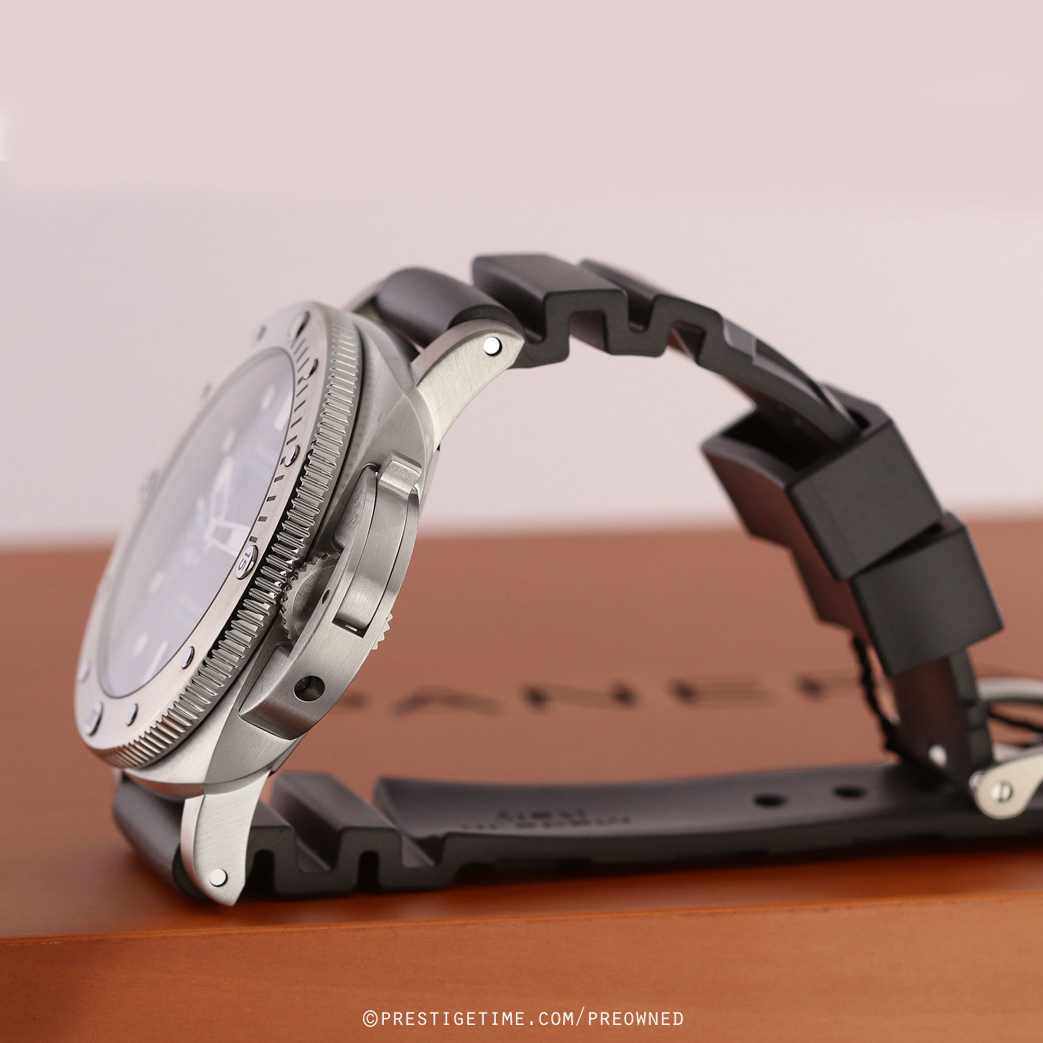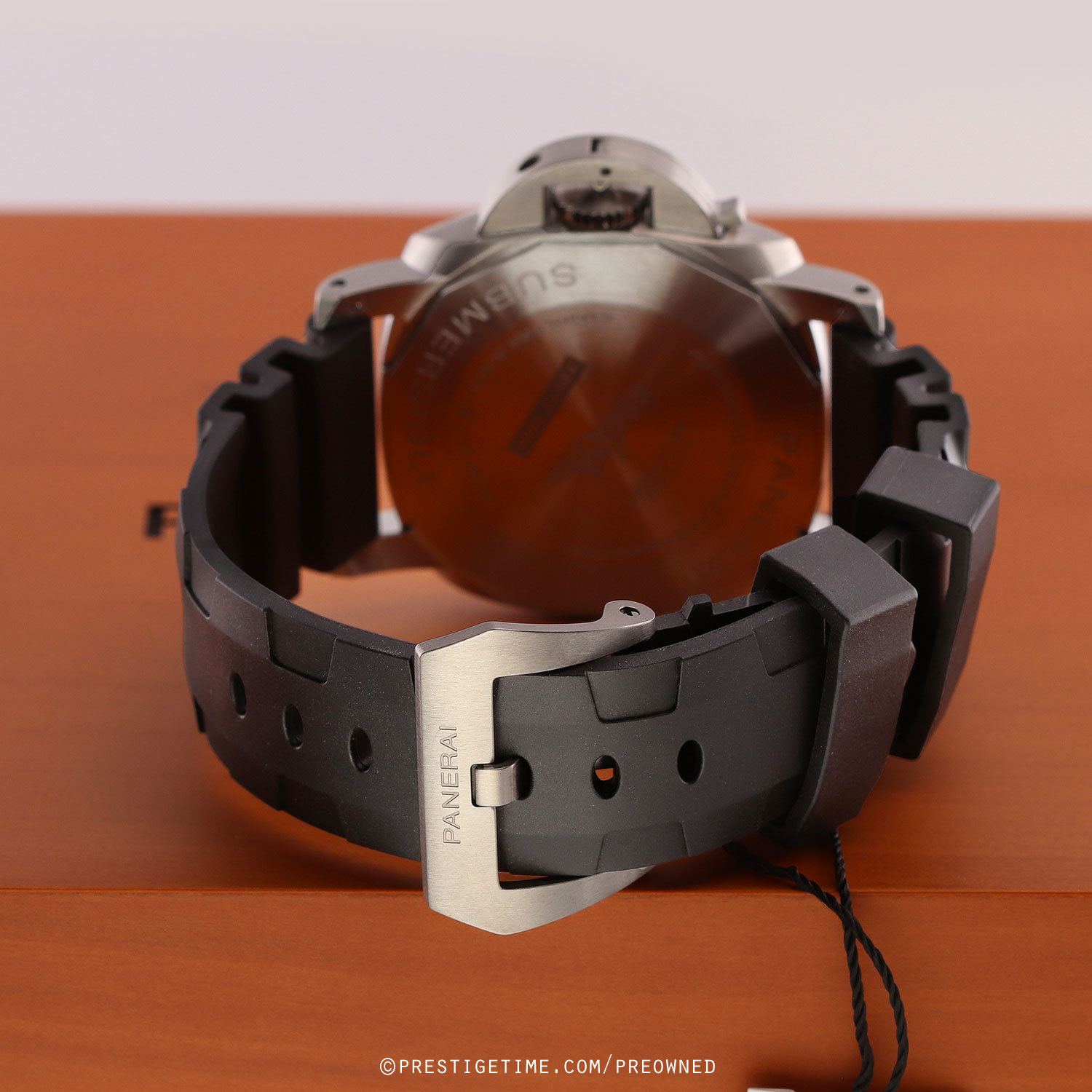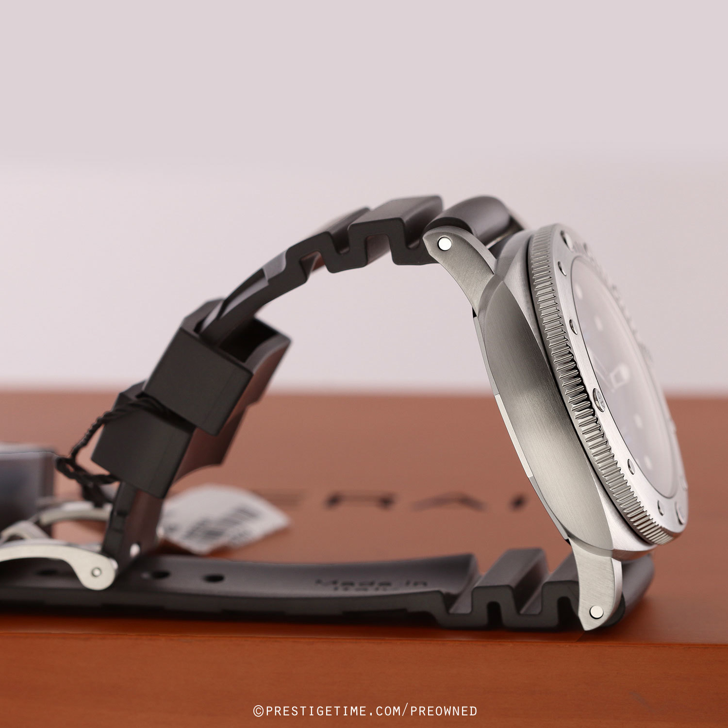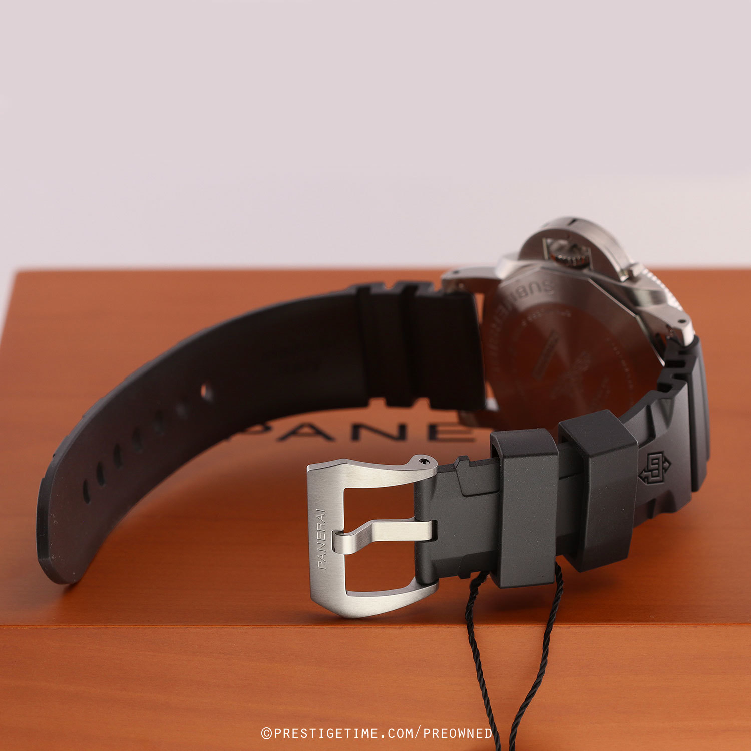 - Fitted on its original Panerai black rubber strap with a stainless steel tang buckle. This strap is brand new & unworn with its full wear-lifespan remaining.