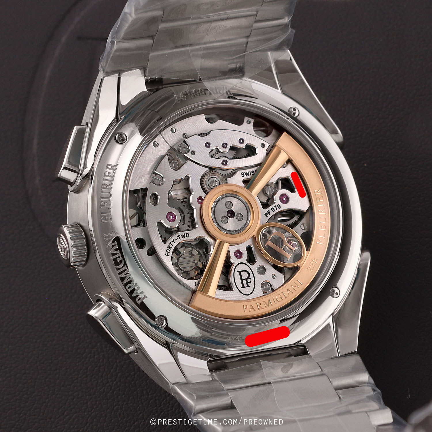 Movement: Powered by a Parmigiani in-house caliber PF070, COSC Certified Chronometer, beats at 36,000 vph (5Hz), composed of 315 parts, contains 42 jewels & has a power reserve of +/- 65 hours. The skeletonized rotor is made of solid 22kt gold.