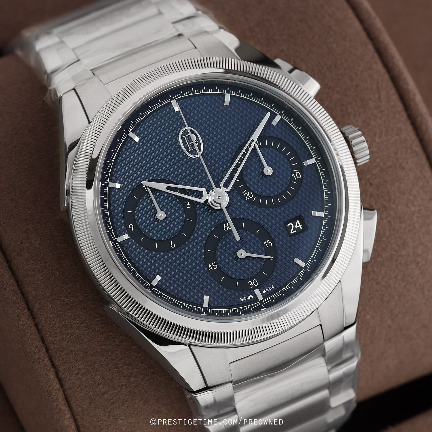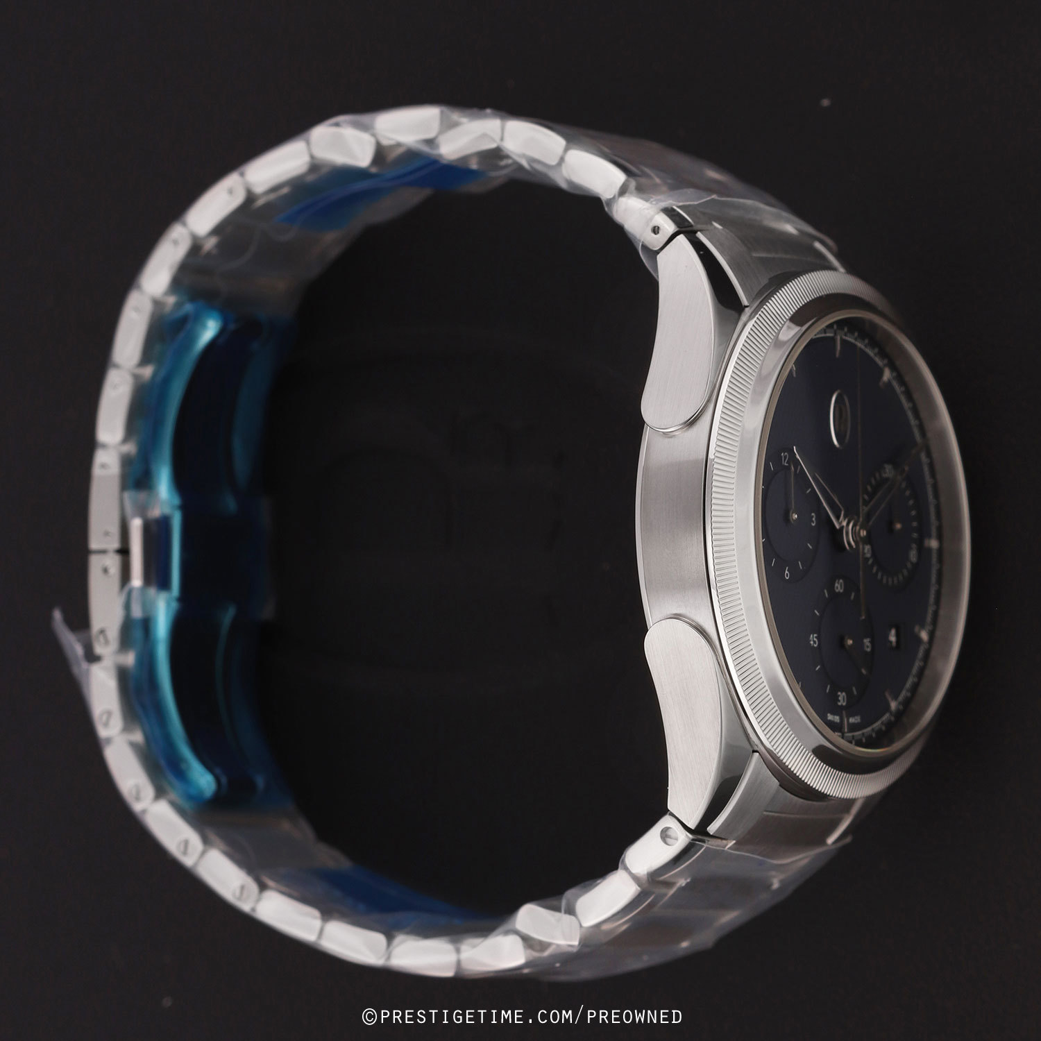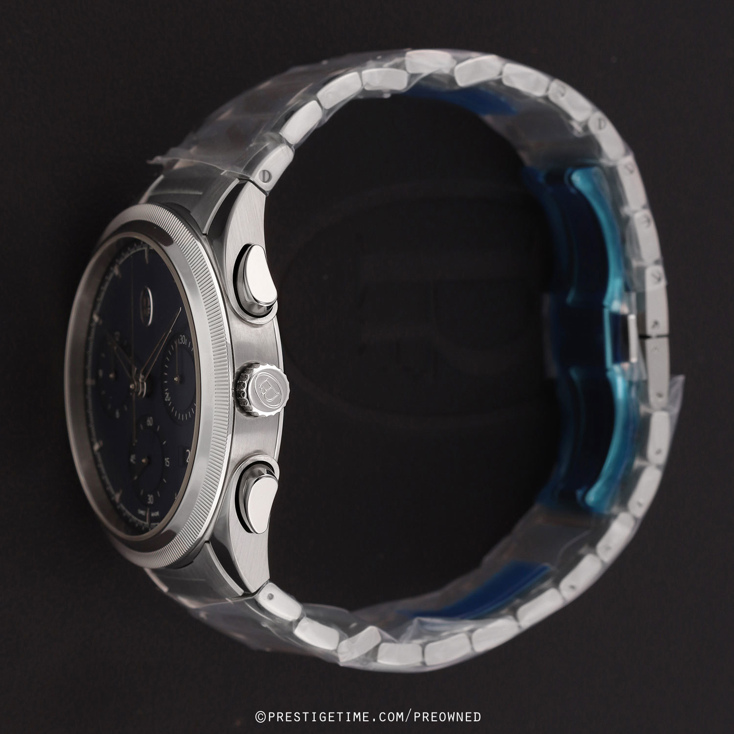 Case: Polished & brushed stainless steel case. Solid 950 platinum fluted bezel ring. Milano blue dial with a fine grain guilloche pattern. Polished white gold hands. Applied polished white gold index hour markers. Flat dial perimeter with fine printed minutes/seconds & fractions of a seconds track. Small seconds sub-dial at 6 o'clock. Date window between 3 & 4 o'clock.