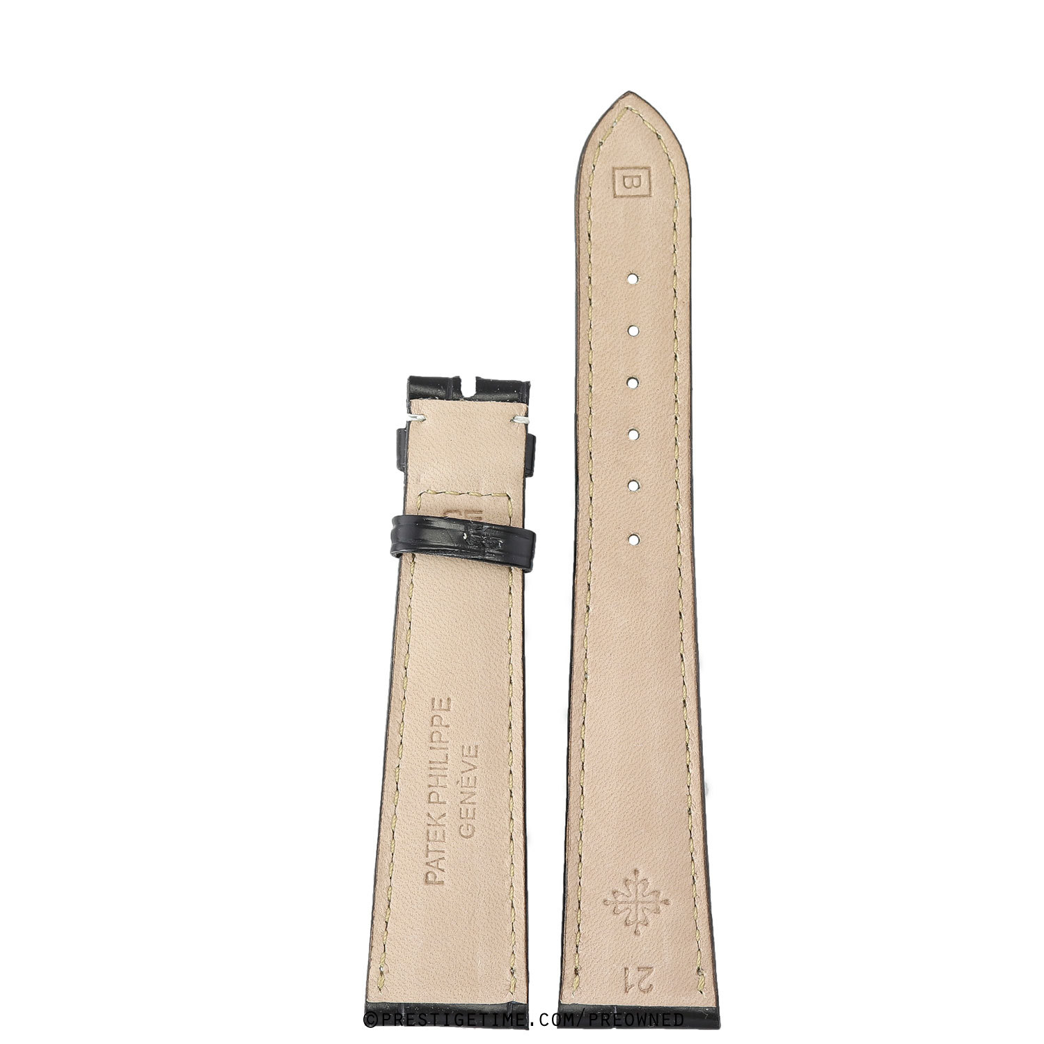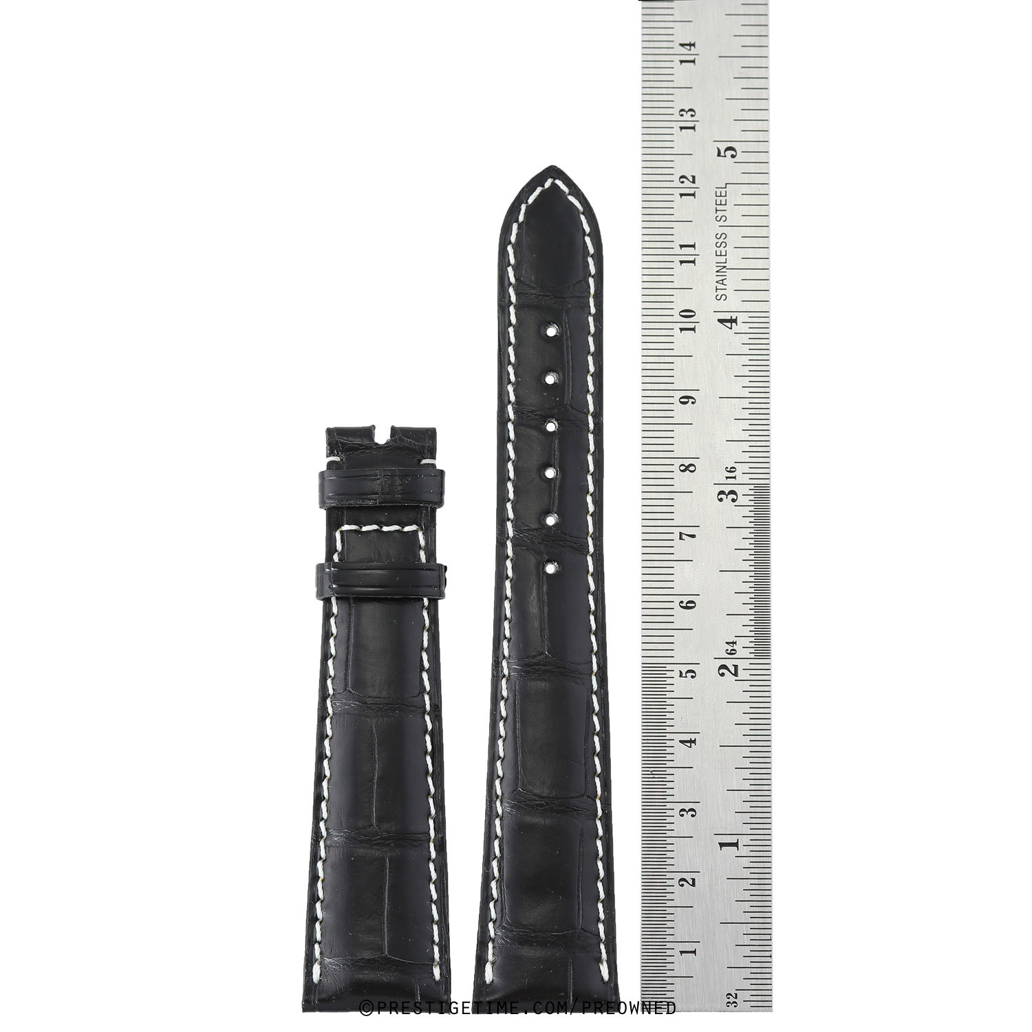 Genuine Patek Philippe matte black alligator strap with white stitching.