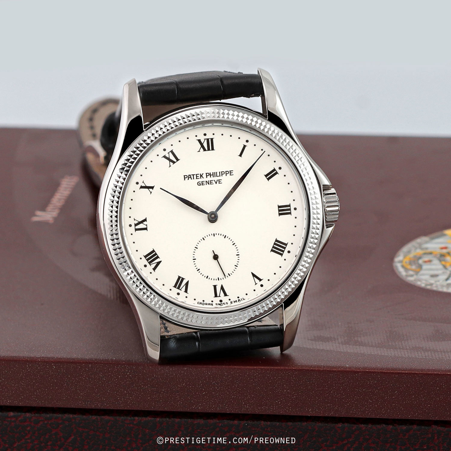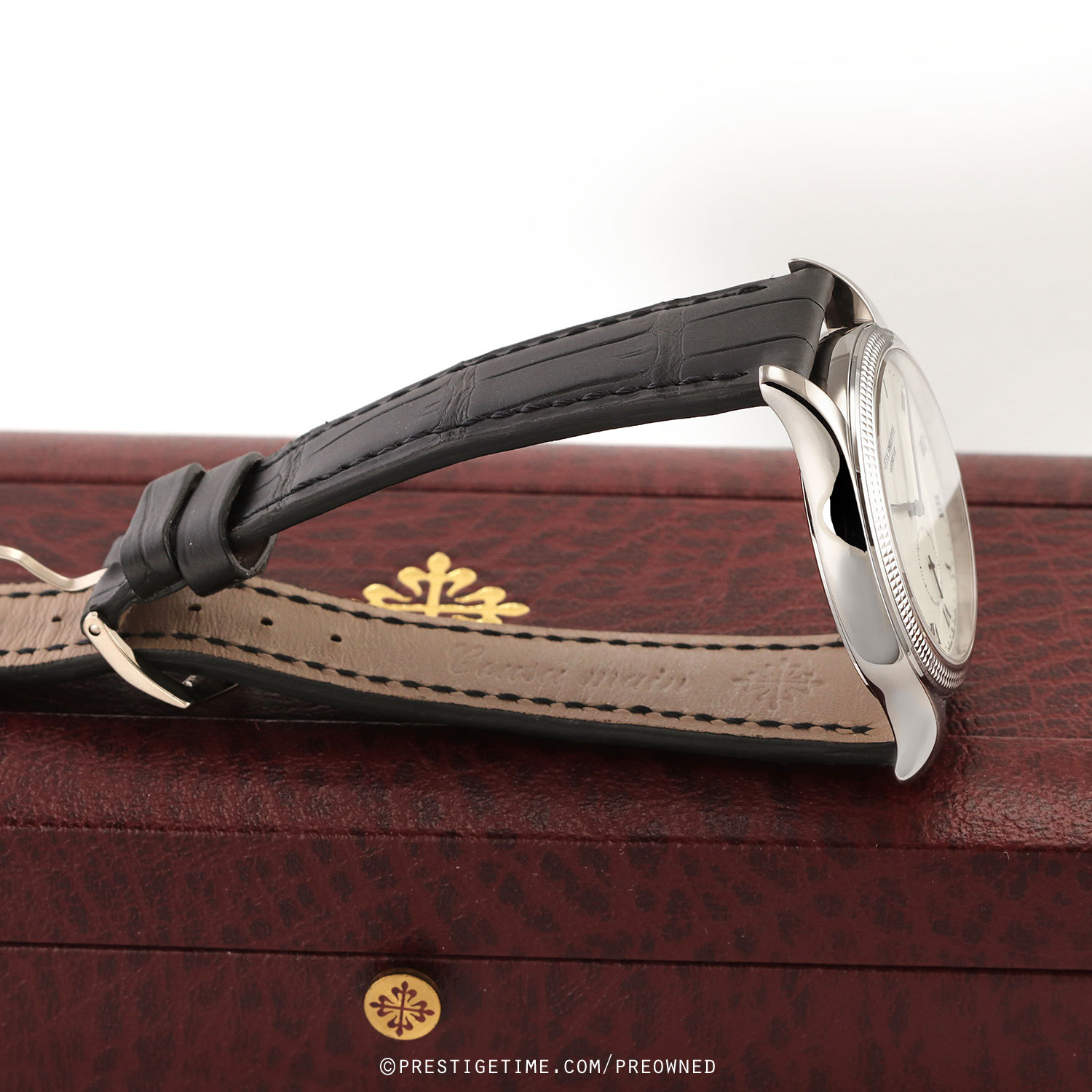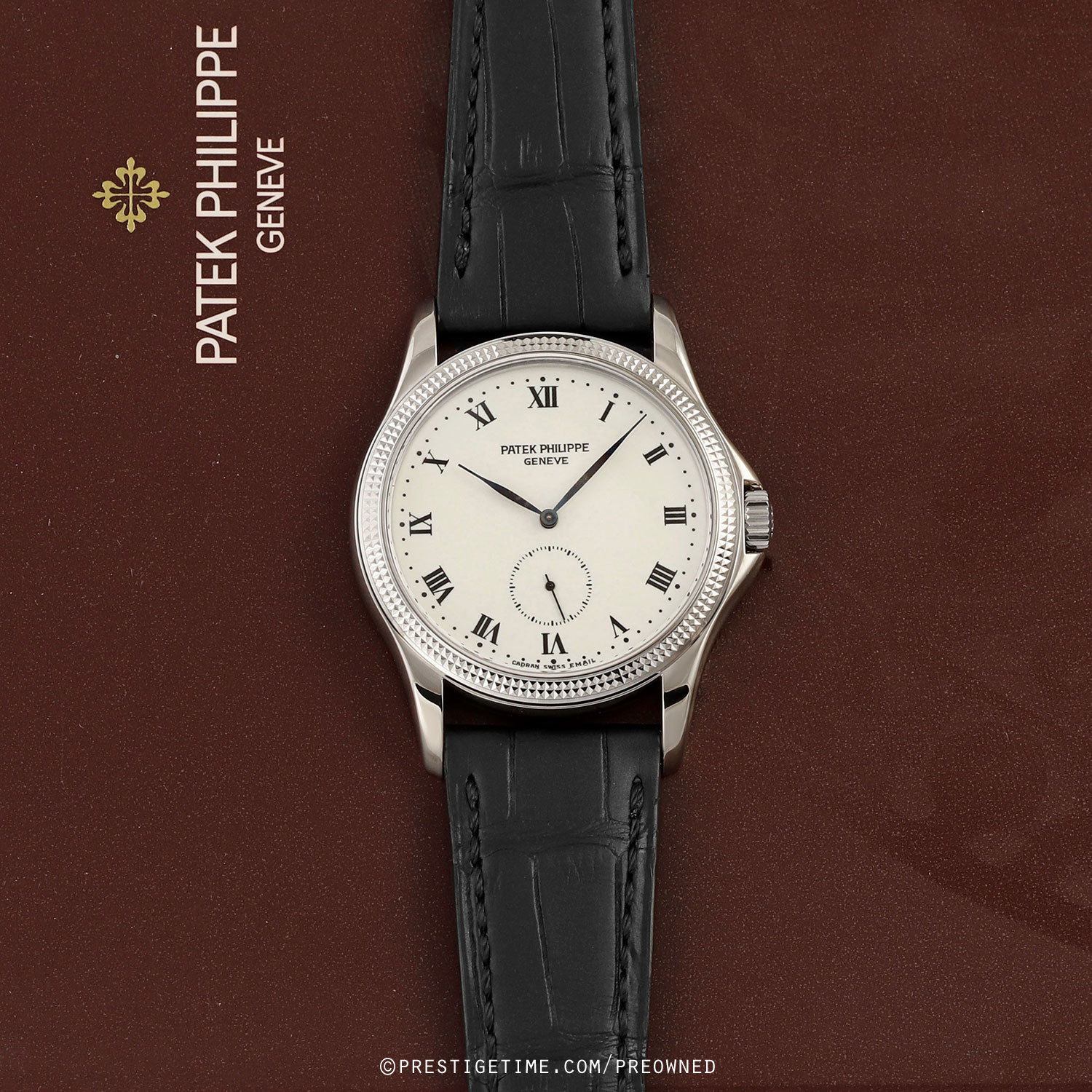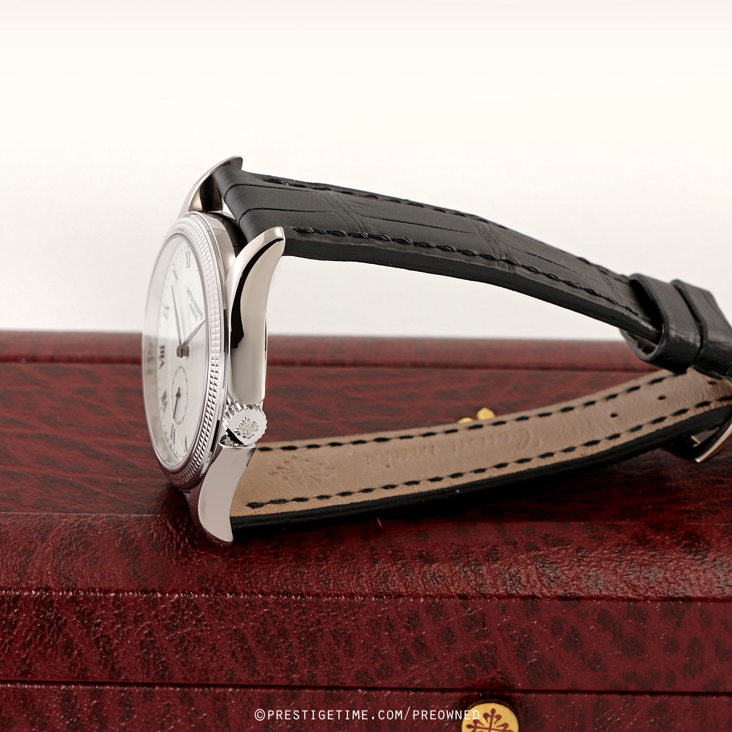 Case: Polished 18kt white gold case featuring Pateks iconic hobnail bezel. Off-white (cream) colored enamel dial. Black printed Roman numeral hour markers. Fine printed minute & seconds tracks. Blackened white gold hands.