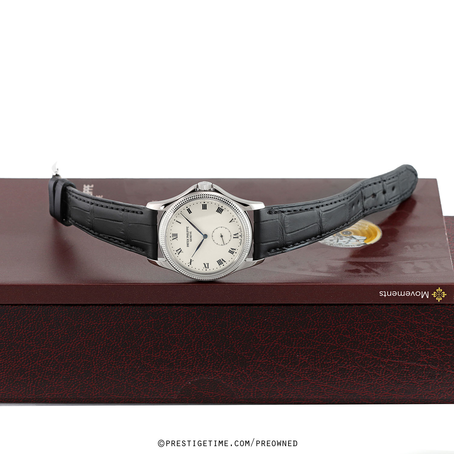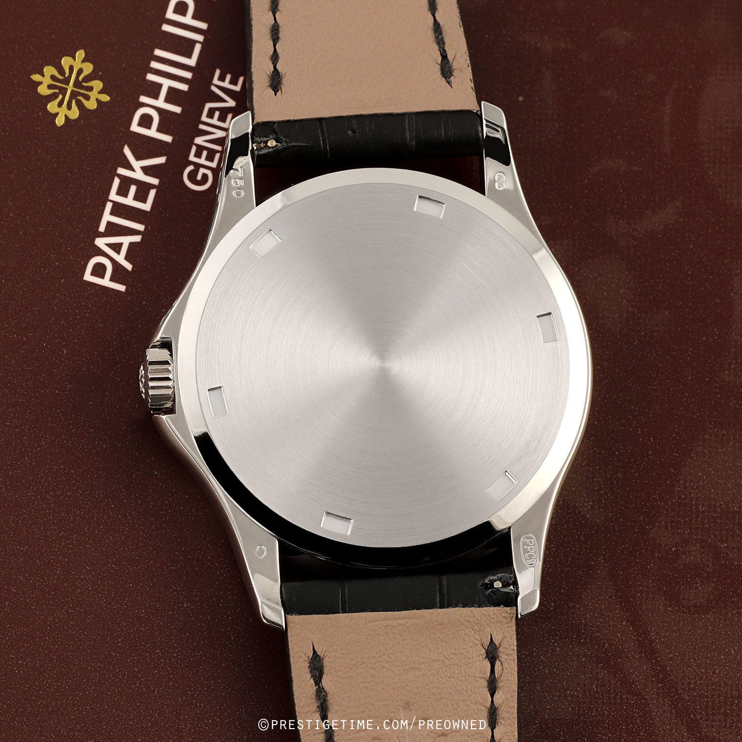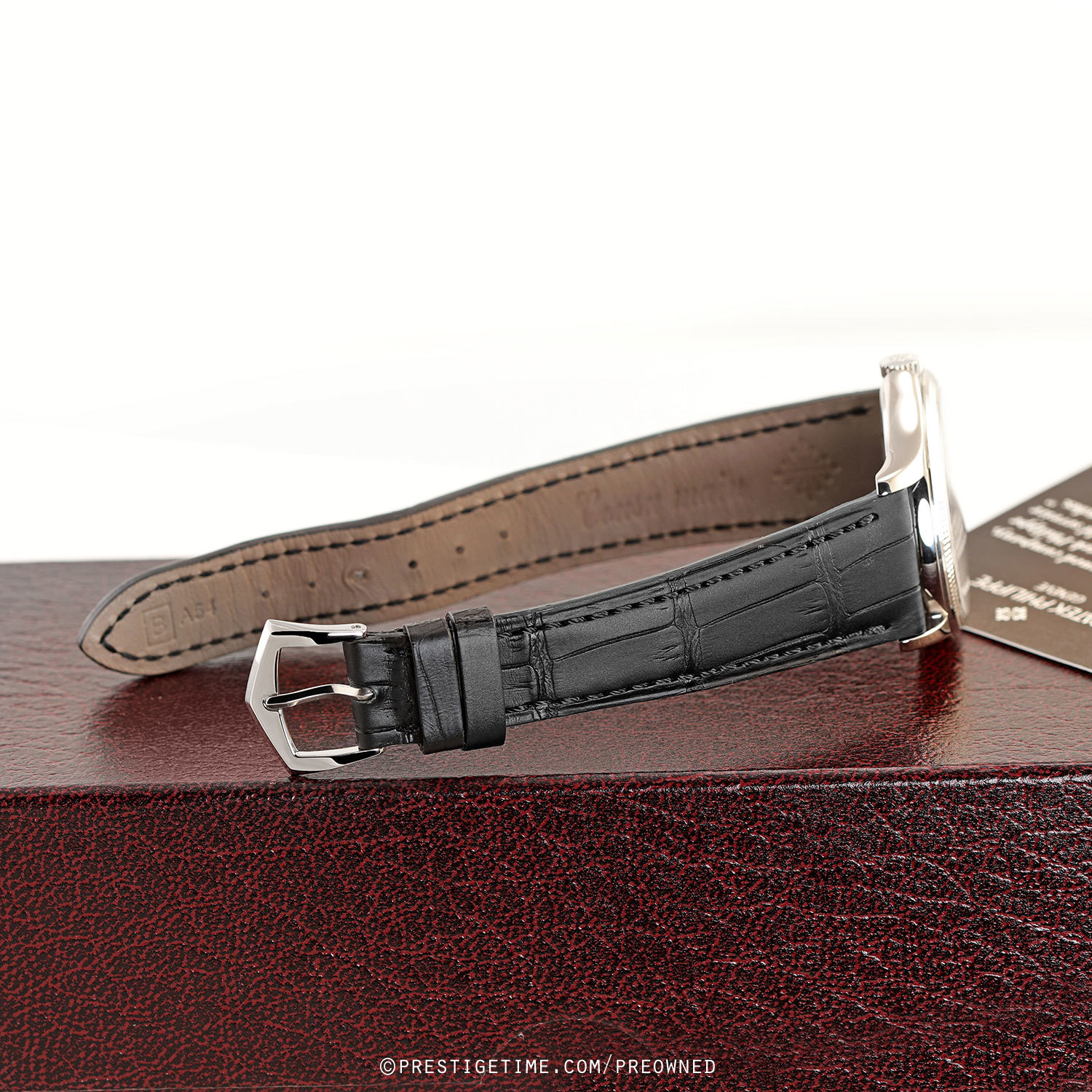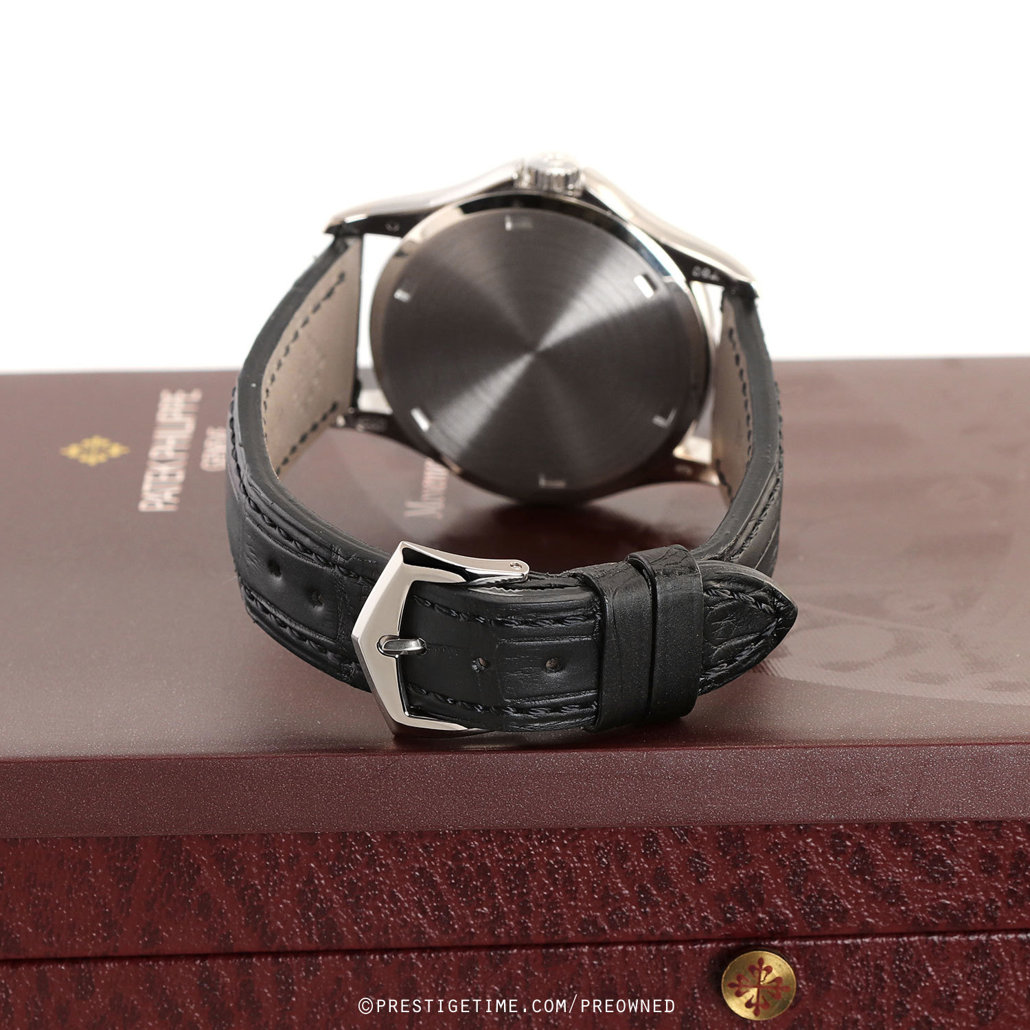 Strap: Fitted on a relatively new Patek Philippe original matte black alligator leather strap with a solid 18kt white gold tang buckle. The strap has been worn a handful of ties at most, it remains in excellent near-new condition with its full wear lifespan remaining. We would rate the strap in 99% condition.