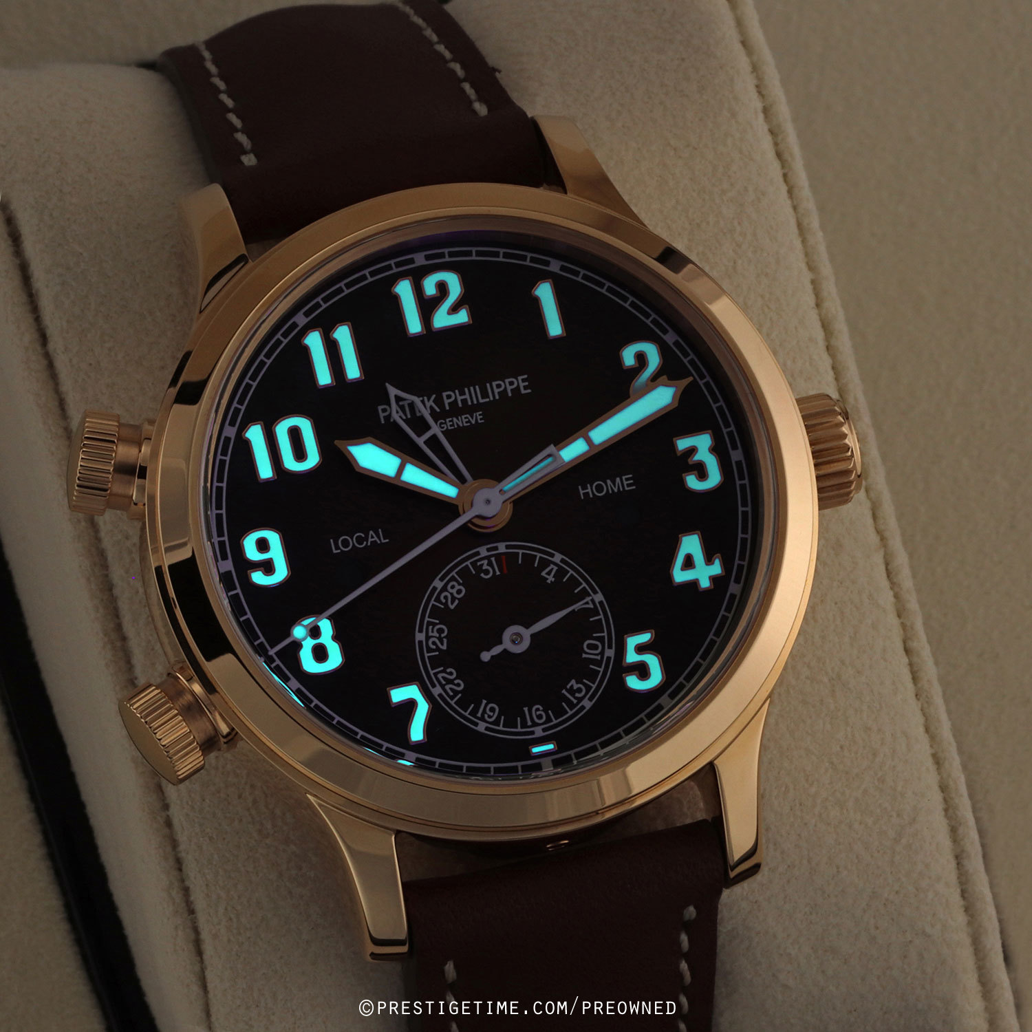 Case: Polished 18kt rose gold case. Graduated chocolate brown to black dial with a very fine sunray finish. Polished rose gold hour & minute hands with luminous fill. White central seconds & GMT hands. Applied polished rose gold numeral hour markers with luminous fill. Fine printed minutes/seconds track. Date sub-dial at 6 o'clock.