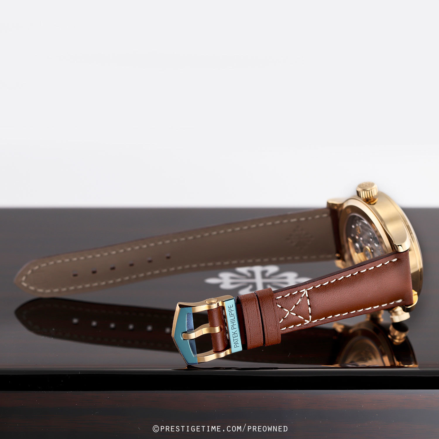Strap: Fitted with its Patek original brown calfskin strap with white stitching & a polished 18kt rose gold tang buckle. The strap is unworn & crisp, in new condition.